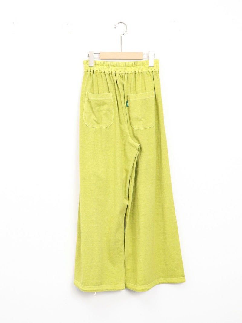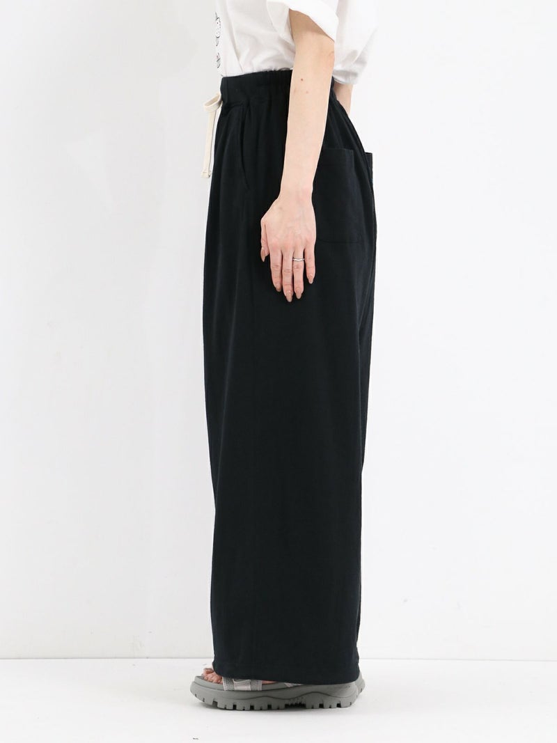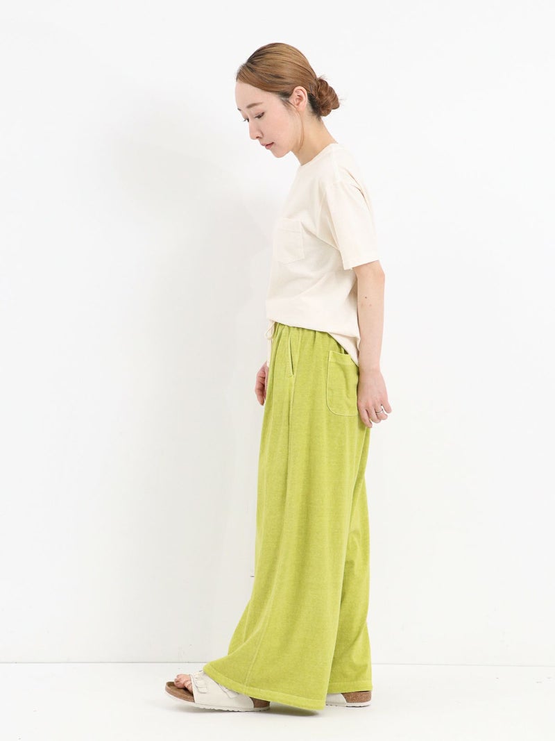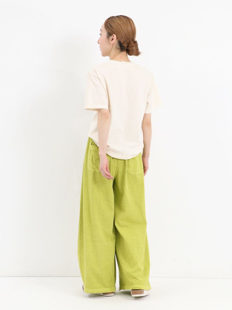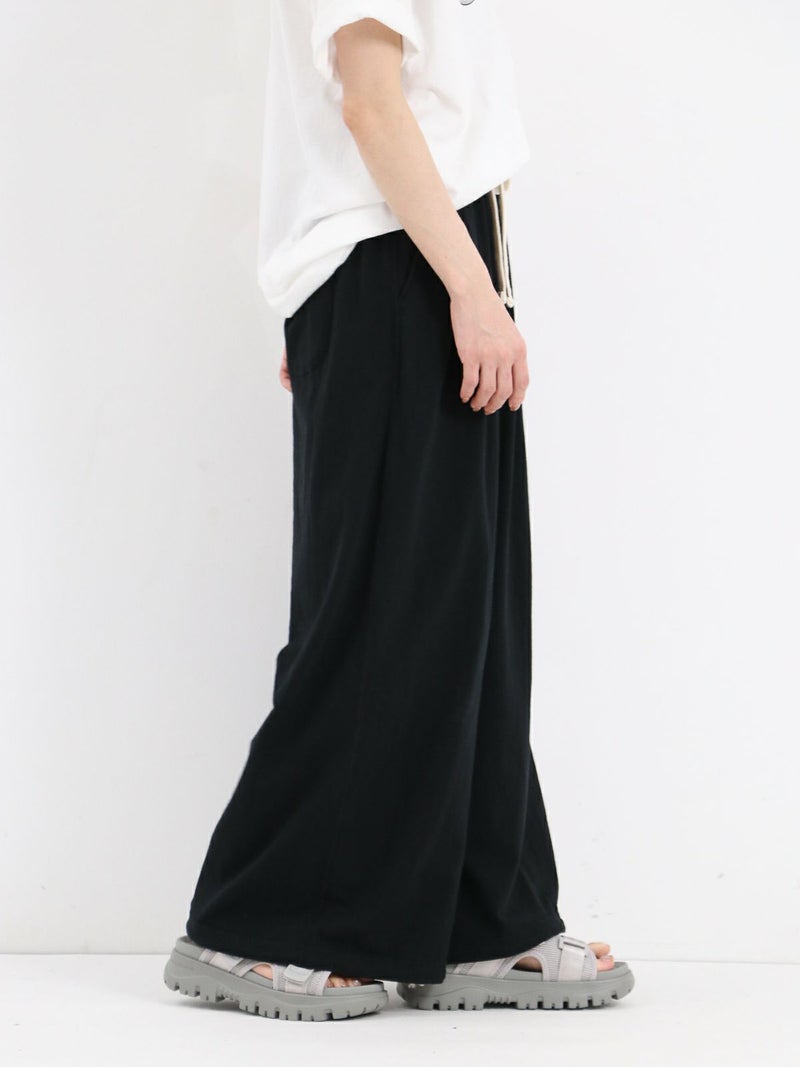 Tシャツ生地を使用したカジュアルなARABIAN WIDE PANTS。 コットン100% 5.5オンスジャージ生地の持つカジュアル感と柔らかな雰囲気、製品染め特有の風合い感を生かして、シンプルに仕上げたリラックスパンツです。裾のドローコードを絞らずにワイドパンツとして、裾を絞りエスニックパンツとして、合わせるトップスによってスタイルを使い分けることができる2way仕様となっています。アーバン、リゾート、デイリーなど様々なシーンで程良いアクティブさとリラックス感を演出してくれる一着です。
