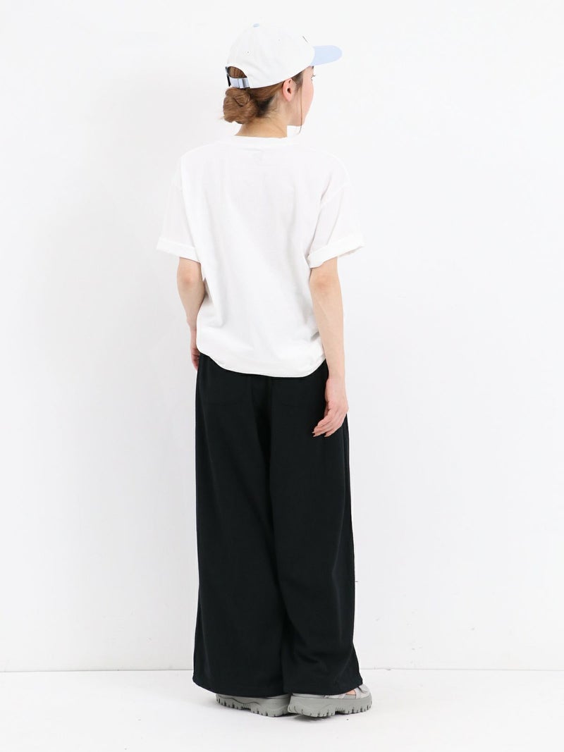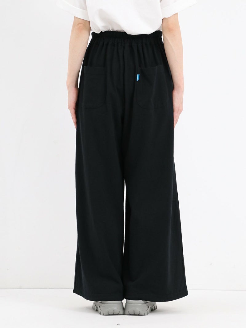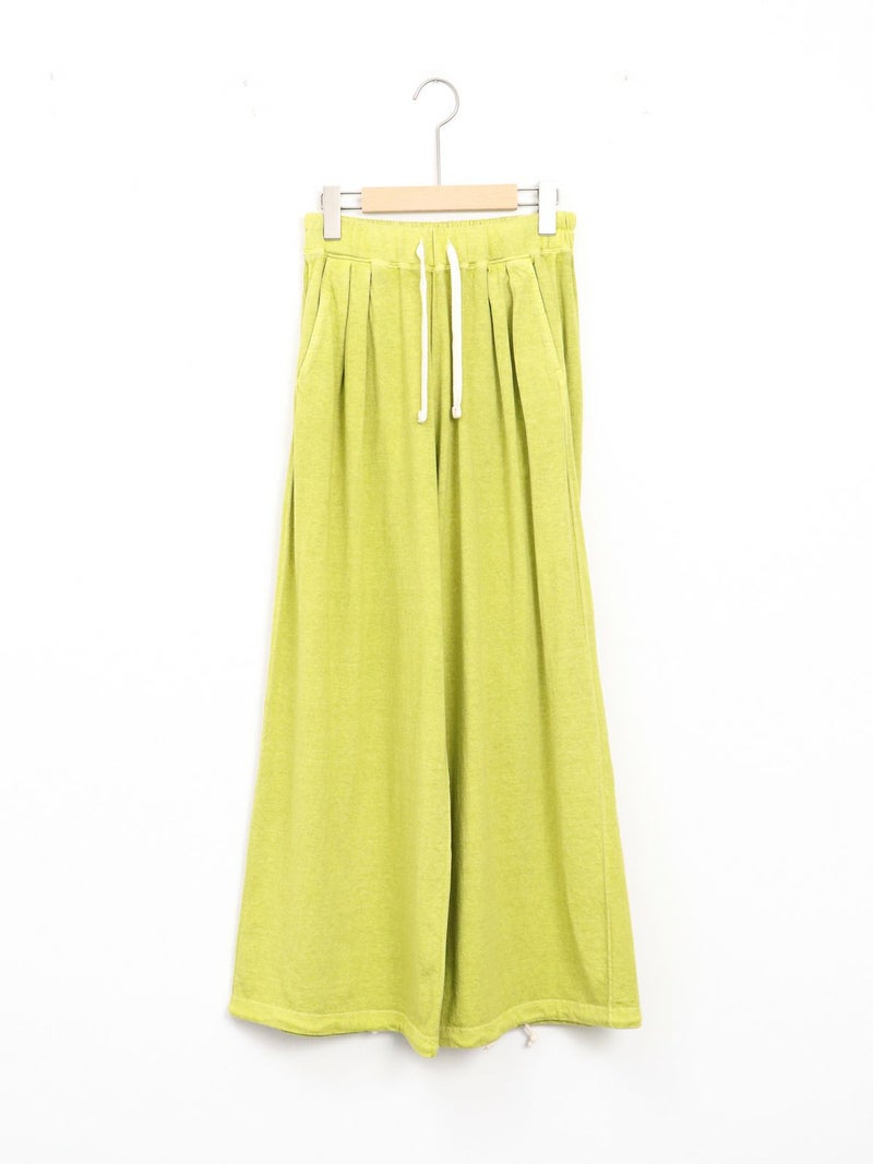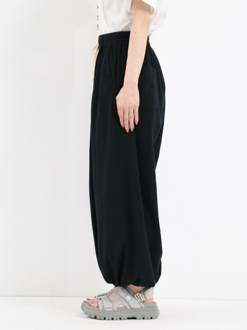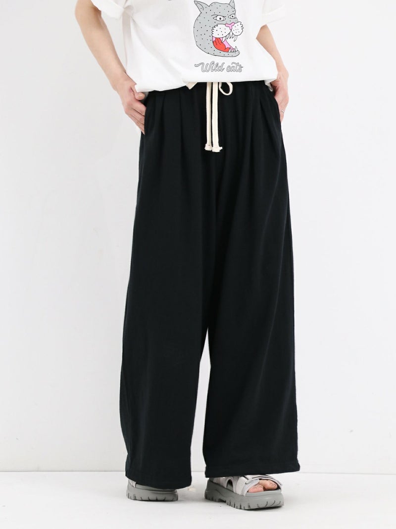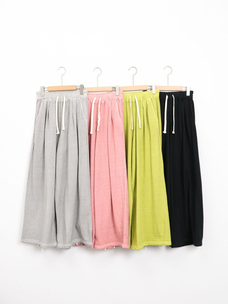 Tシャツ生地を使用したカジュアルなARABIAN WIDE PANTS。 コットン100% 5.5オンスジャージ生地の持つカジュアル感と柔らかな雰囲気、製品染め特有の風合い感を生かして、シンプルに仕上げたリラックスパンツです。裾のドローコードを絞らずにワイドパンツとして、裾を絞りエスニックパンツとして、合わせるトップスによってスタイルを使い分けることができる2way仕様となっています。アーバン、リゾート、デイリーなど様々なシーンで程良いアクティブさとリラックス感を演出してくれる一着です。