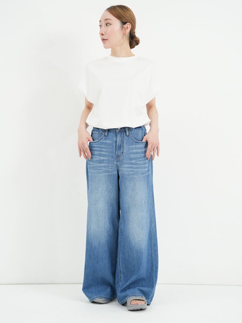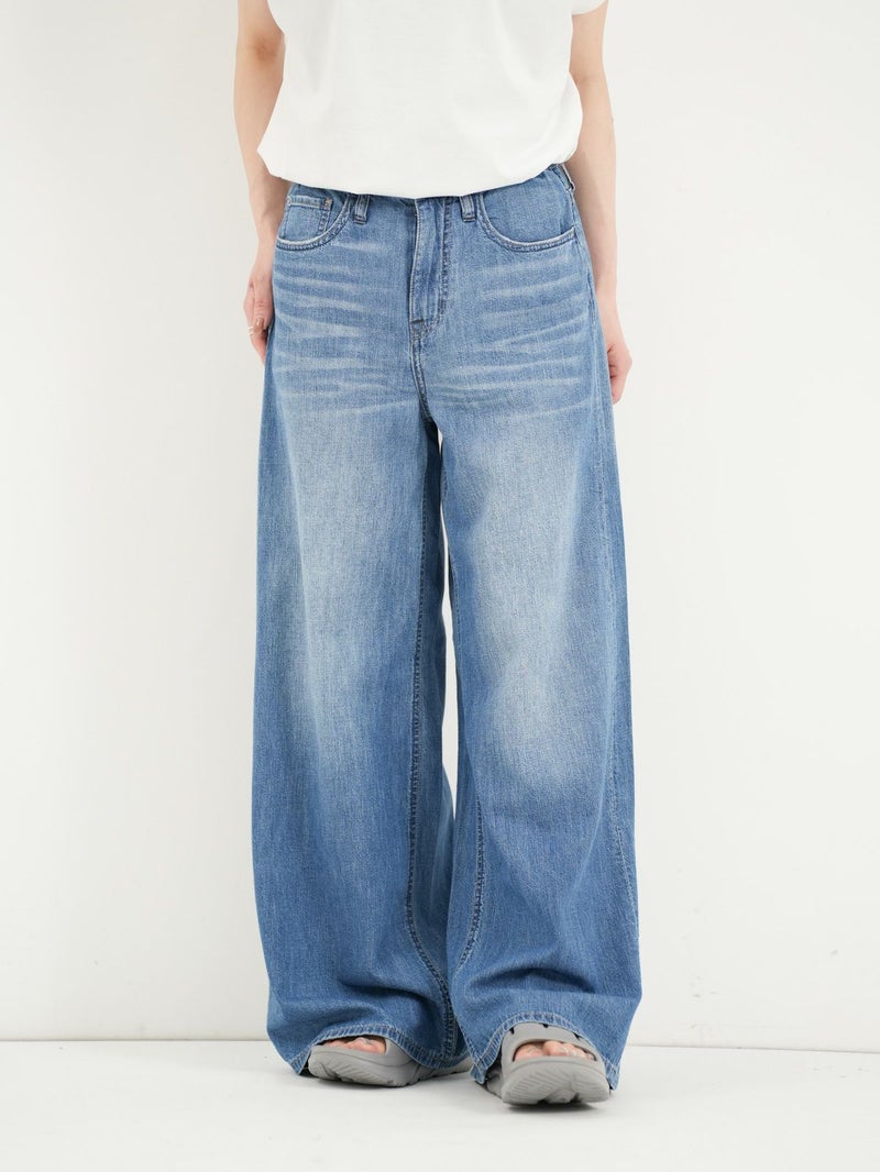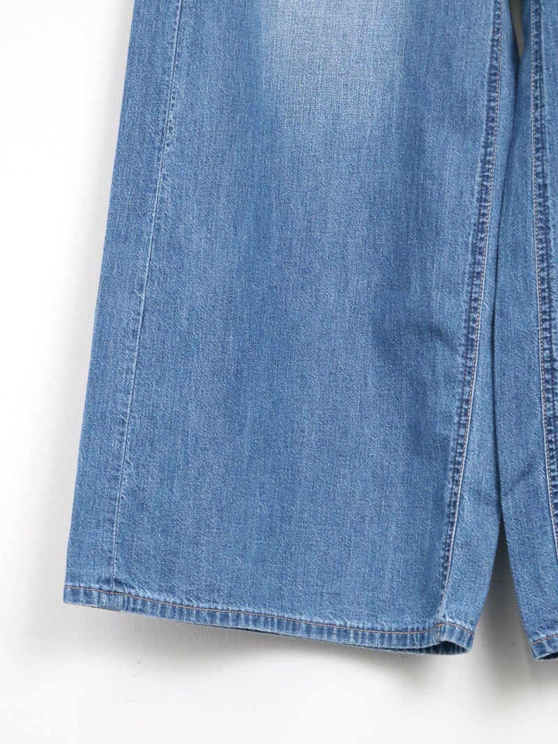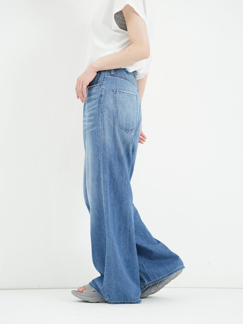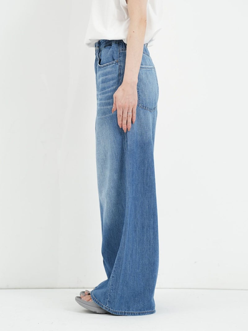暑い時期でも快適に着用できるWild Ginger Easy。 シャツ生地に変更し、ウエストのサイドにゴムを入れたイージーパンツ仕様。生地はライトオンスの綿100%デニム使用。洗い後にシボ感が出て、カジュアルな表情が生まれます。プリントTシャツで夏らしくカジュアルに合わせるだけでコーディネートのポイントになります。