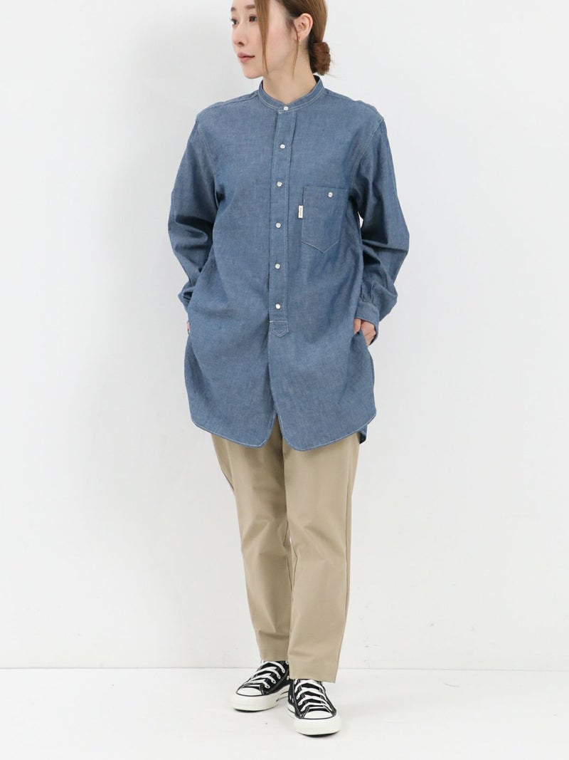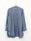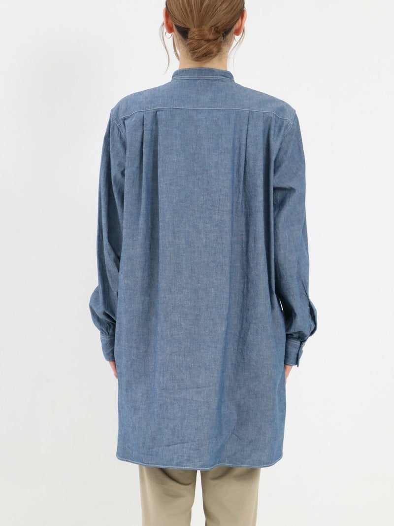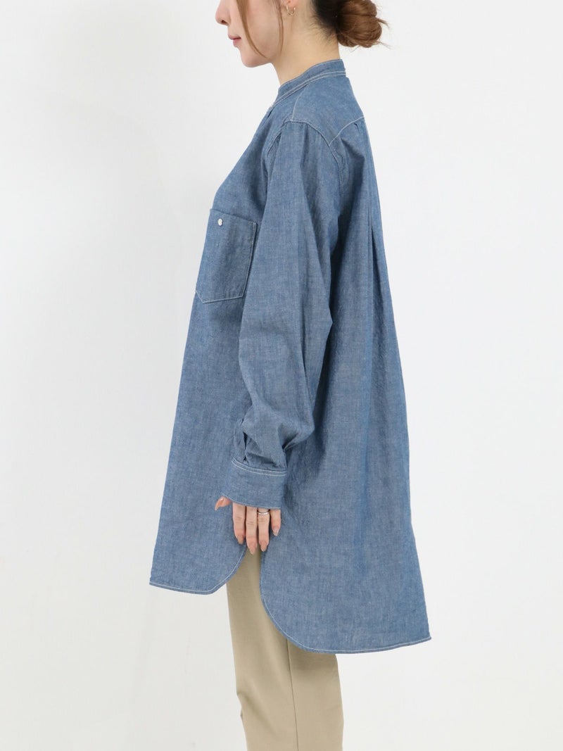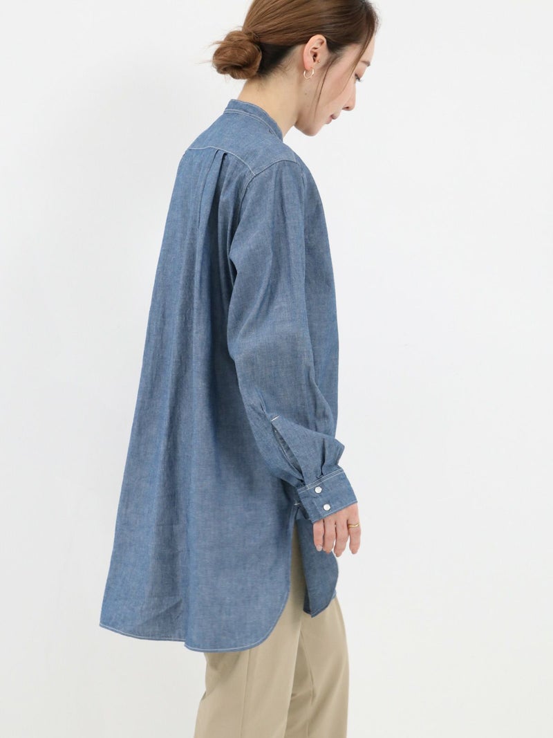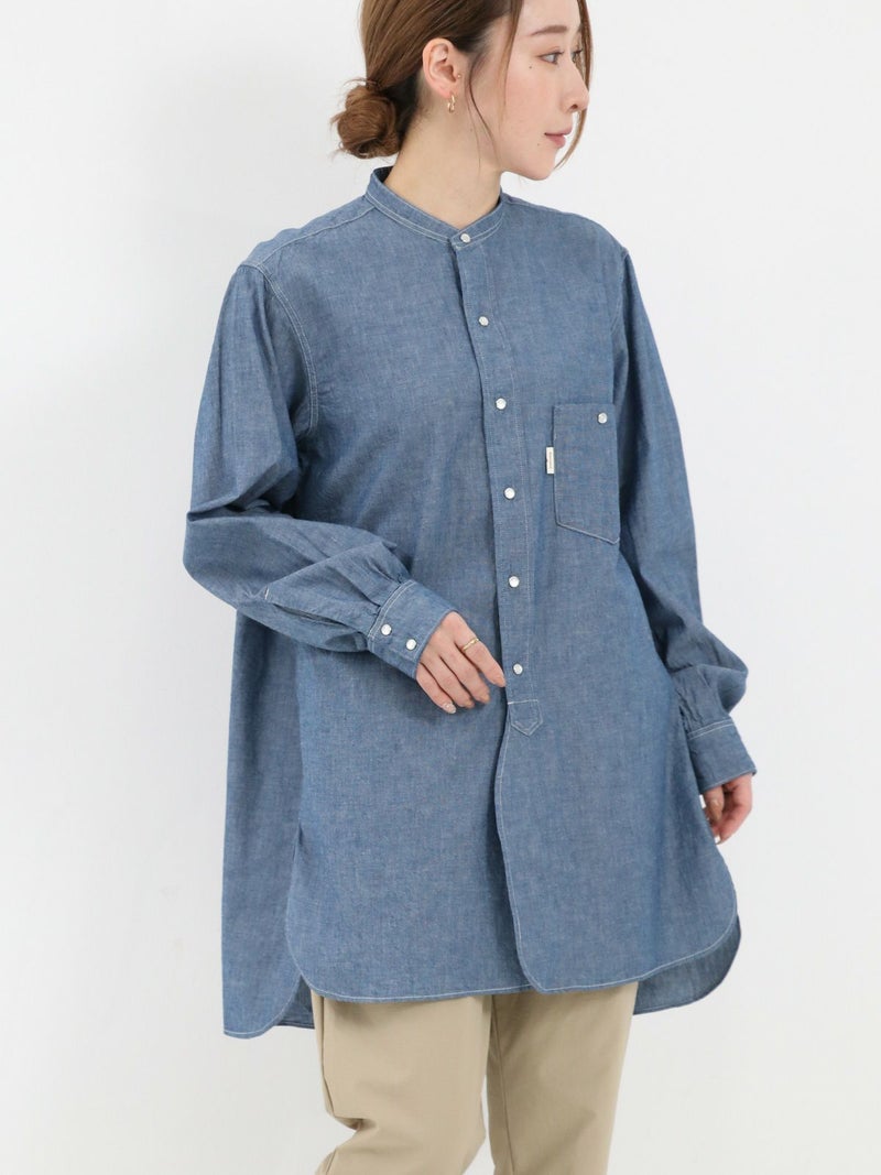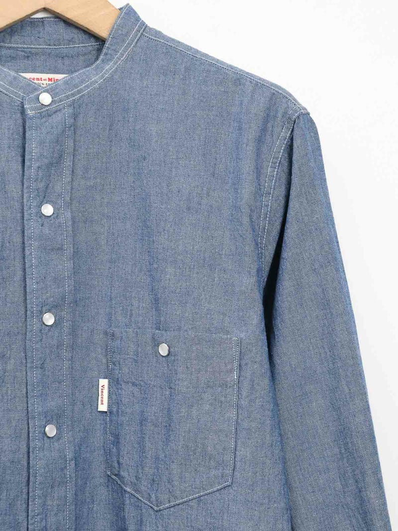 VincenetMireilleのシャンブレーマオカラーシャツ。 柔らかい綿100%の素材、程よくゆとりのあるデザイン。1枚ではもちろん、長さがあるので前を開けて羽織りとしても着回しがききます。スナップボタンで着脱も楽ちんです。