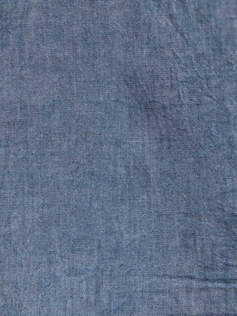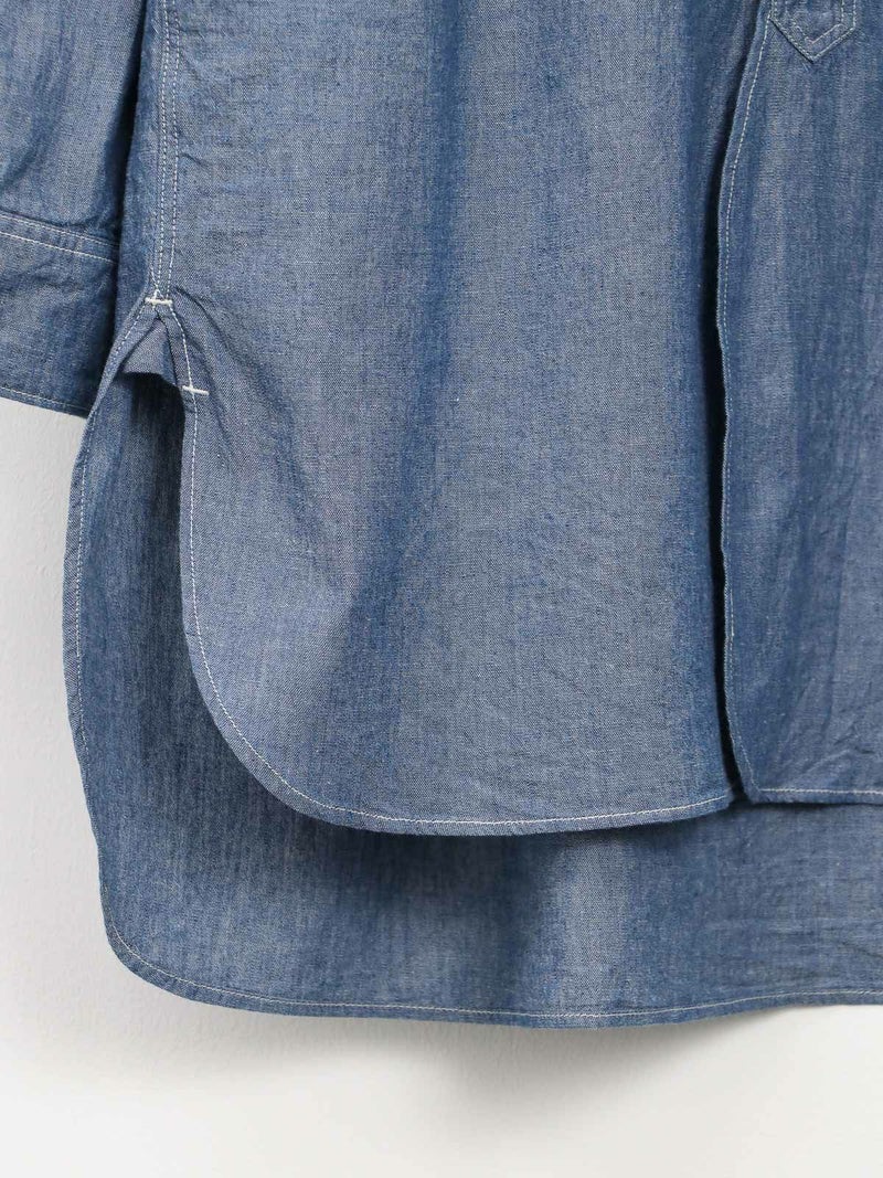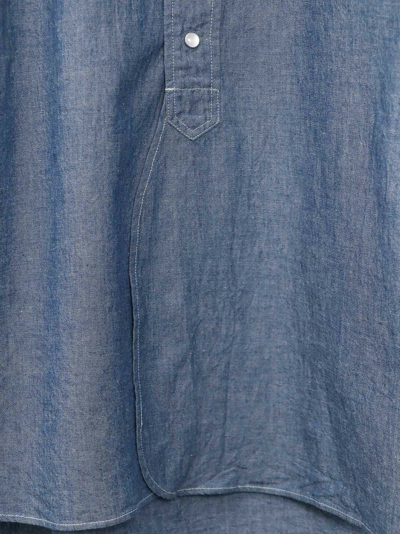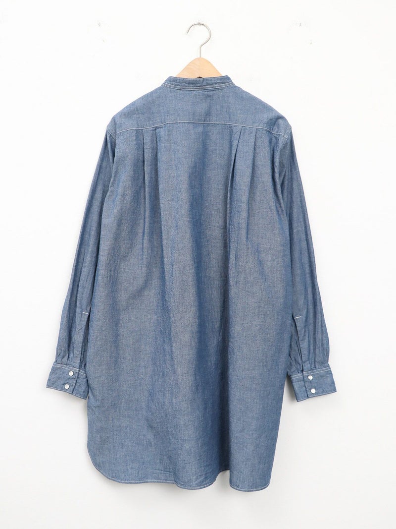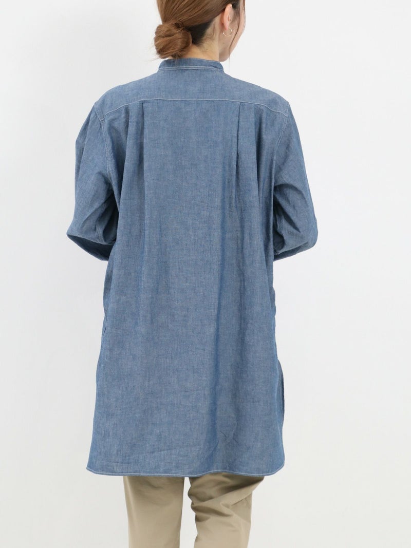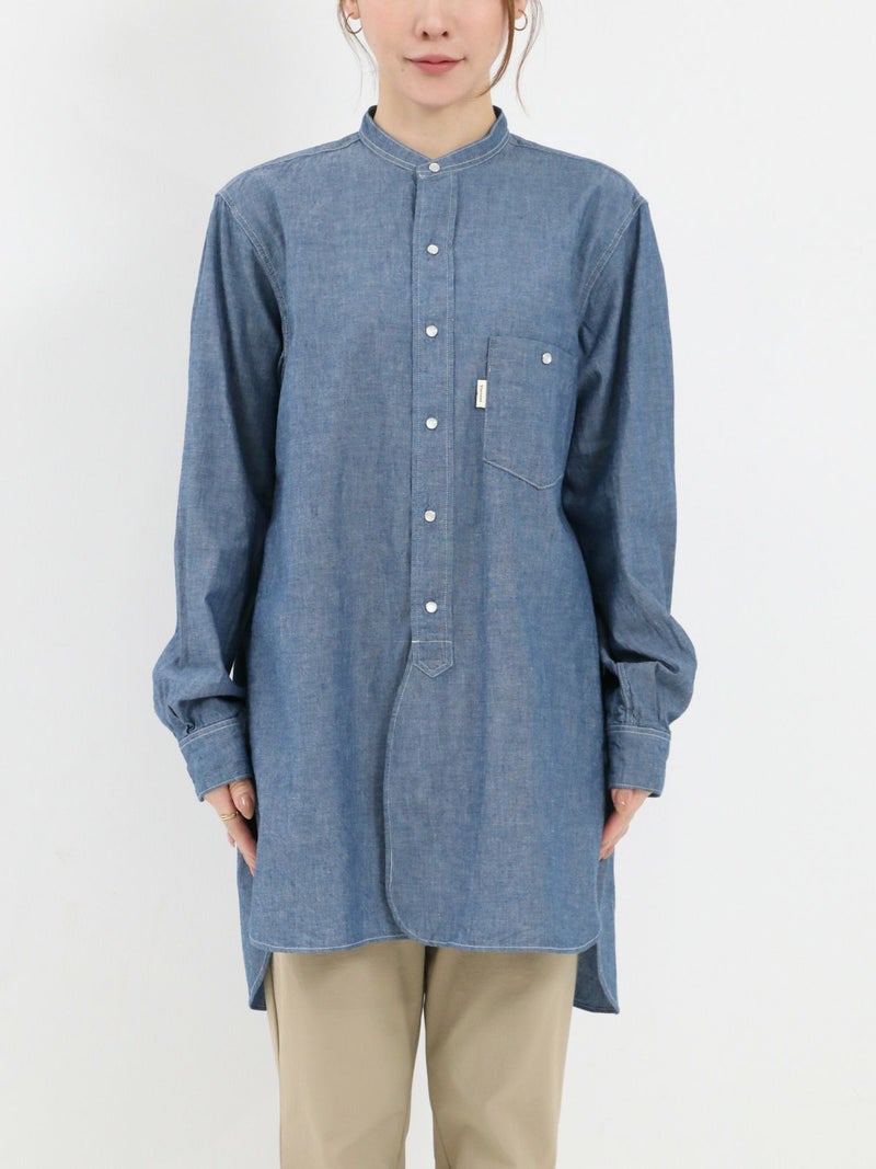 VincenetMireilleのシャンブレーマオカラーシャツ。 柔らかい綿100%の素材、程よくゆとりのあるデザイン。1枚ではもちろん、長さがあるので前を開けて羽織りとしても着回しがききます。スナップボタンで着脱も楽ちんです。