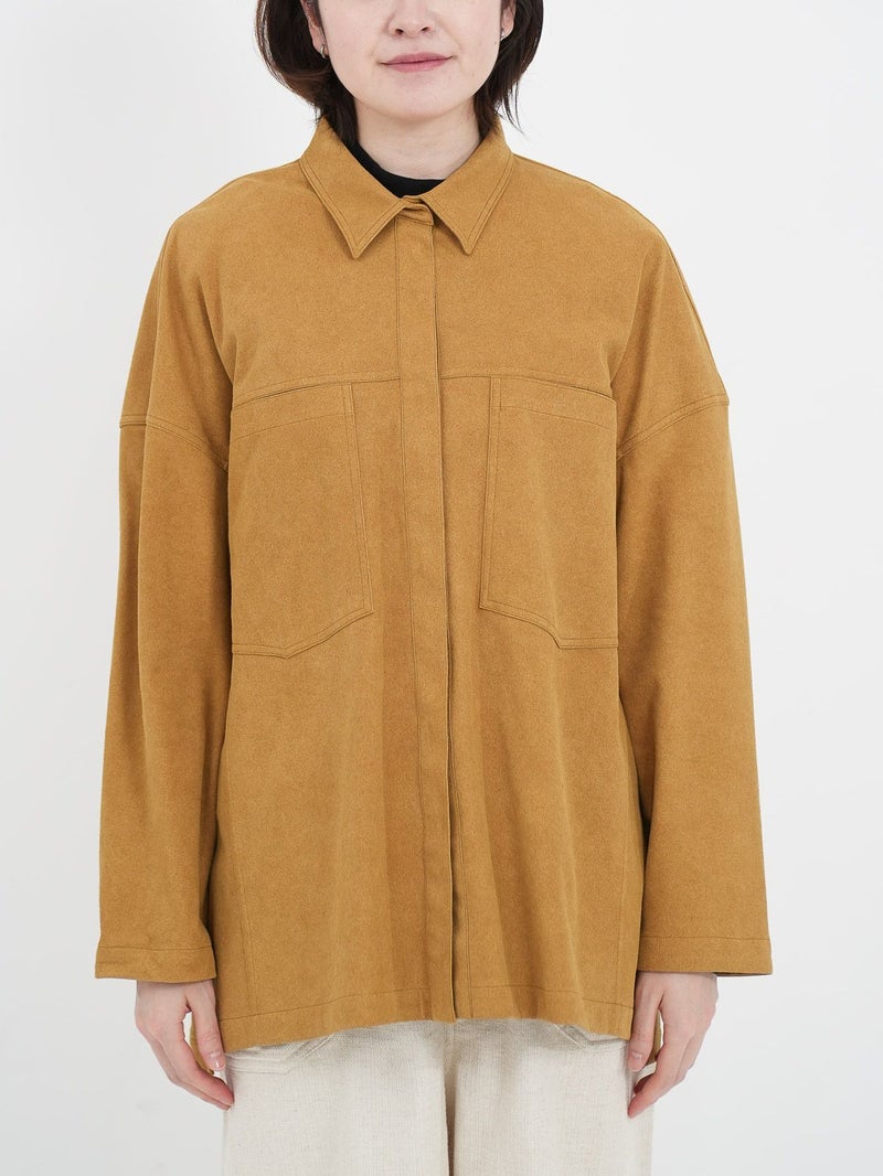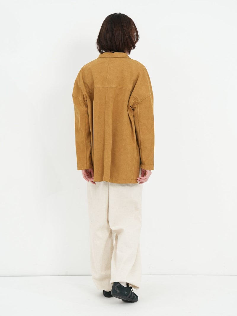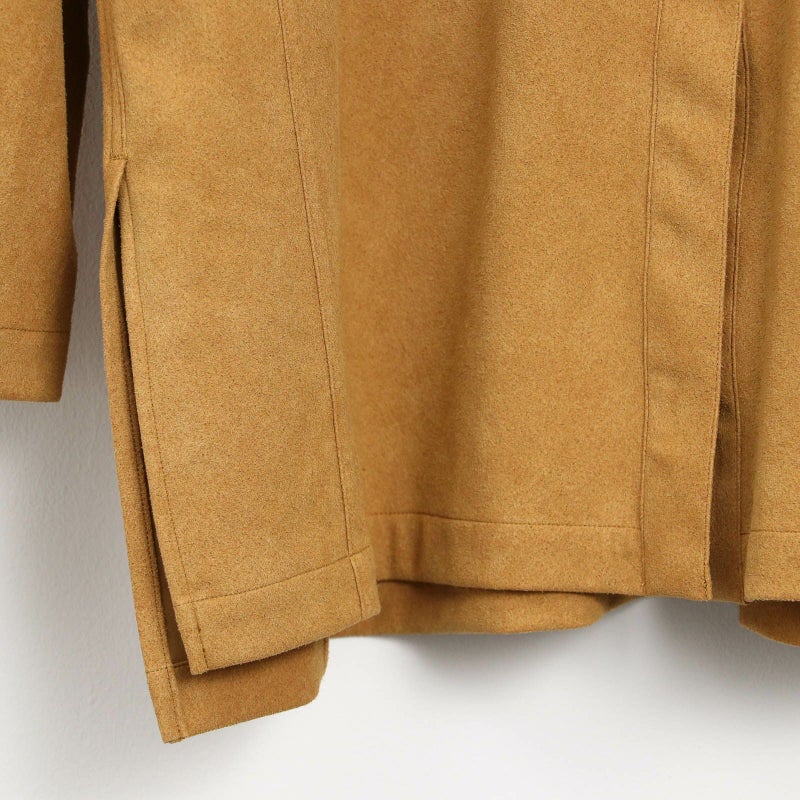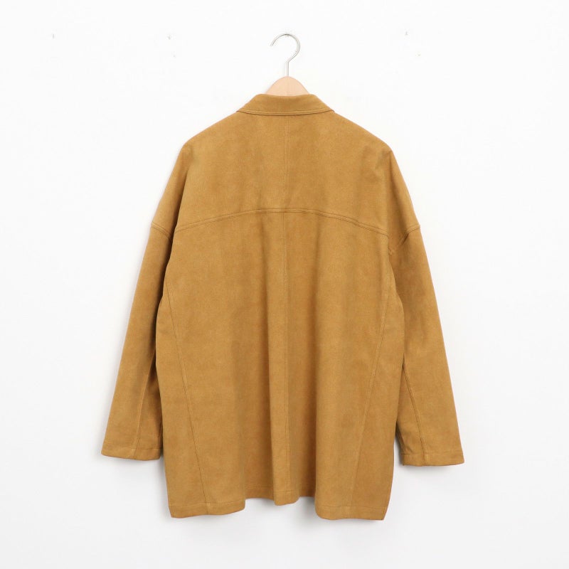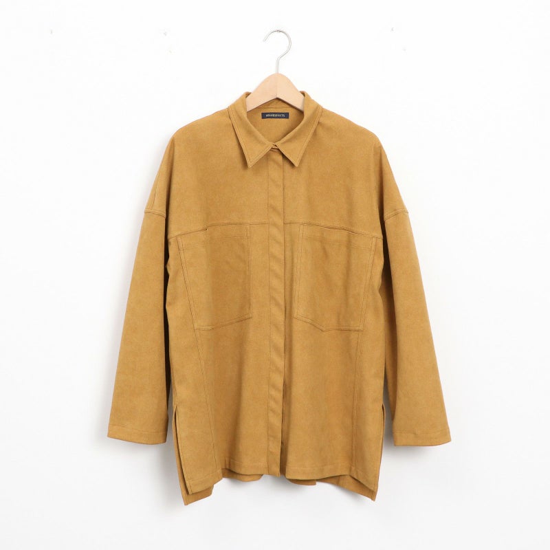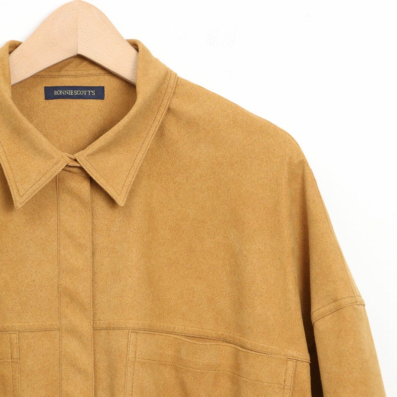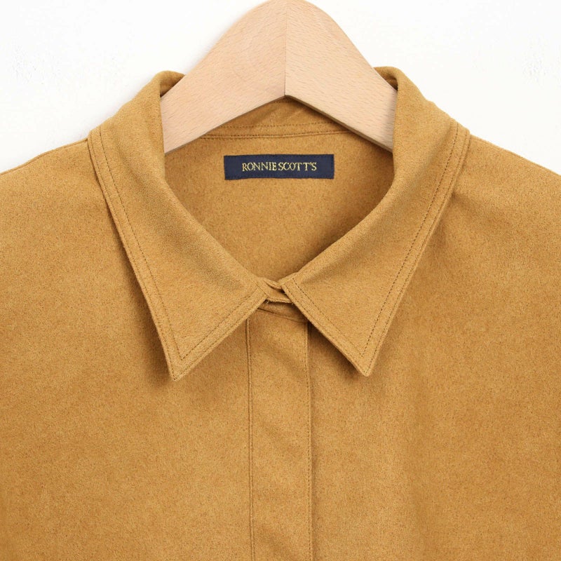 超極細繊維を使い、より本革タッチのRONNIE SCOTT'Sオリジナルスウェードシャツ。 程よくオーバーでヒップが隠れるサイズ感。柔らかさもありつつ、立体的に作られたフォルムは体に張り付きにくく、袖にもゆとりがあり、インナーも着やすいです。あえて裾のカットを直線的にしジャケットとしても、シャツとして着ても成立するのがポイント。シーズンレスで着られるのも嬉しい一枚。