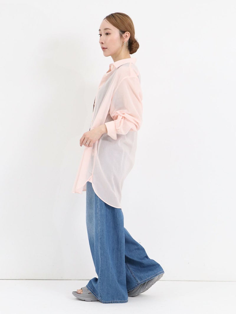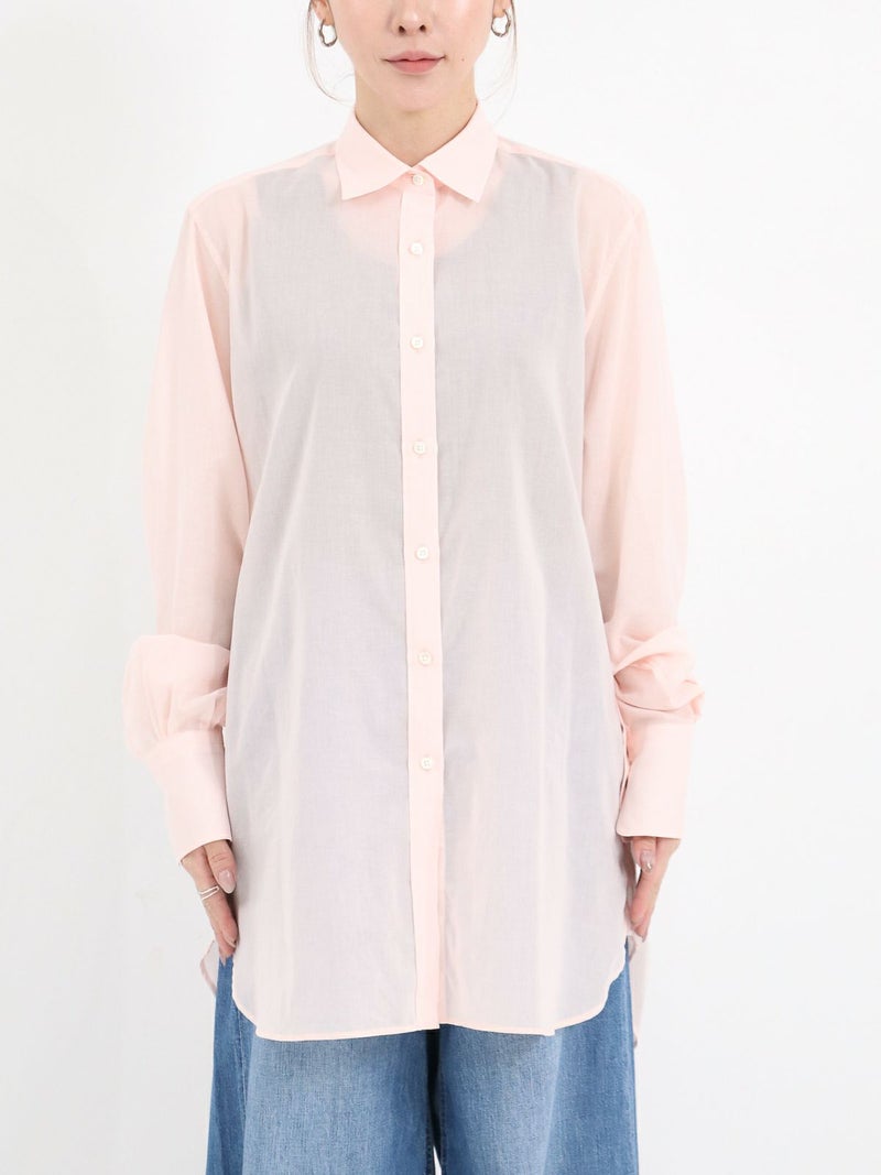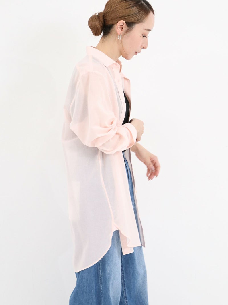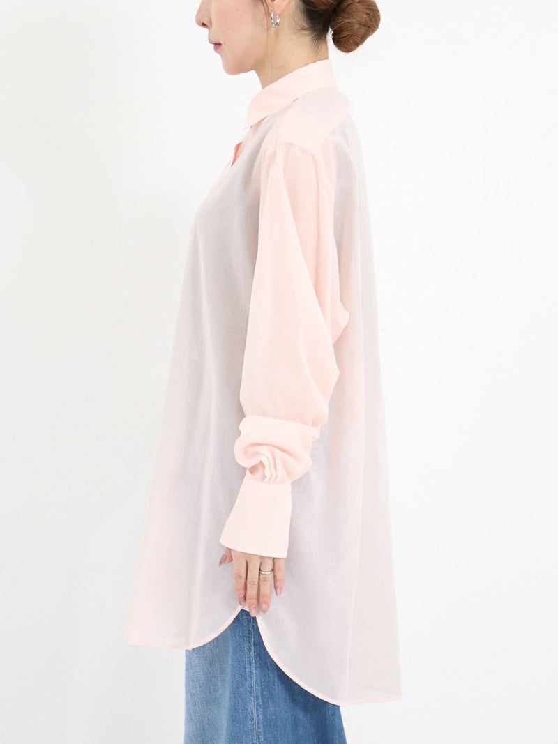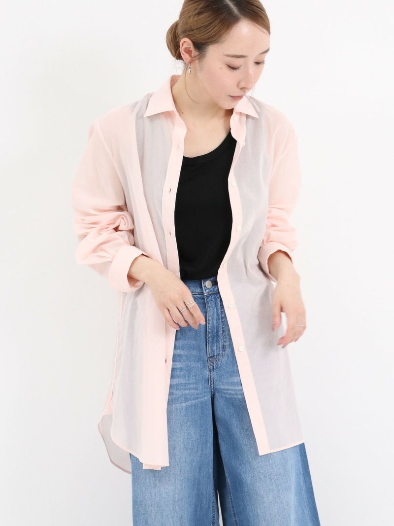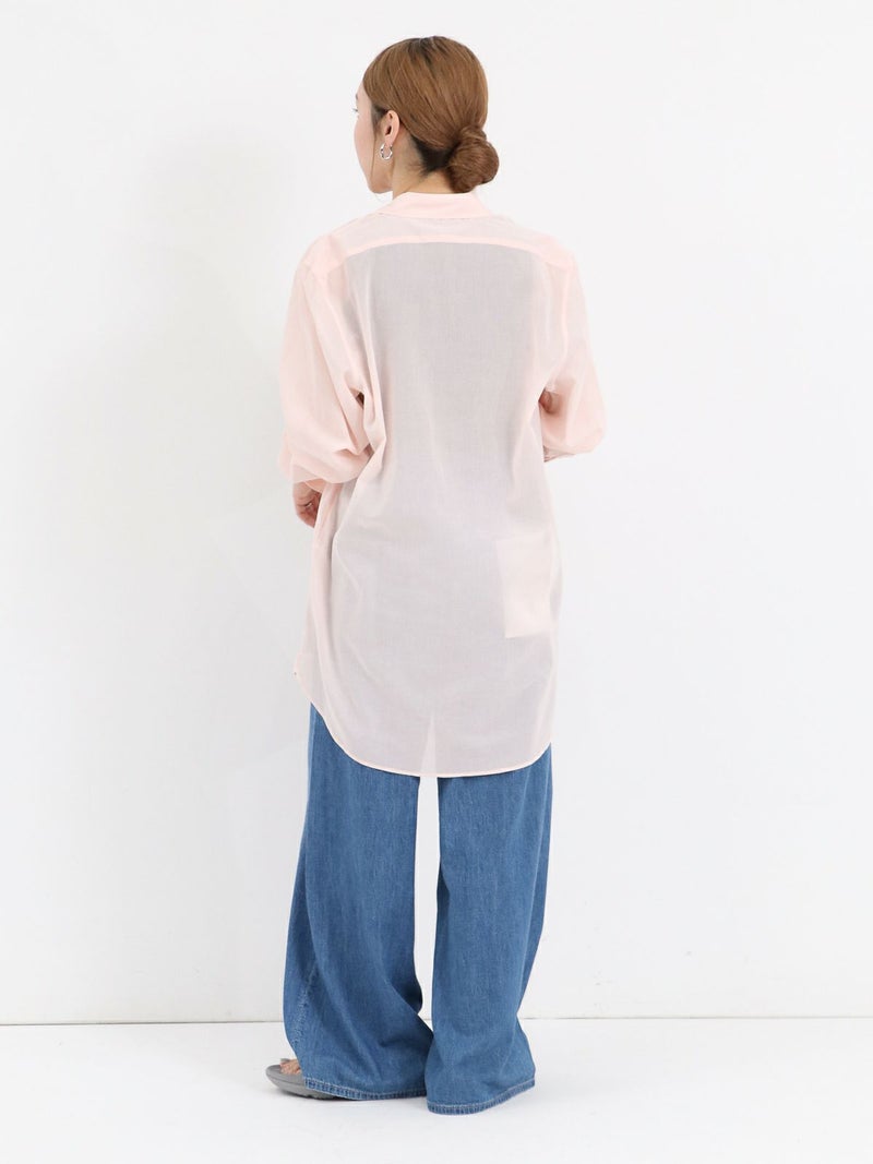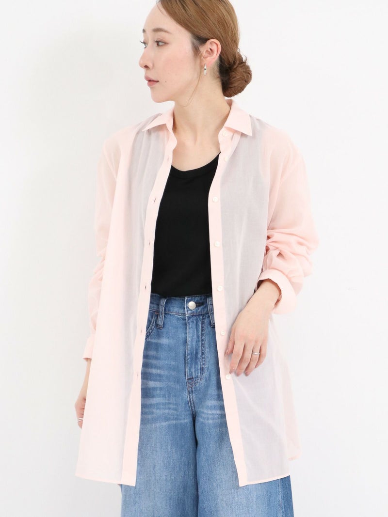 通気性がよく清涼感のあるコットンボイル素材のシアーシャツ。 程よい透け感とシャリ感が特徴です。一見シンプルですが前後で違う着丈の長さや袖口のギャザーの入りや膨らみ具合等々拘りの詰まった1枚です。