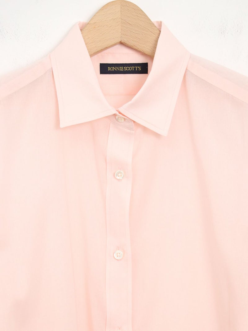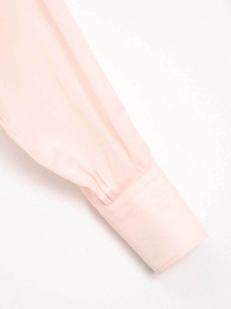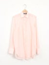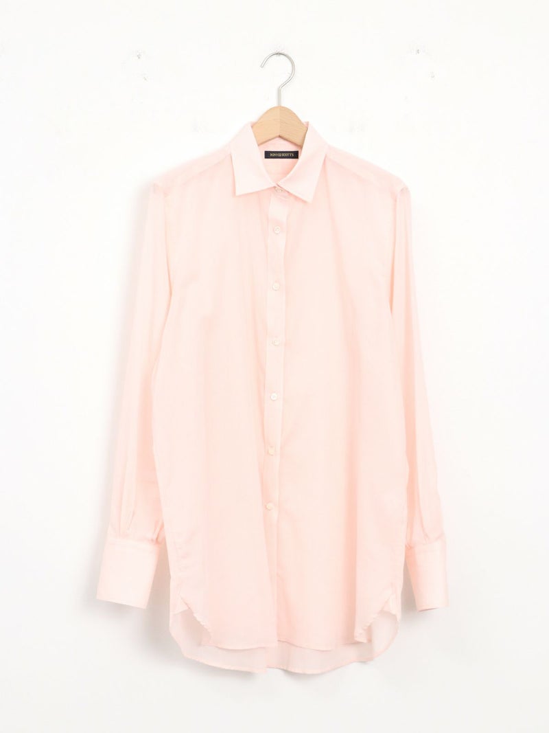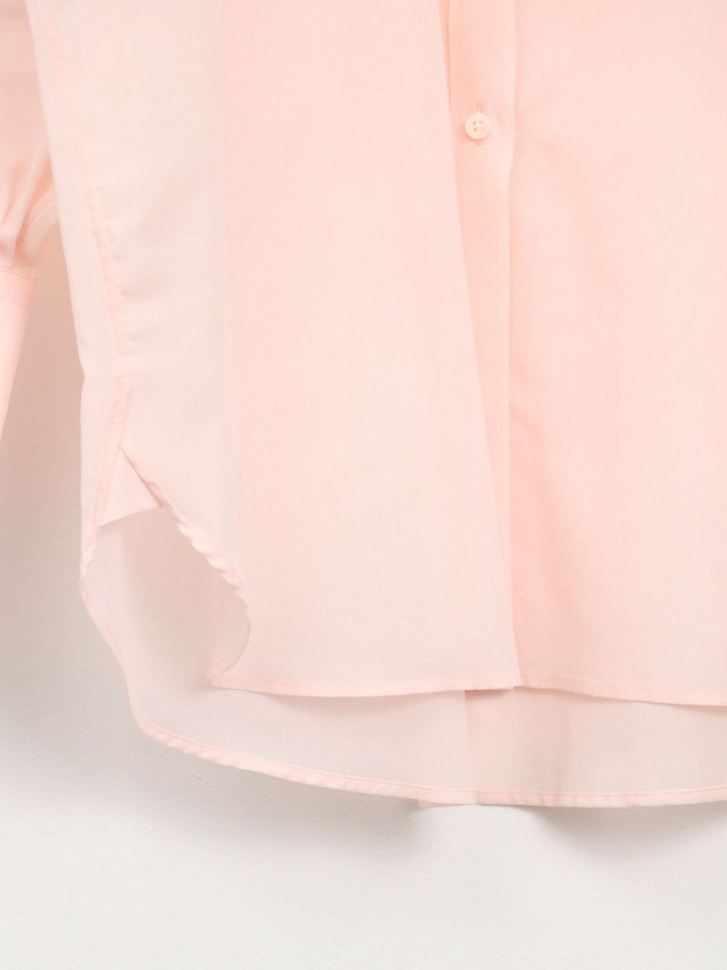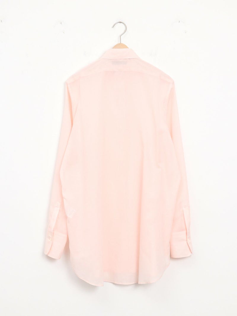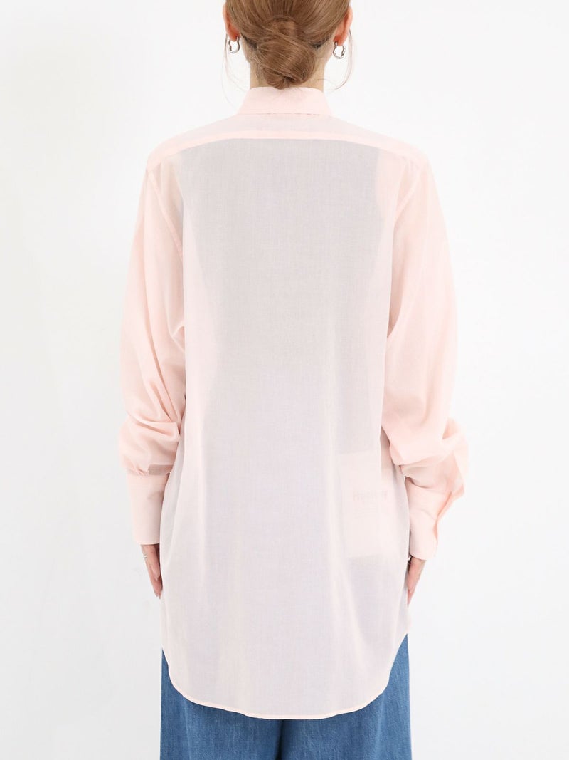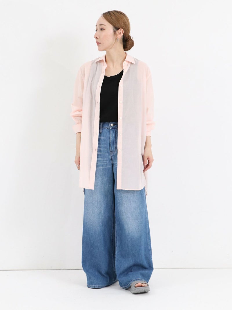 通気性がよく清涼感のあるコットンボイル素材のシアーシャツ。 程よい透け感とシャリ感が特徴です。一見シンプルですが前後で違う着丈の長さや袖口のギャザーの入りや膨らみ具合等々拘りの詰まった1枚です。