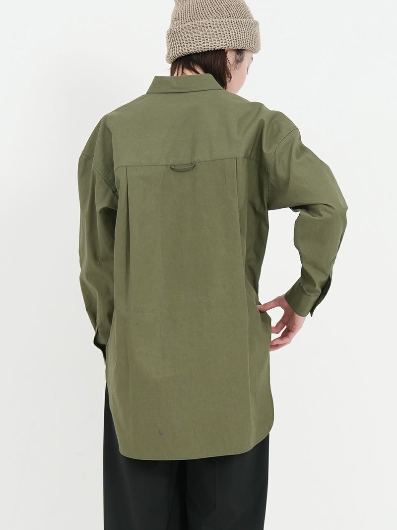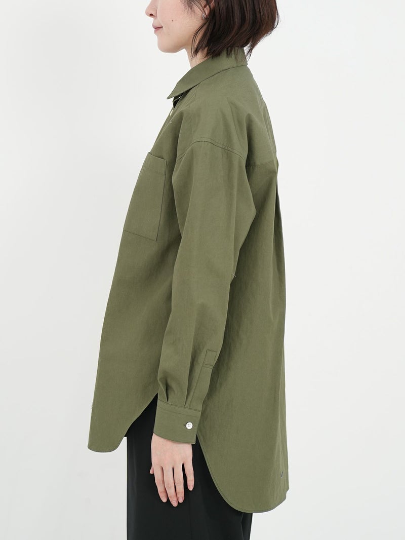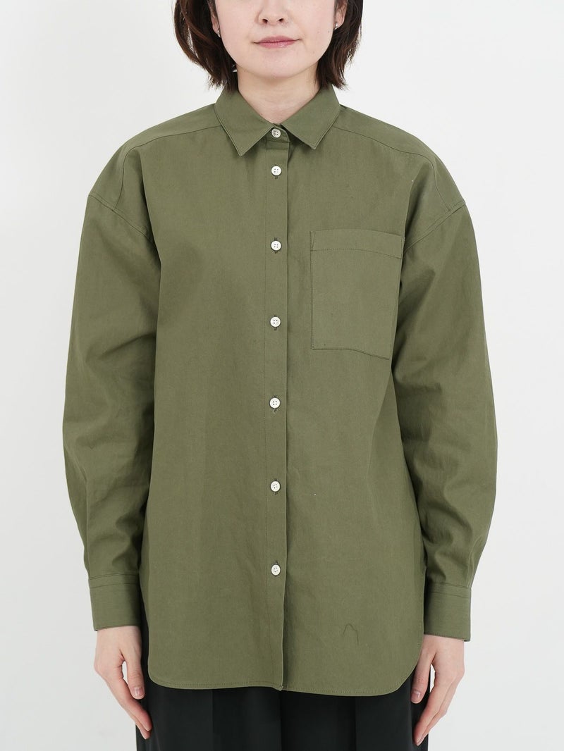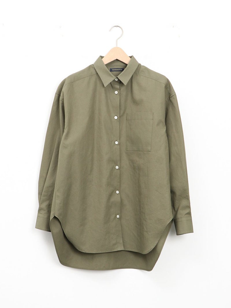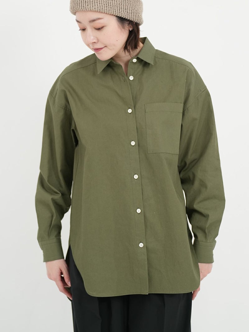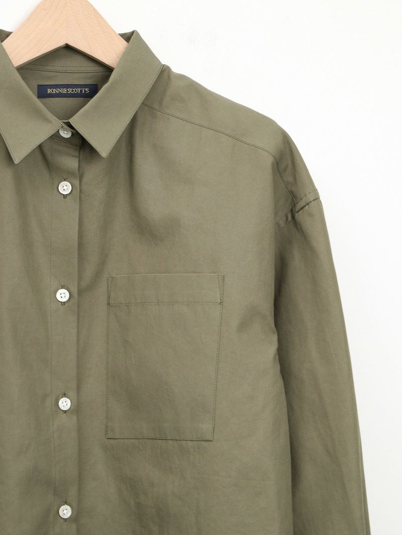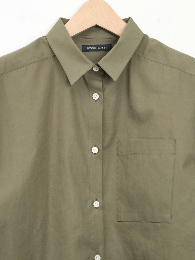 RONNIE SCOTT'S別注、程よいハリとしっとり感が魅力のヴィンテージコットンシャツ。 やや長めの丈とゆるめシルエットで大人っぽく、1枚着はもちろんレイヤードスタイルにも対応するオールシーズン活躍の一枚です。高密度生地で着込むほどに馴染み、経年変化も楽しめます。カジュアルからきれいめまで幅広く合わせやすく、大人カジュアルなコーディネートにおすすめ。
