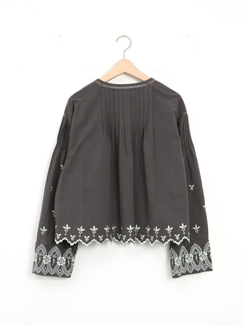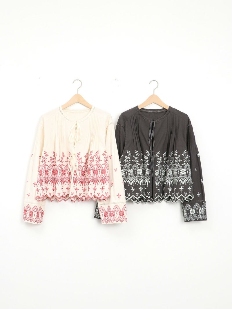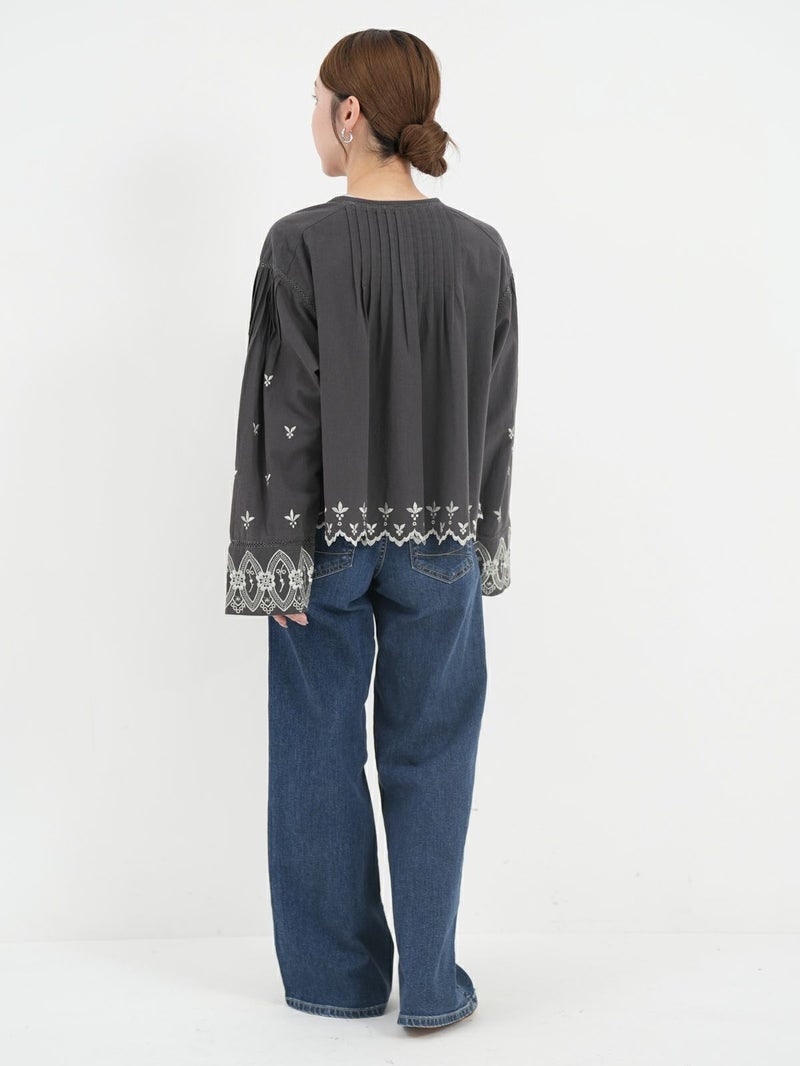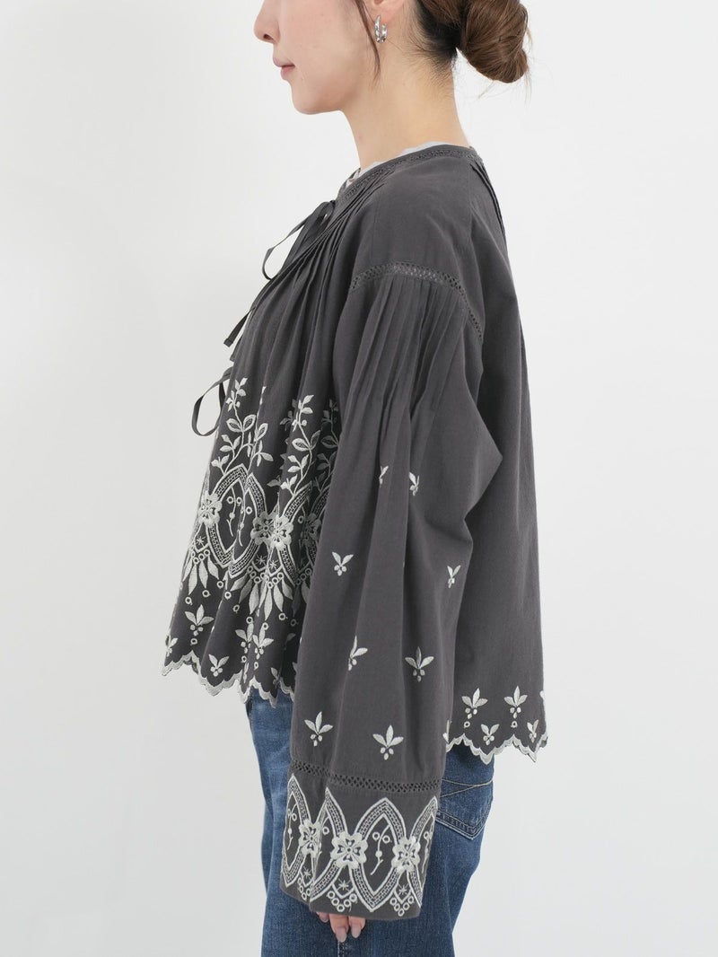 繊細で美しいエンブロイダリーがフェミニンで華やかな印象を与えてくれるトップ。 きゅっと結んだかわいいリボン、細やかなピンタック、ボリューム袖が女性らしさを引き立てます。爽やかでクリーンなコットン素材を用いて、快適な着心地をキープ。絶妙な着丈バランスで、ワンピースからパンツルックまで着まわしが効きます。