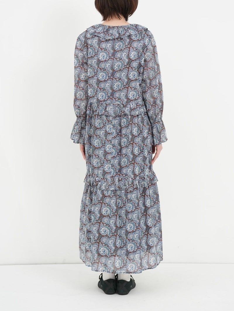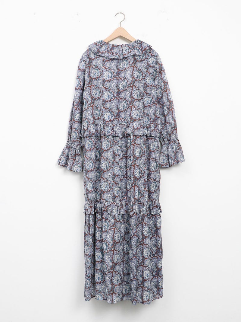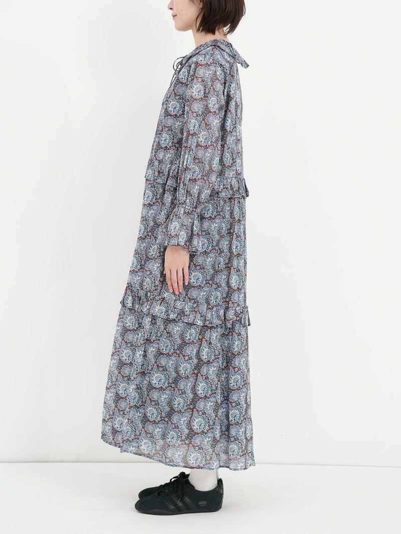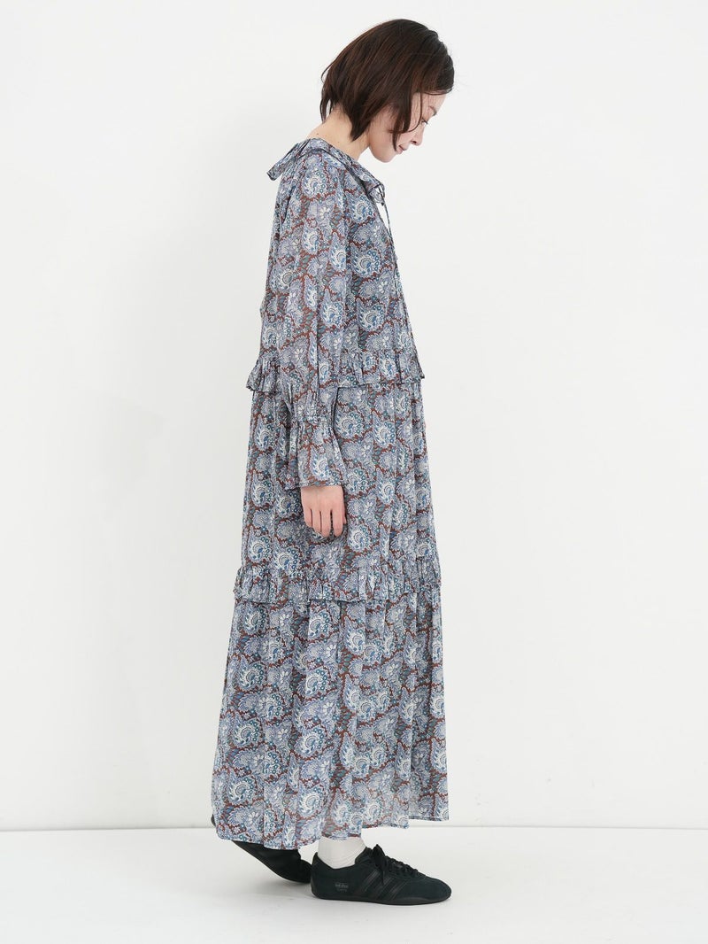 ne Quittezpasのコットンオルガンザペイズリーワンピース。 襟と袖のフリルが特徴の少しハリ感のあるコットン素材。やや薄手なので夏でも着用いただけます。胸元のリボンを開けて着るのもおすすめです。
