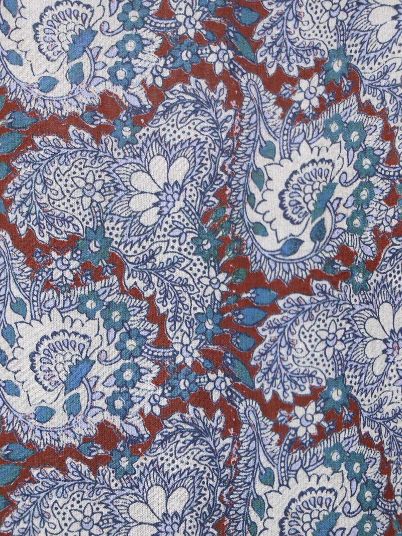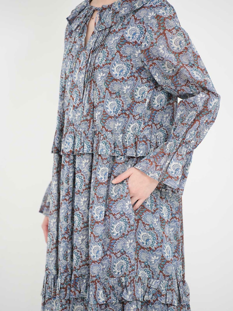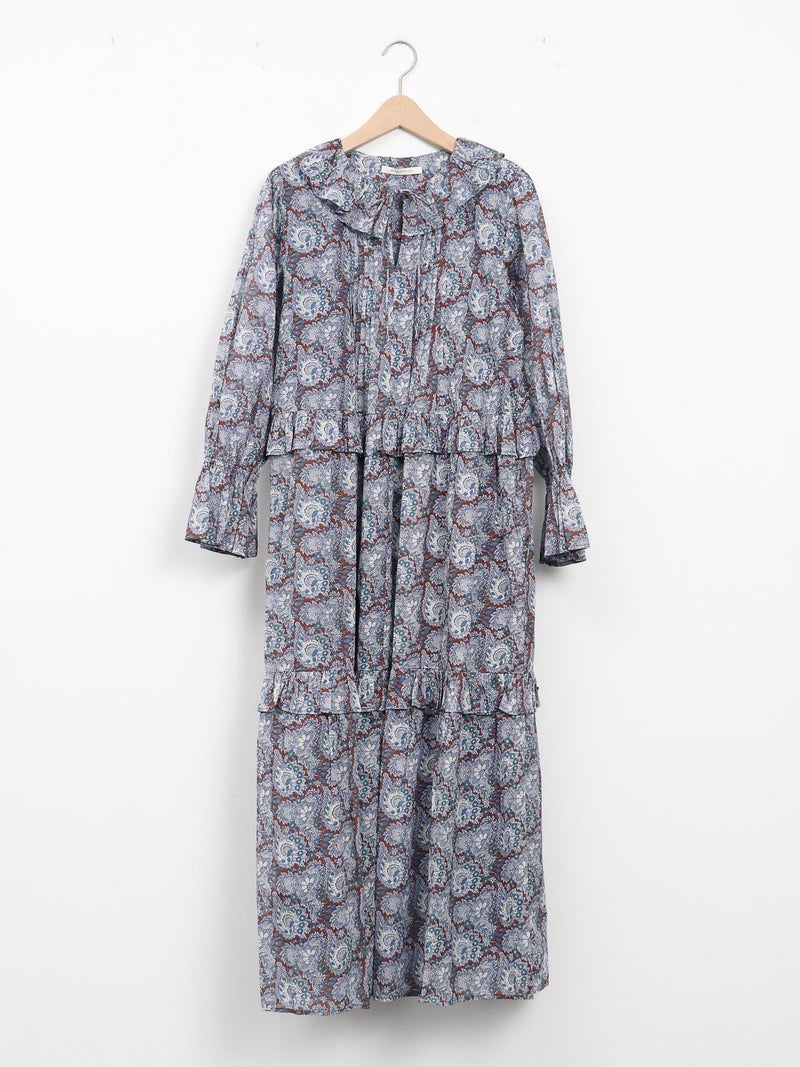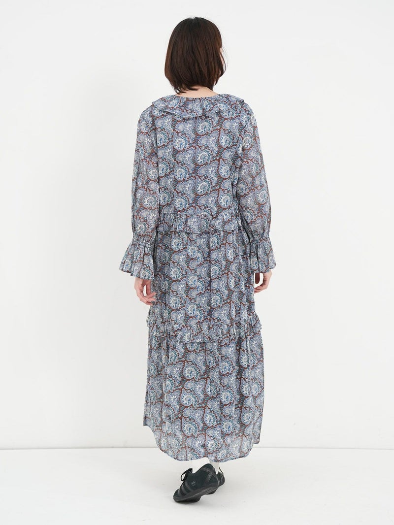 ne Quittezpasのコットンオルガンザペイズリーワンピース。 襟と袖のフリルが特徴の少しハリ感のあるコットン素材。やや薄手なので夏でも着用いただけます。胸元のリボンを開けて着るのもおすすめです。
