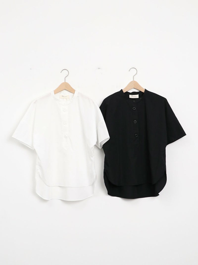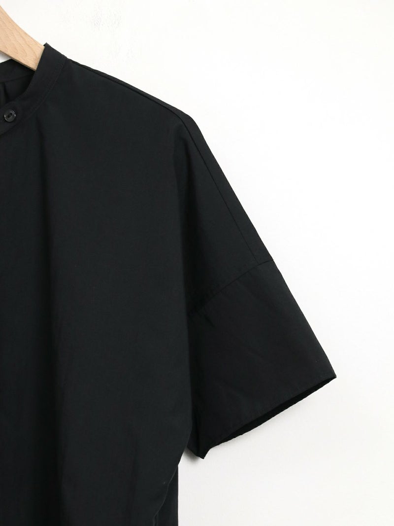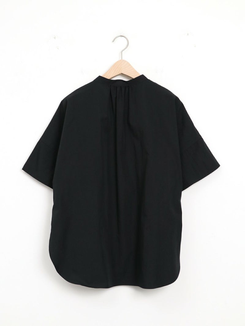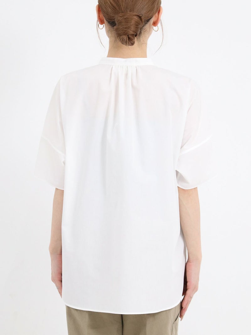 パラシュート釦がアクセントの、定番の半袖スタンドカラーシャツ。 身幅をたっぷりとったオーバーサイズのシルエットで、バックにギャザーが入った、ゆったりとしてリラックスできる着心地です。 ポリエステルとコットンの混紡糸を使用した張り感のあるブロード生地。 コットンらしい風合いは残しつつ、速乾でシワになりにくく、夏の季節に適したイージーケアな素材です。