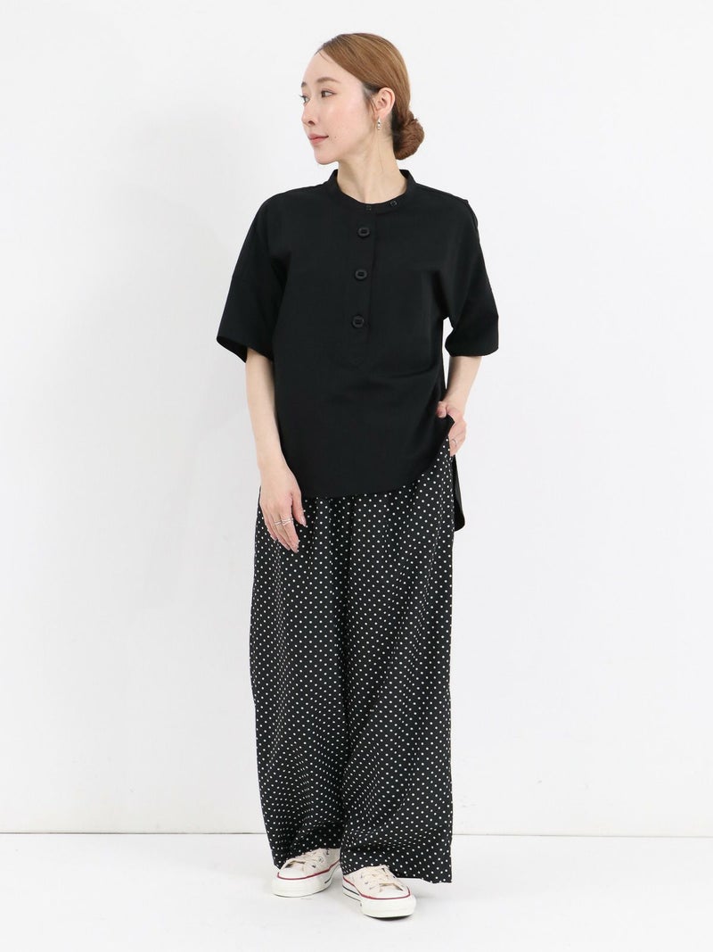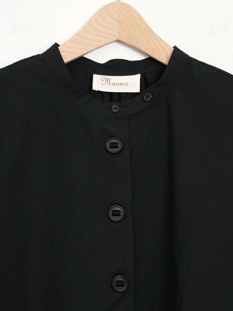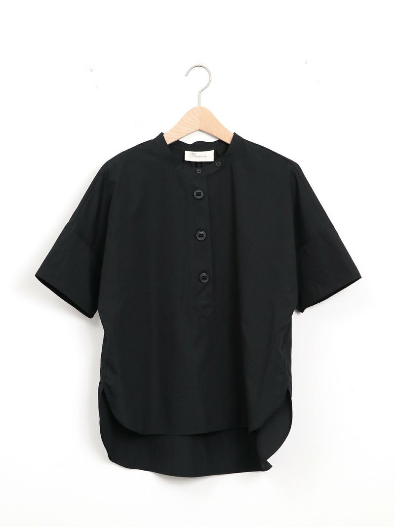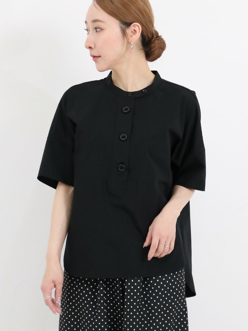 パラシュート釦がアクセントの、定番の半袖スタンドカラーシャツ。 身幅をたっぷりとったオーバーサイズのシルエットで、バックにギャザーが入った、ゆったりとしてリラックスできる着心地です。 ポリエステルとコットンの混紡糸を使用した張り感のあるブロード生地。 コットンらしい風合いは残しつつ、速乾でシワになりにくく、夏の季節に適したイージーケアな素材です。