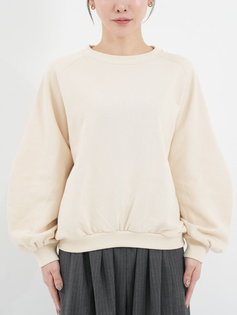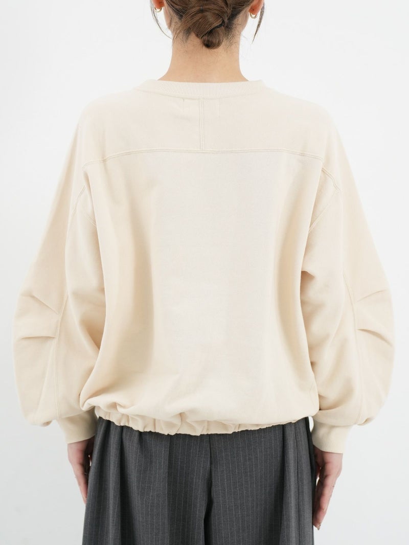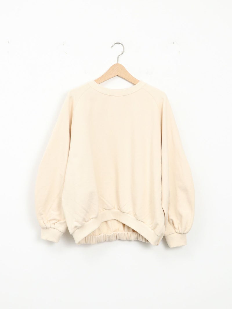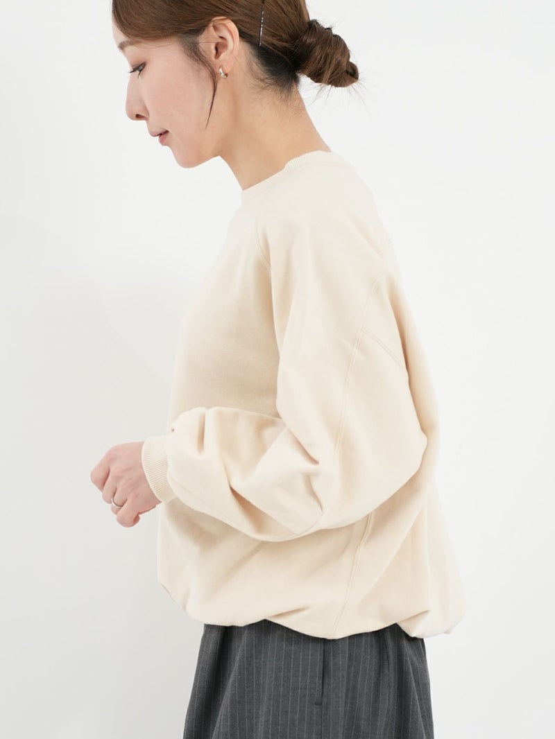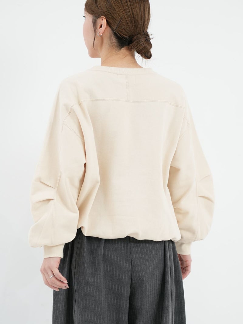 丸みのあるシルエットが魅力の裏毛素材のトレーナー。 後ろ裾にはゴムでギャザーを寄せ、程よい丸みとボリューム感をプラス。 袖はハギにタックをとり、袖口にもギャザーを入れることで柔らかいフォルムに仕上げました。 カジュアルながらもフェミニンな印象の一着です。