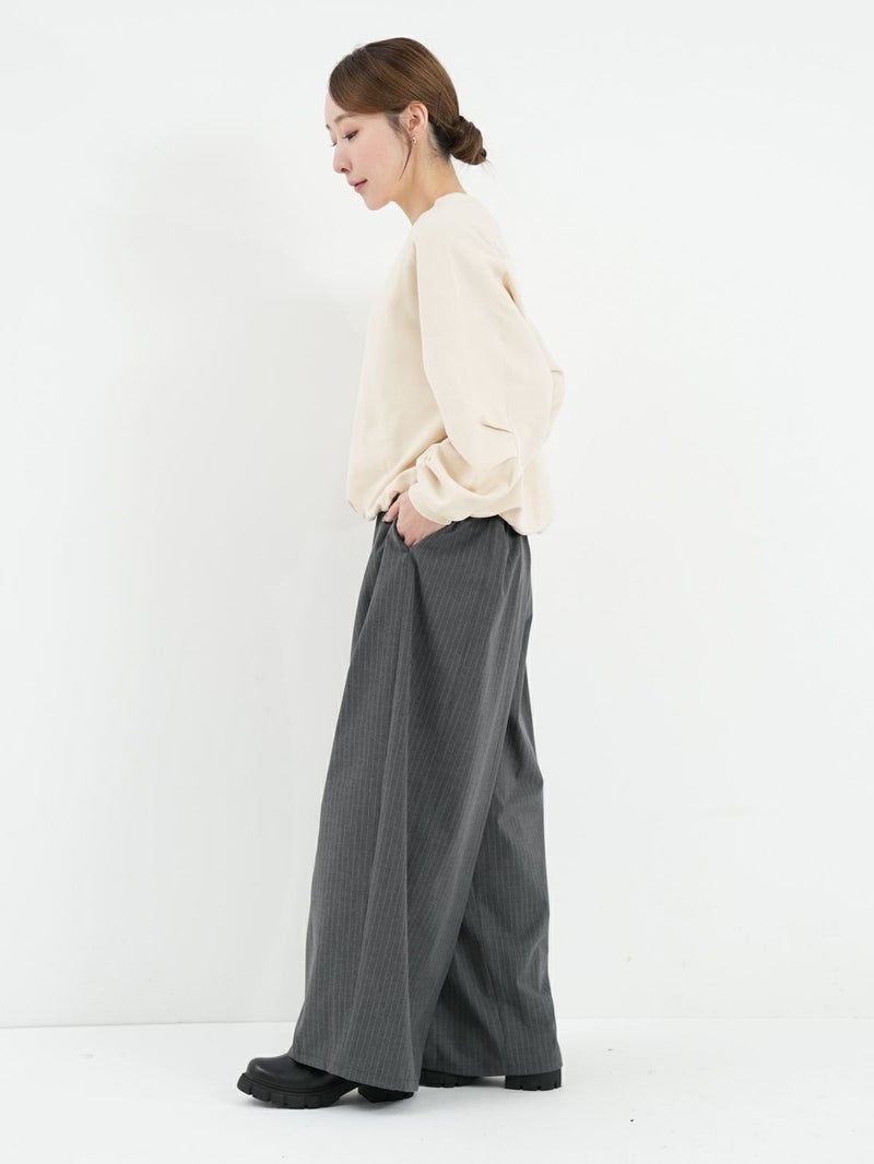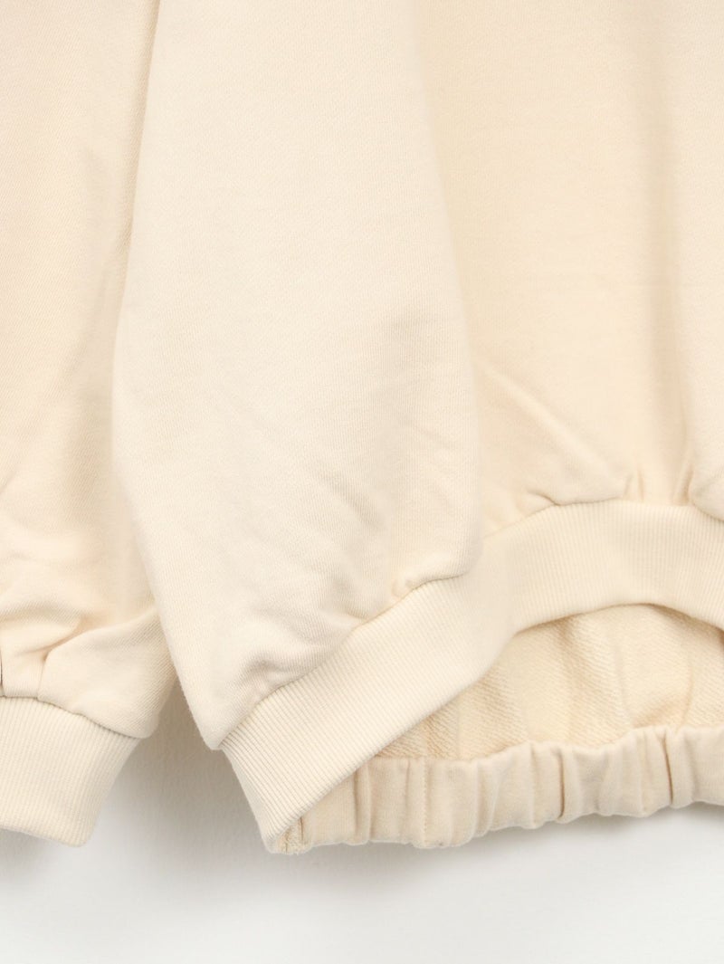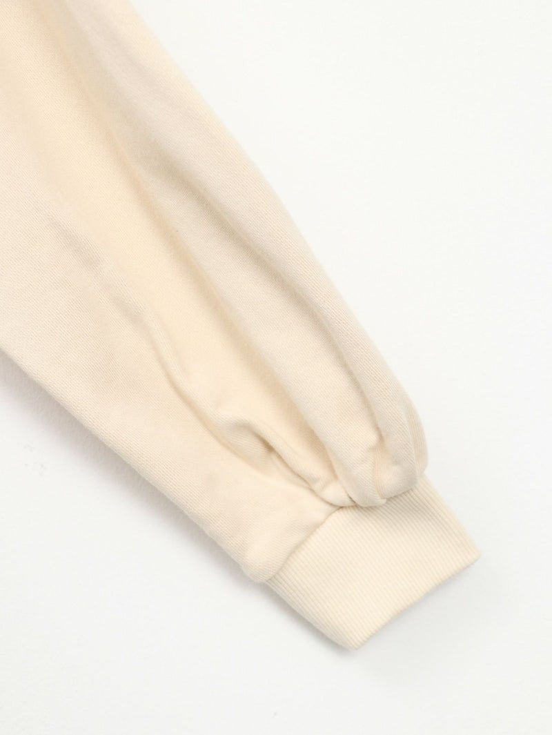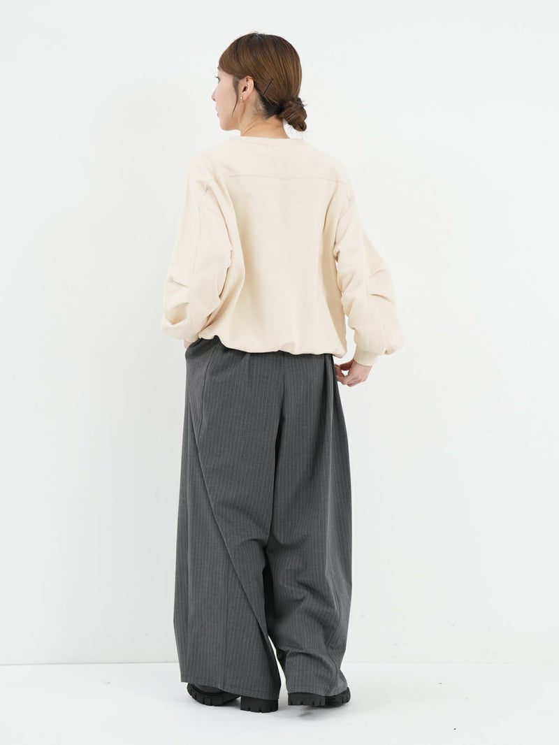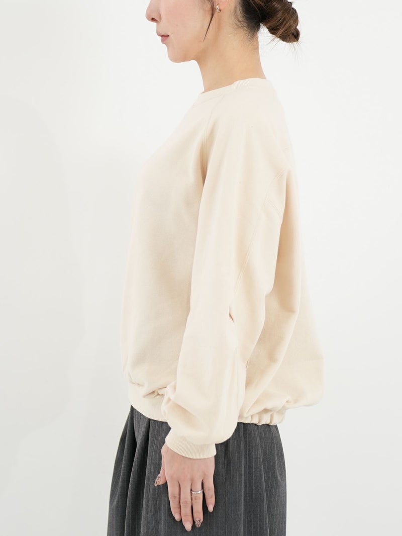 丸みのあるシルエットが魅力の裏毛素材のトレーナー。 後ろ裾にはゴムでギャザーを寄せ、程よい丸みとボリューム感をプラス。 袖はハギにタックをとり、袖口にもギャザーを入れることで柔らかいフォルムに仕上げました。 カジュアルながらもフェミニンな印象の一着です。
