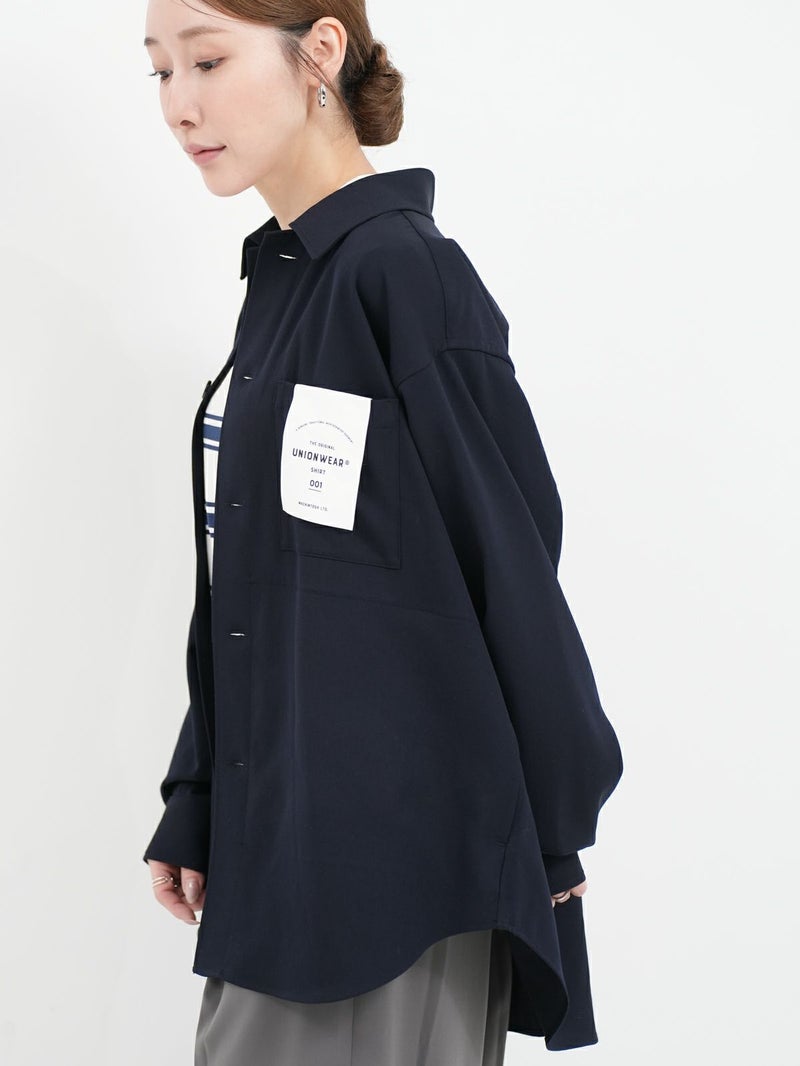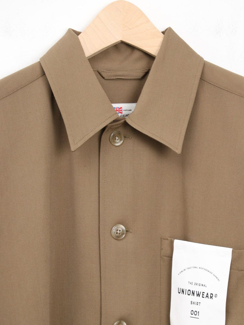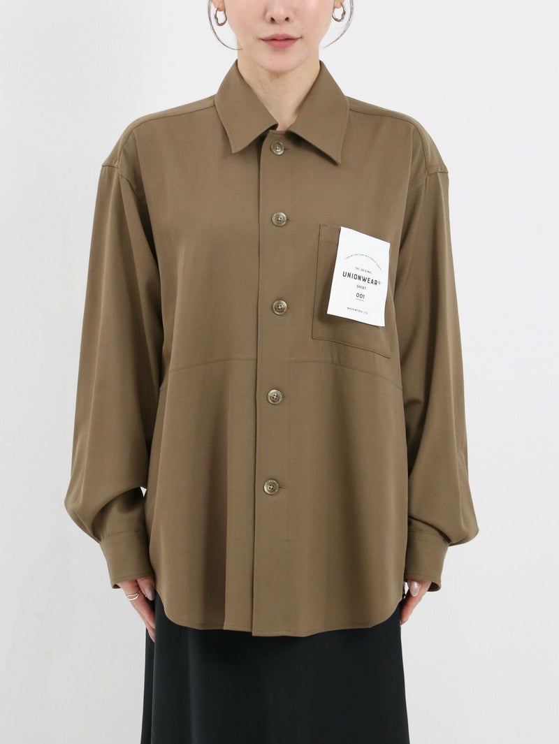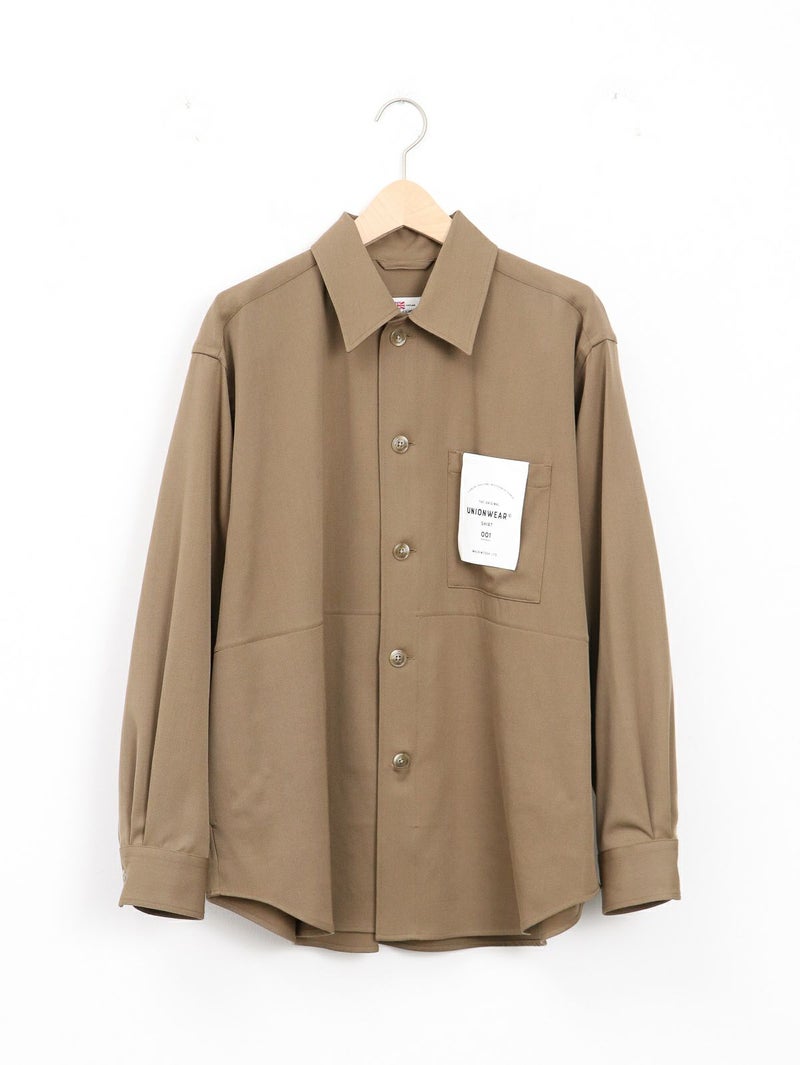 大人気のクリーンなワークウェアシリーズUNIONWEAR(ユニオンウェア)のオーバーサイズのワークシャツ、SHIRT 001(シャツ 001)。 こちらのシャツ 001は、程よくドロップしたショルダーラインとボクシーなシルエットが魅力で、羽織りとしてもアウターのインナーとしても活躍する万能アイテムです。素材には、程よいハリとクリアな表情が特長のウールストレッチのギャバジンを使用。そのハリのある生地から美しいシルエットが生まれます。