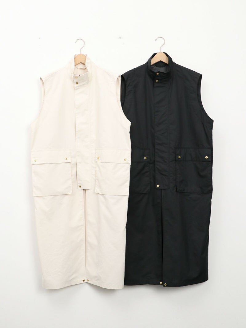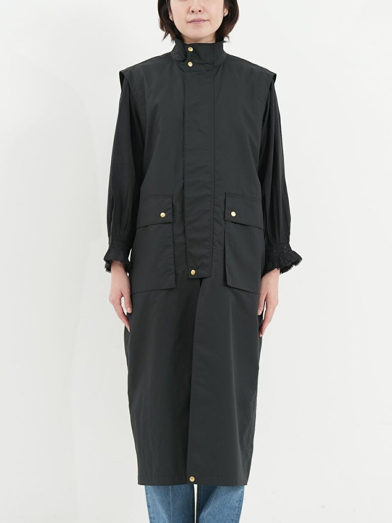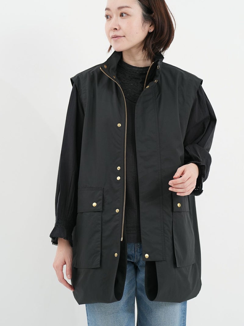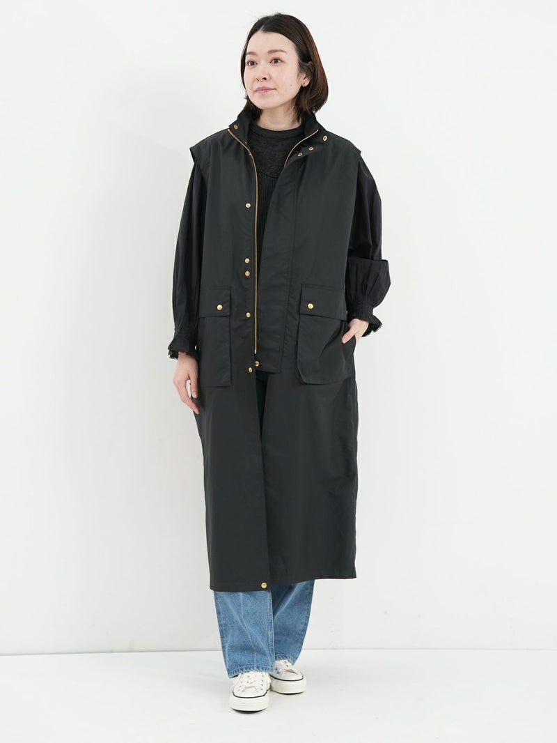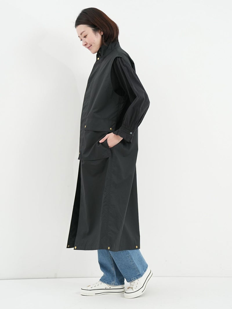 Traditional Weatherwearのスタンドカラーコート、ELGIN LONG(エルガン ロング)にスリーブレスモデルが新登場。 英国伝統のフィールドコートをベースにした、スタンドカラーで背中の大きなアンブレラヨークが特長のアウターウェアです。 内側に折り返してスナップボタンを留めると、着丈が約40cm短くなりショート丈のベストに早変わり。折り返して短くなった裾の部分がふんわりして柔らかな印象になり、横からのAラインが際立ちます。