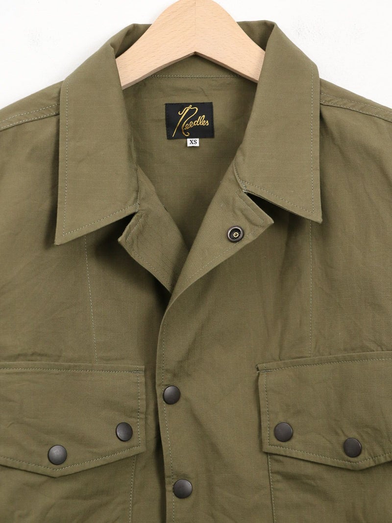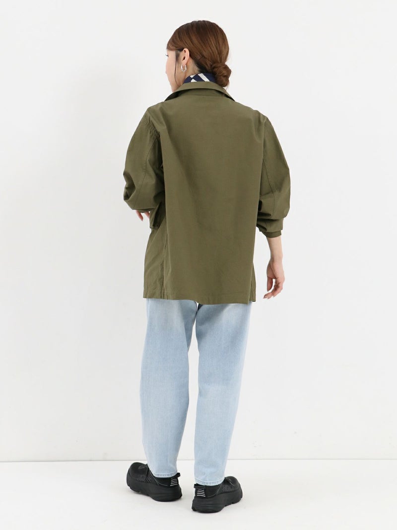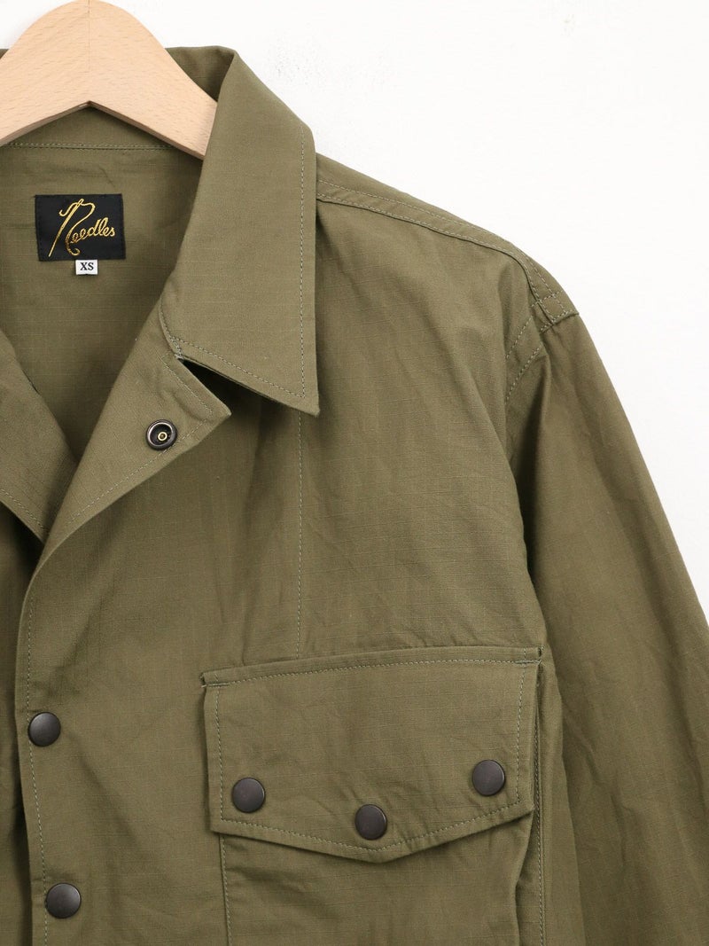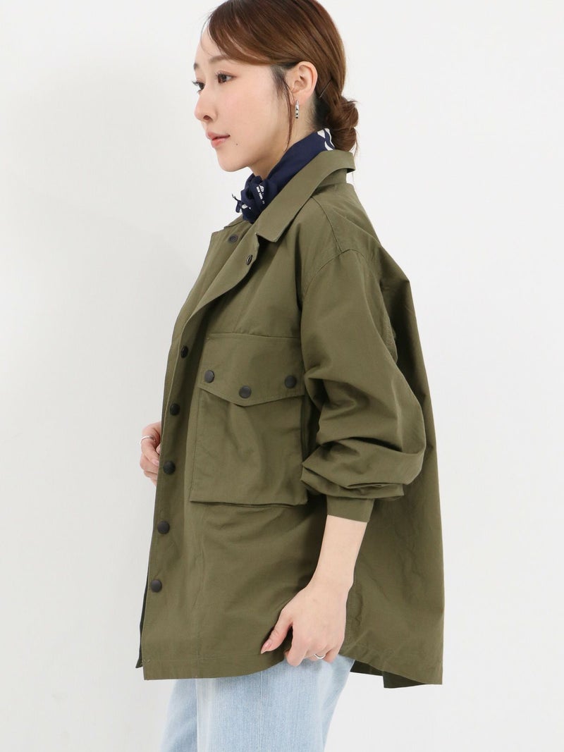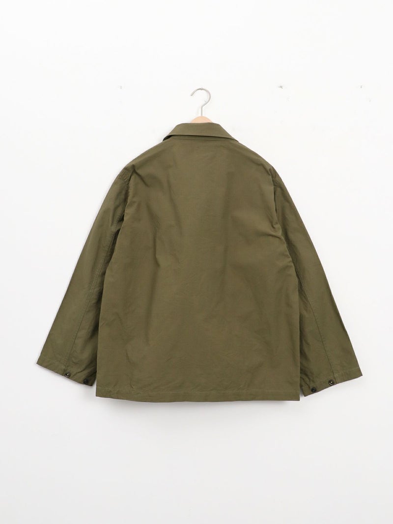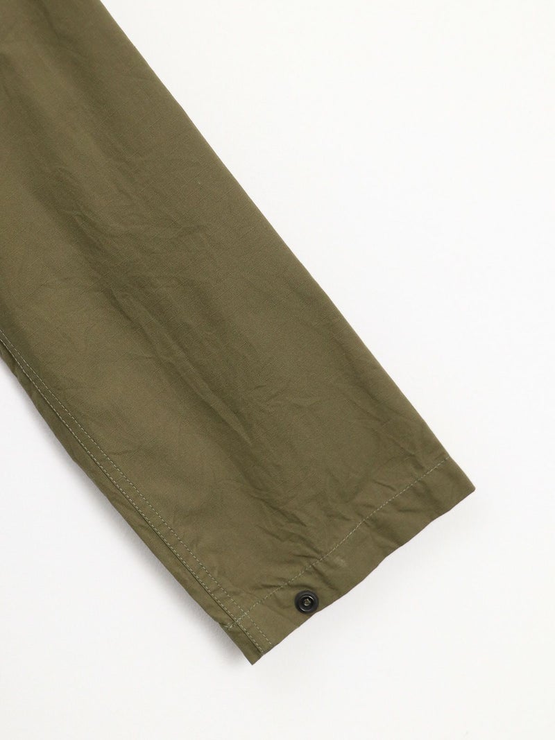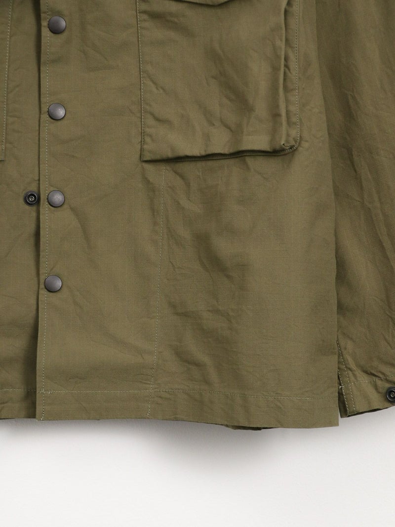 両胸に大きなマチ付きフラップポケットを備えた軽快なフィールドジャケット。 スナップボタンを多用したデザインが特徴的で、袖口も調整可能のです。ミリタリーでは定番のコットンリップストップを使用し、シーズンを問わず活躍する一着です。