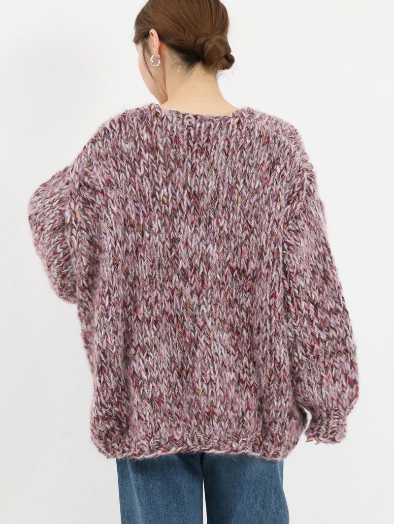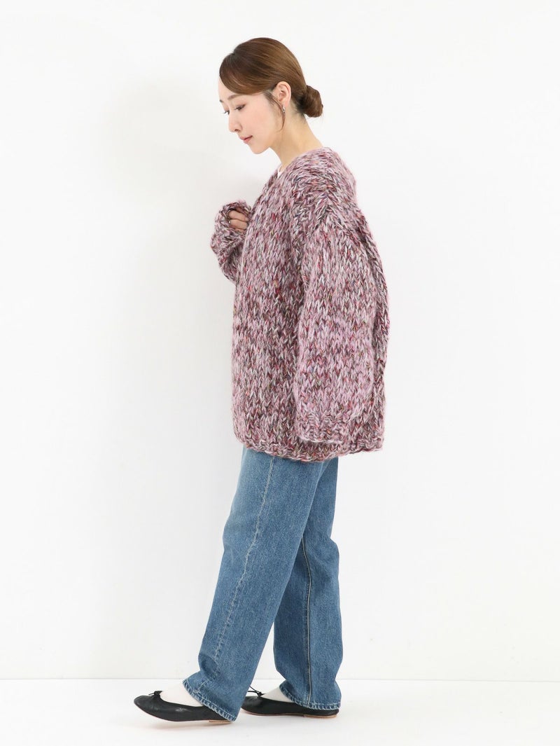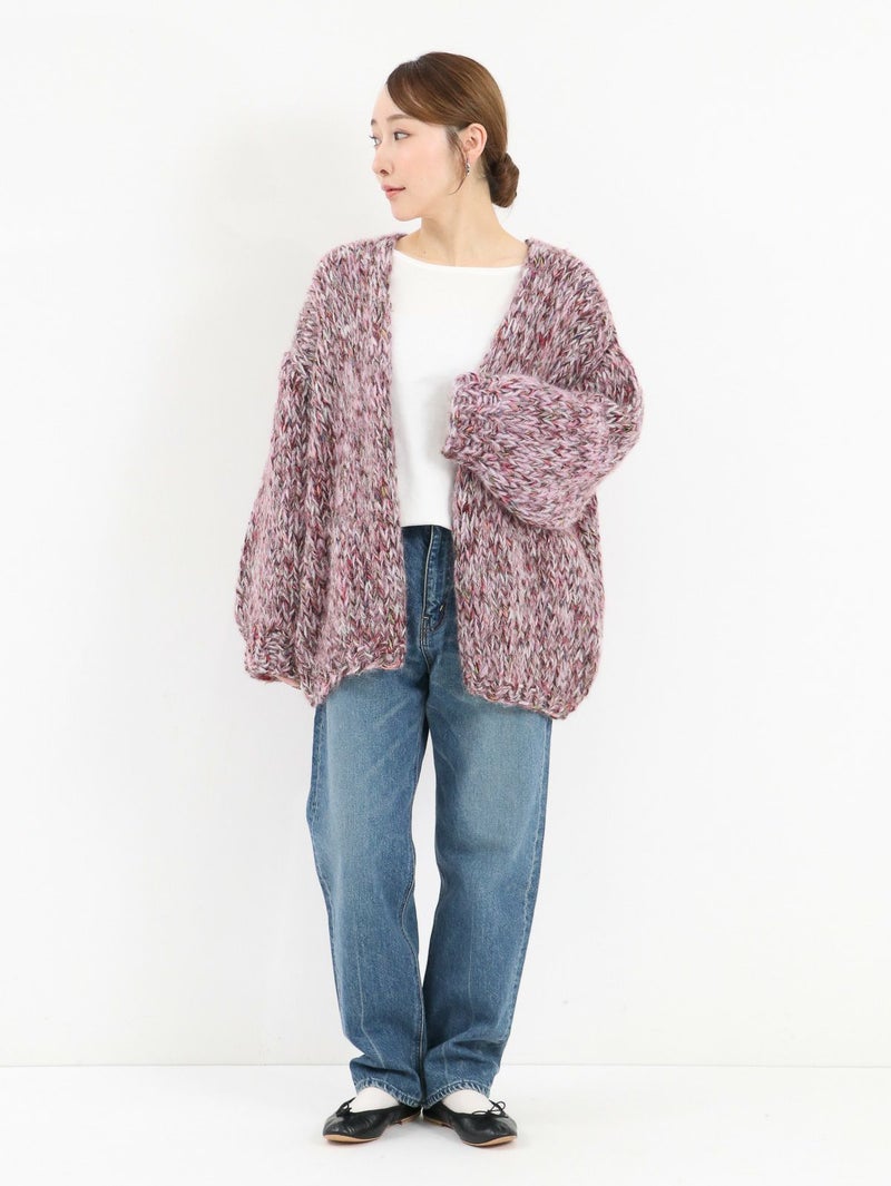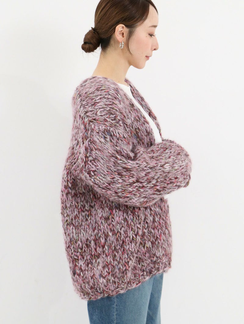 糸のグラデーションカラーが特徴的なショートカーディガン。 ざっくりとした厚手の編地は伸縮性がありほどよく透け感もあるので、インナーダウン等とのレイヤードスタイルで冬もコーディネートを楽しめる1着です。