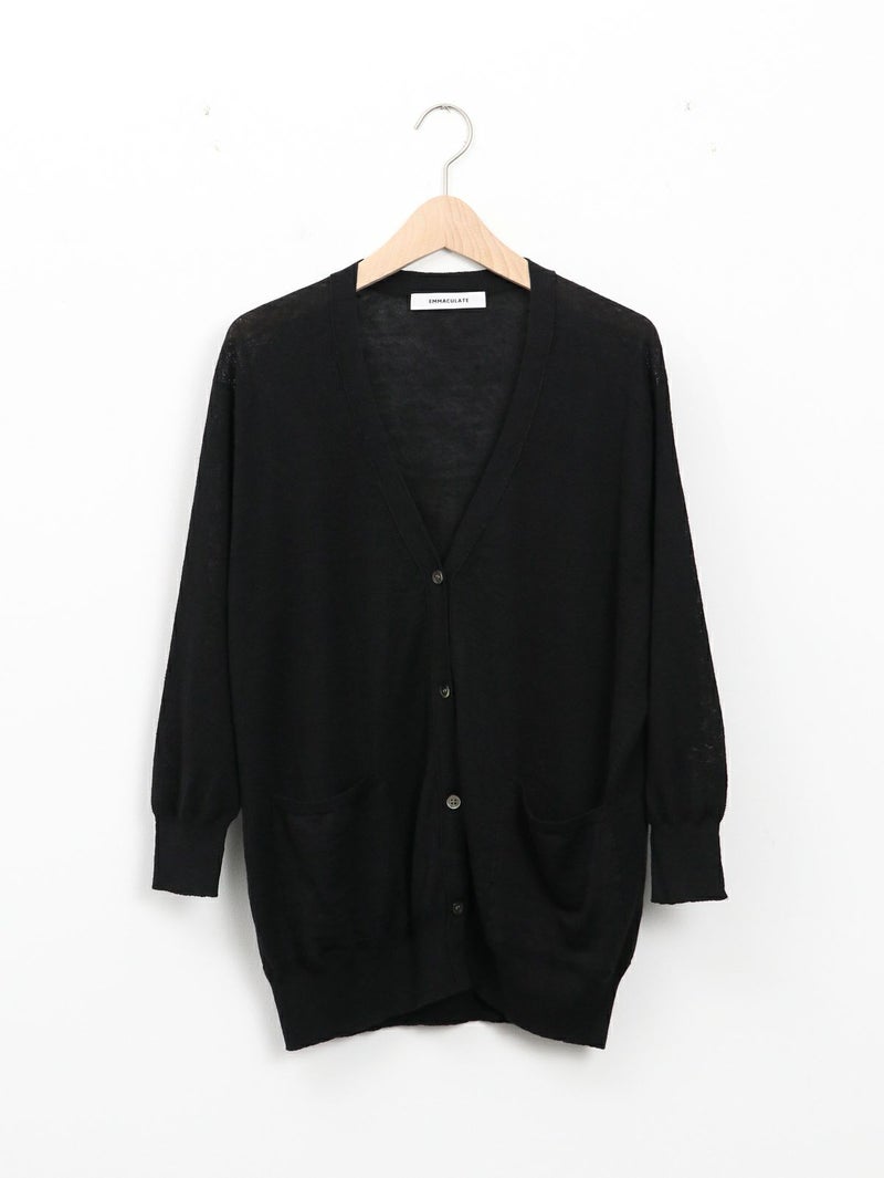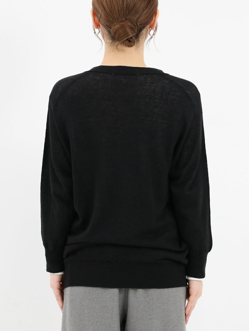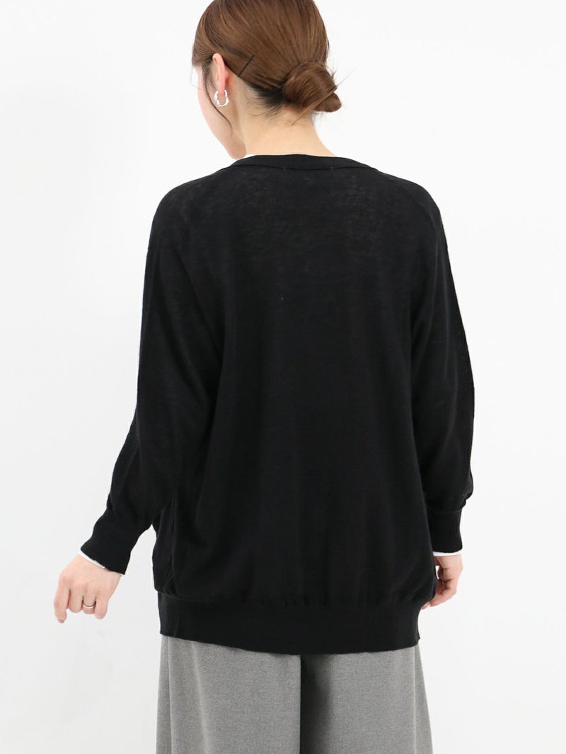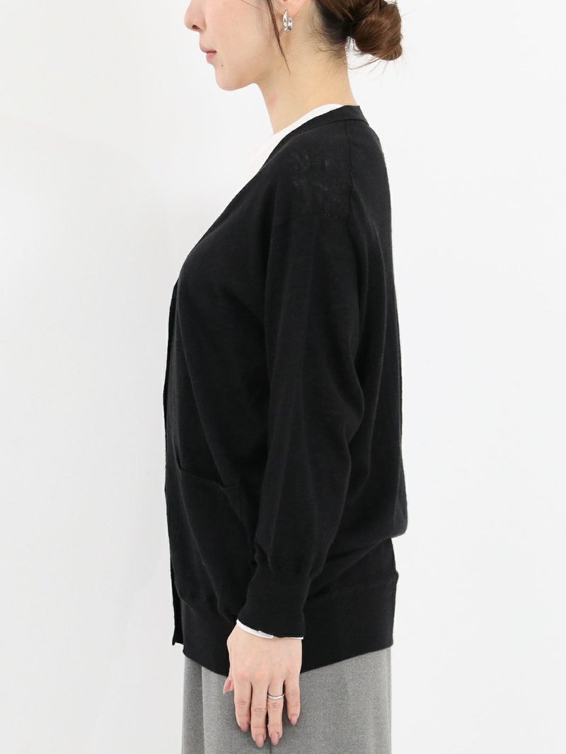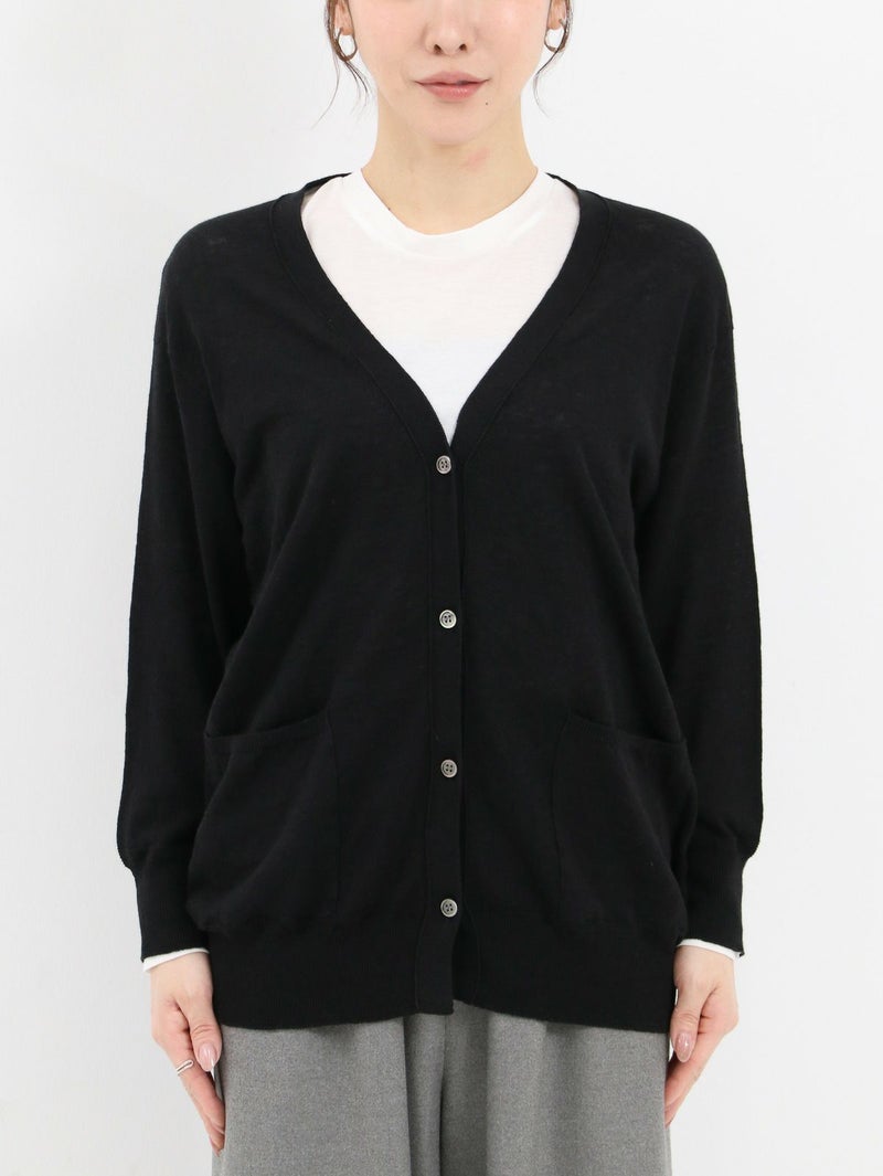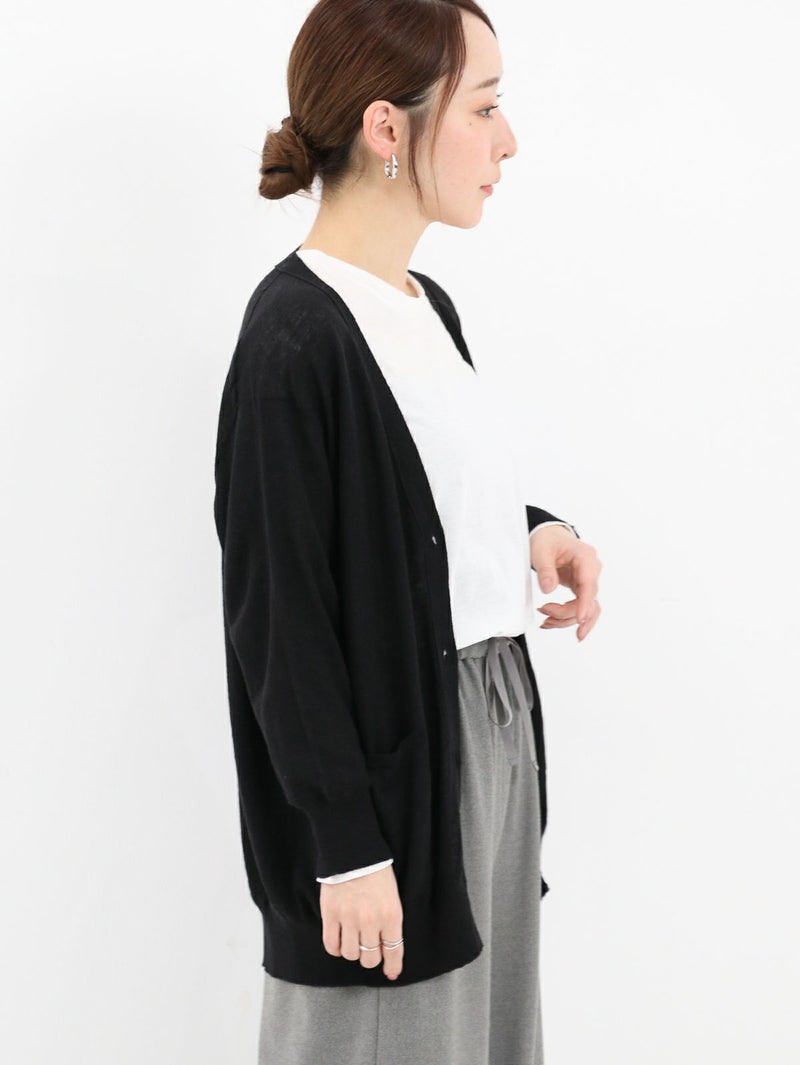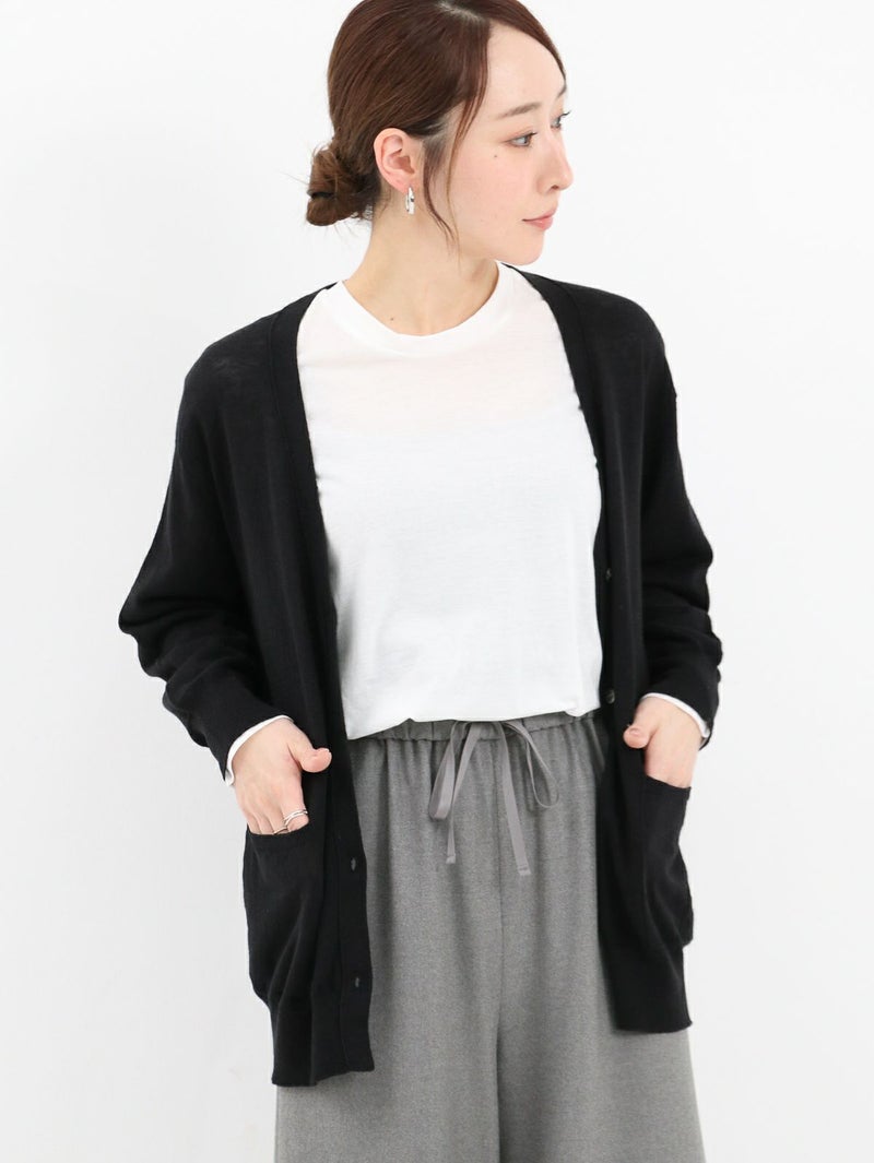 シンプルなVネックカーディガン。 コットンリネンでさらっとした着心地。カットソーやシャ ツにさらりと羽織ったり、ボタンをとめてブルオーバーのようにも着用できる合わせやすいアイテムです。