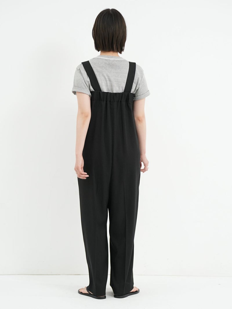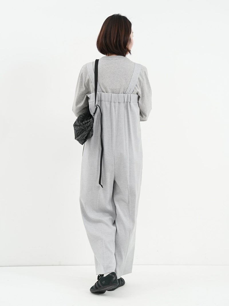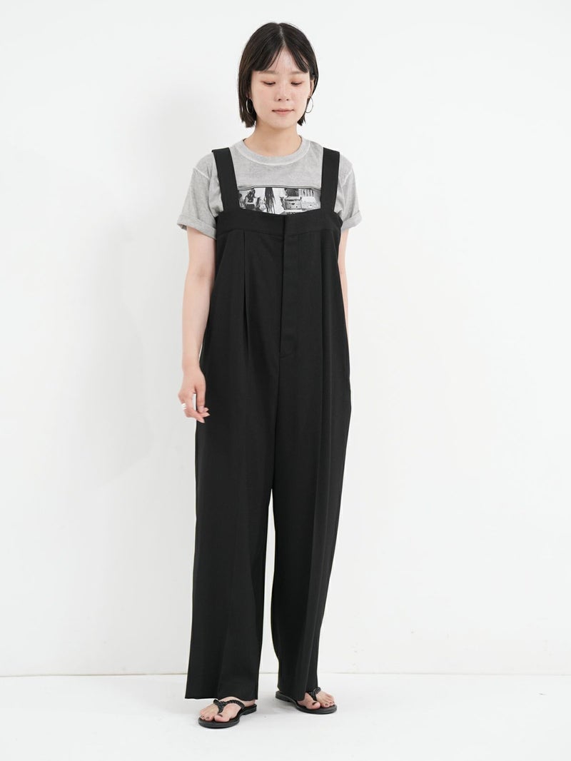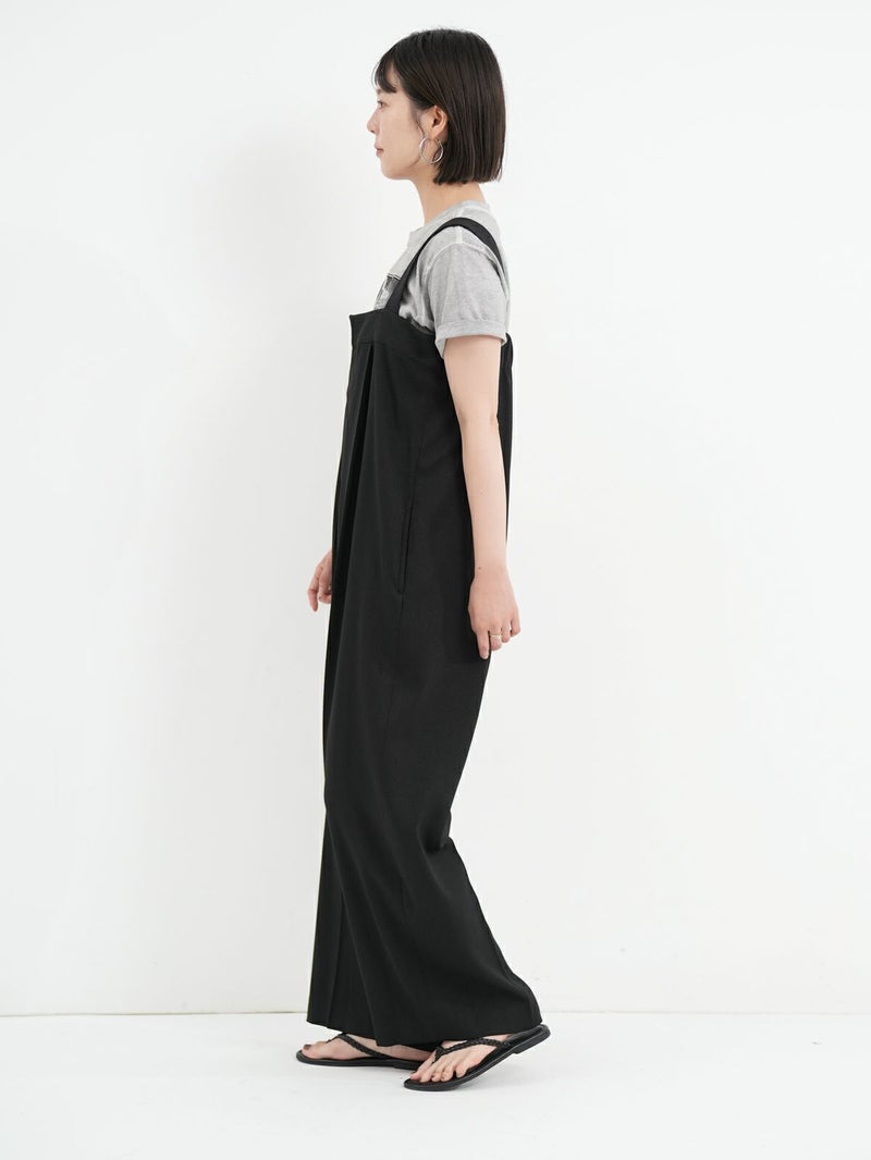 すとんと落ちるIラインシルエットのサロペット。 程よくゆとりのあるサイズ感で身体のラインを拾わず、リラックス感のある着心地です。シャリ感と少し光沢感のある生地で、キレイめな雰囲気にはもちろん、Tシャツなどと合わせてカジュアルな雰囲気にも◎