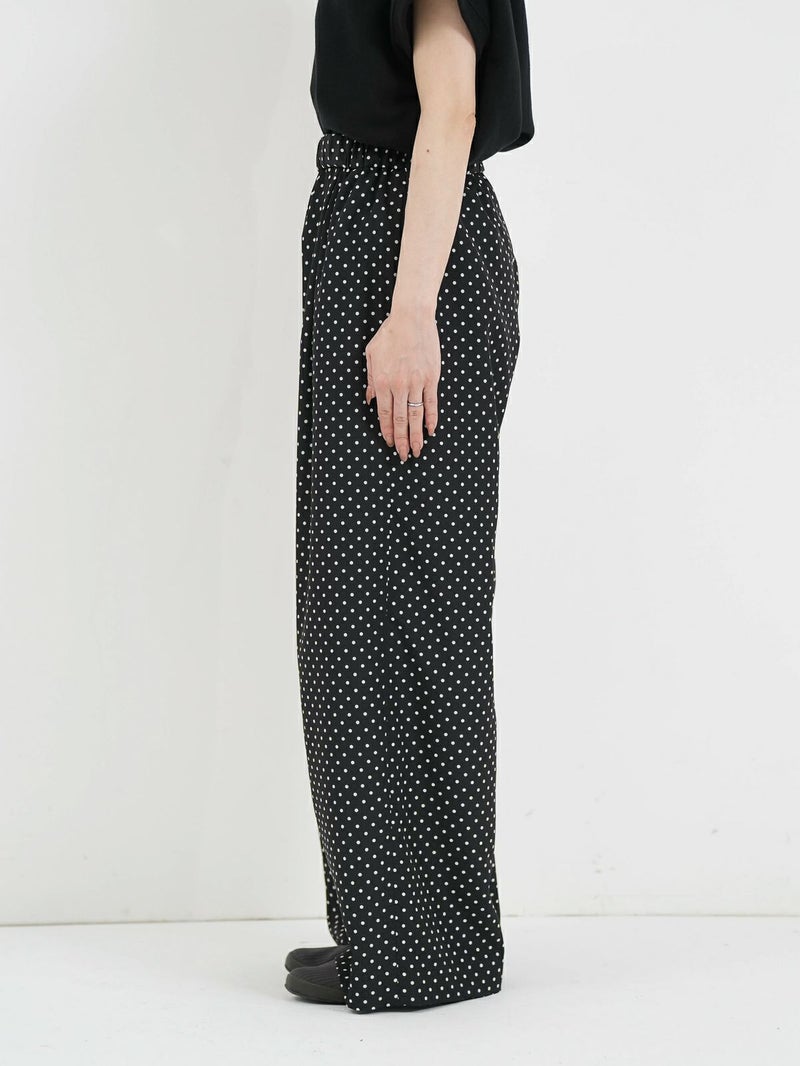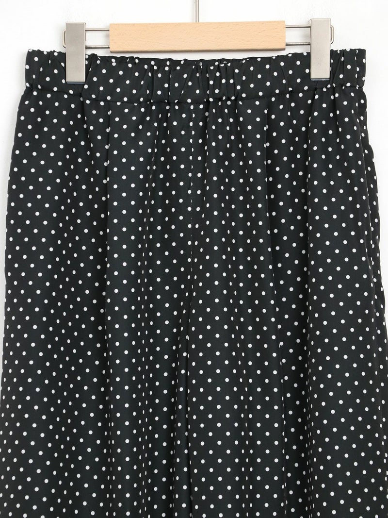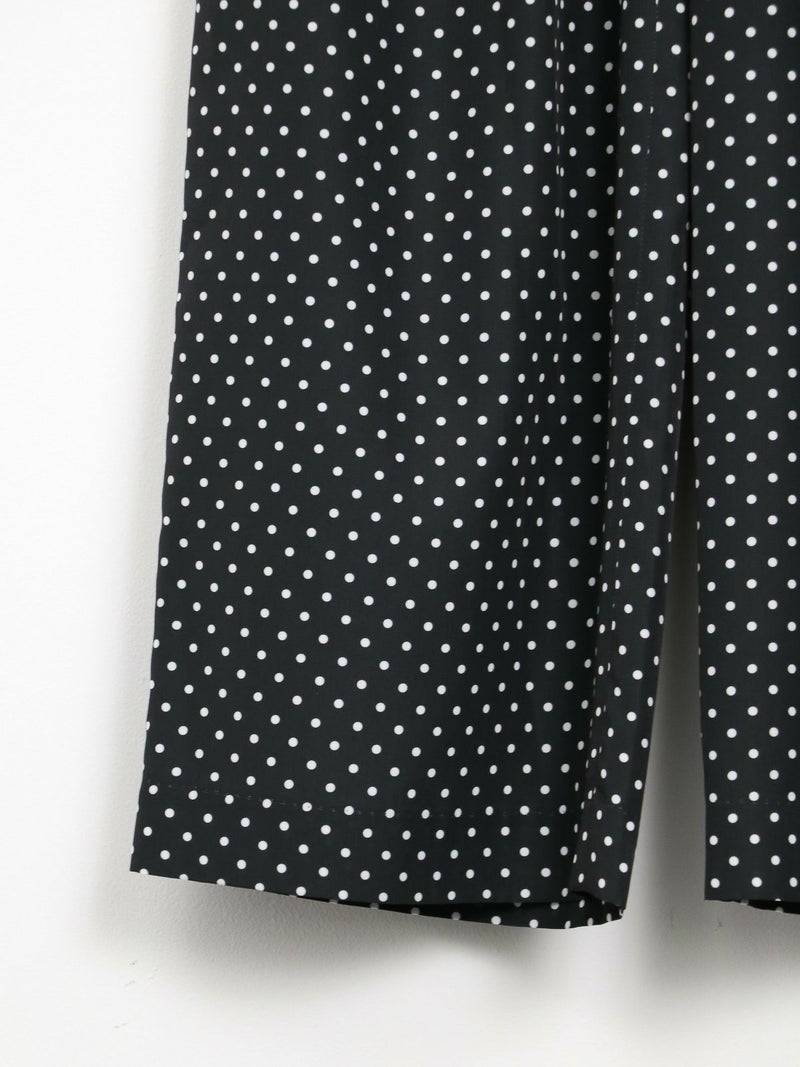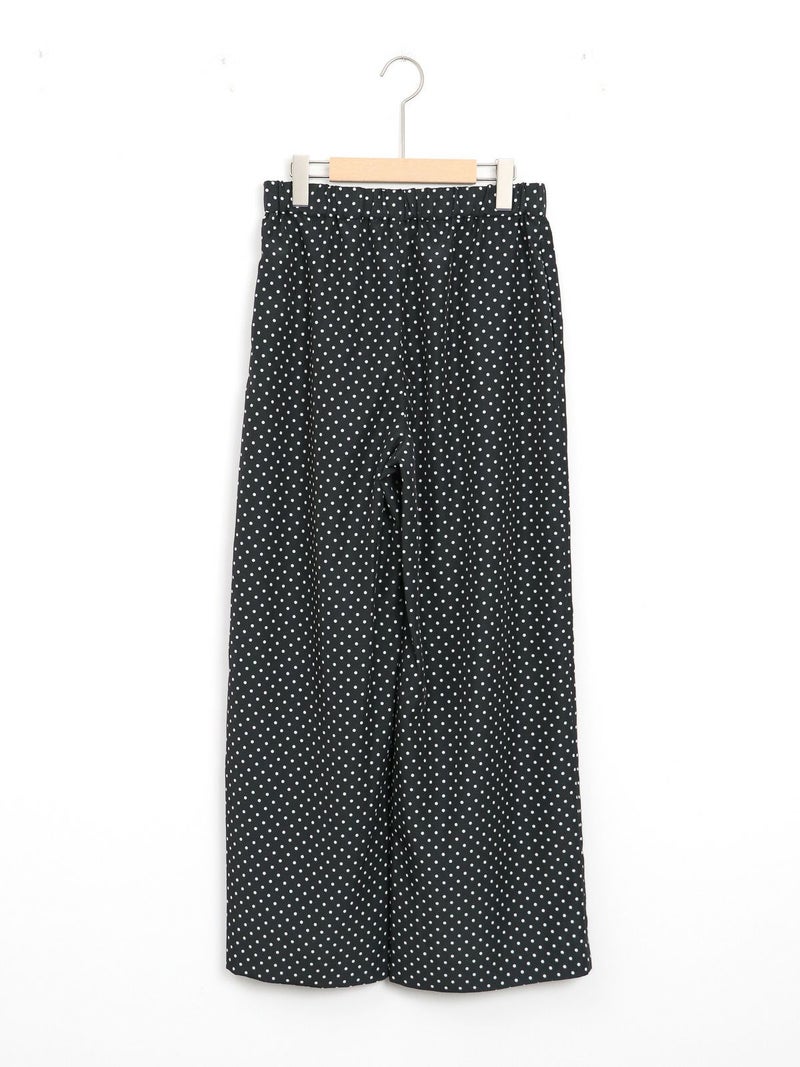 通年活躍するドットパンツ。 ポリエステル100%でお洗濯も可能です。フロントにタックが入っており程よくワイドなシルエット。透け感なく着用ができ、今からの季節にちょうど良いです。カジュアルなプリントTシャツに合わせても、シンプルな無地のカットソーできれい目に合わせてもコーディネートのポイントになります。