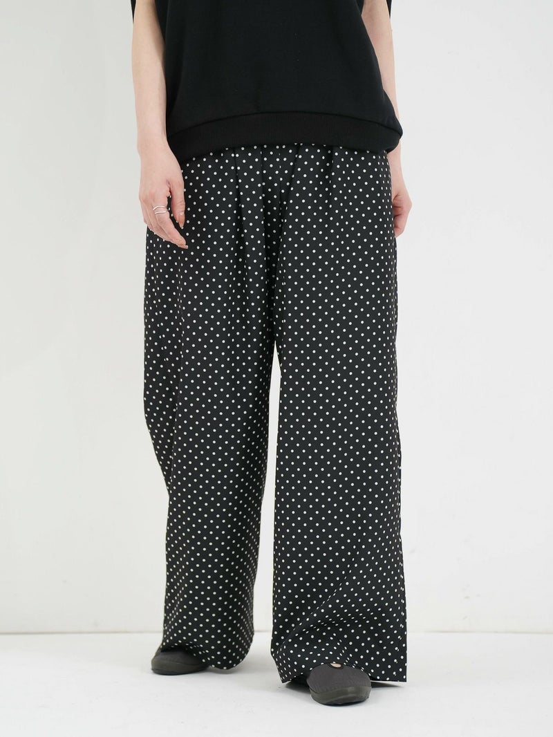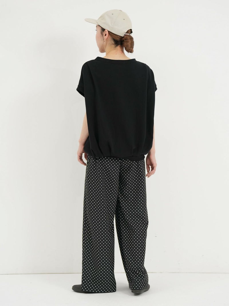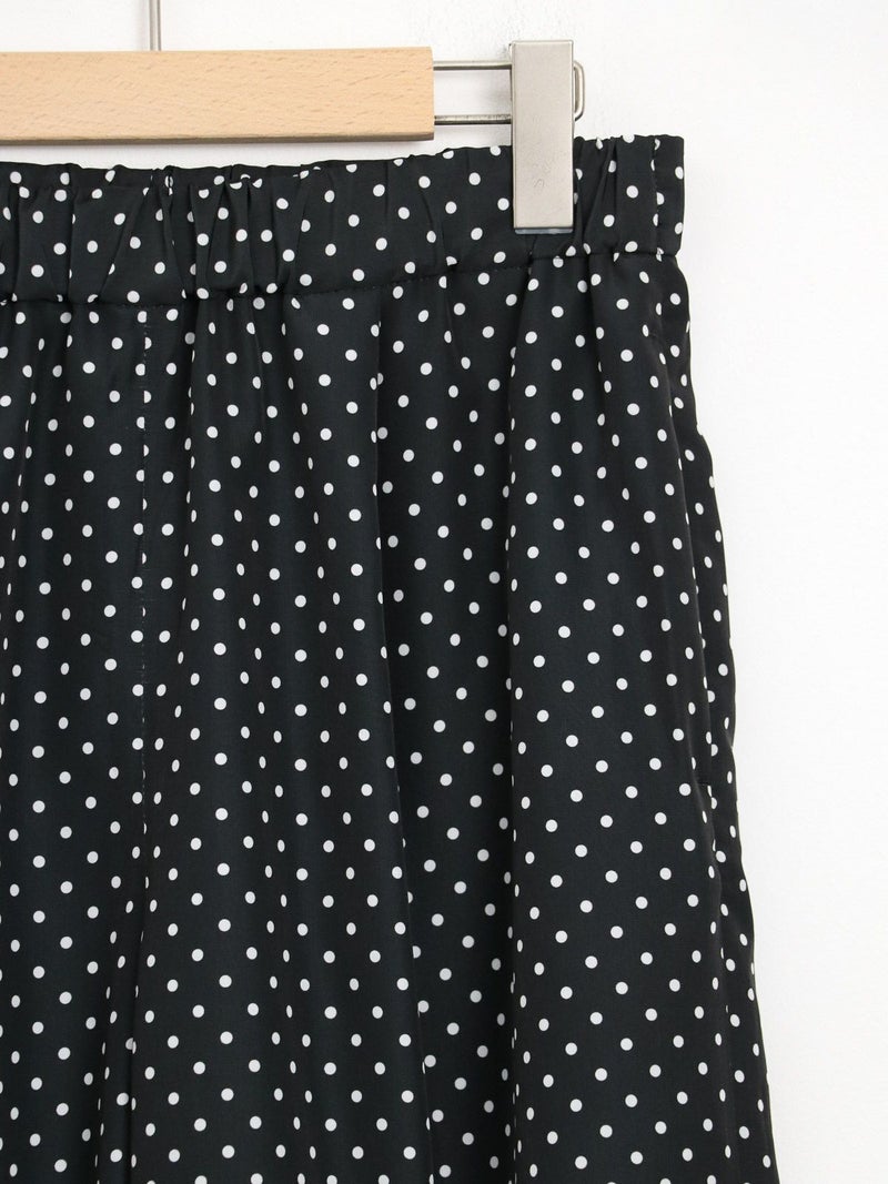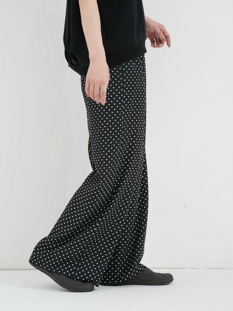 通年活躍するドットパンツ。 ポリエステル100%でお洗濯も可能です。フロントにタックが入っており程よくワイドなシルエット。透け感なく着用ができ、今からの季節にちょうど良いです。カジュアルなプリントTシャツに合わせても、シンプルな無地のカットソーできれい目に合わせてもコーディネートのポイントになります。