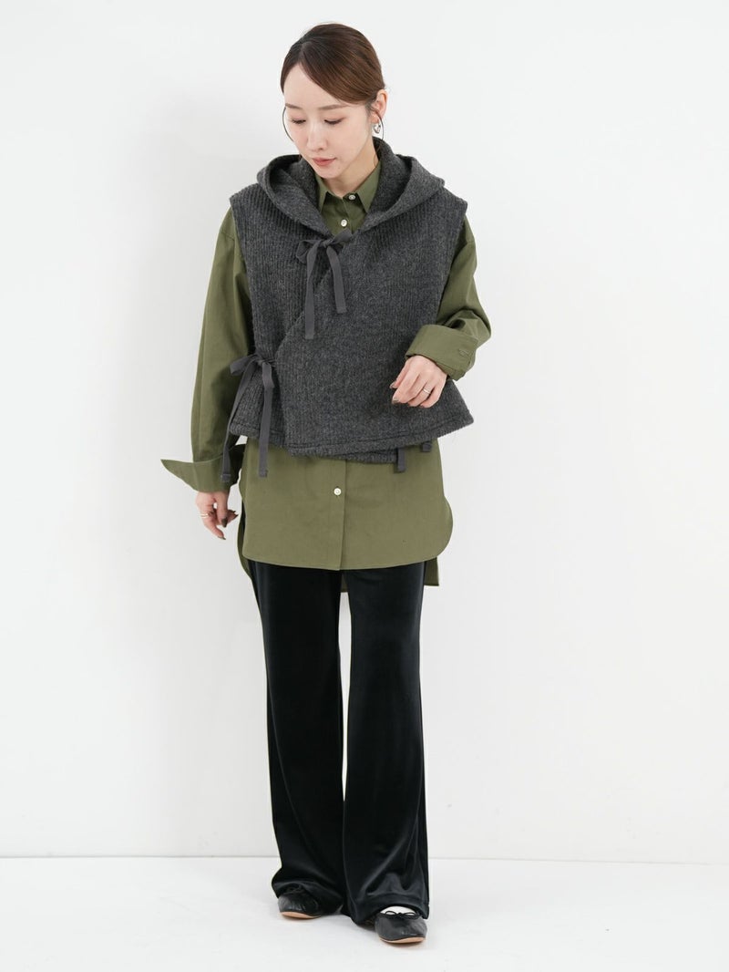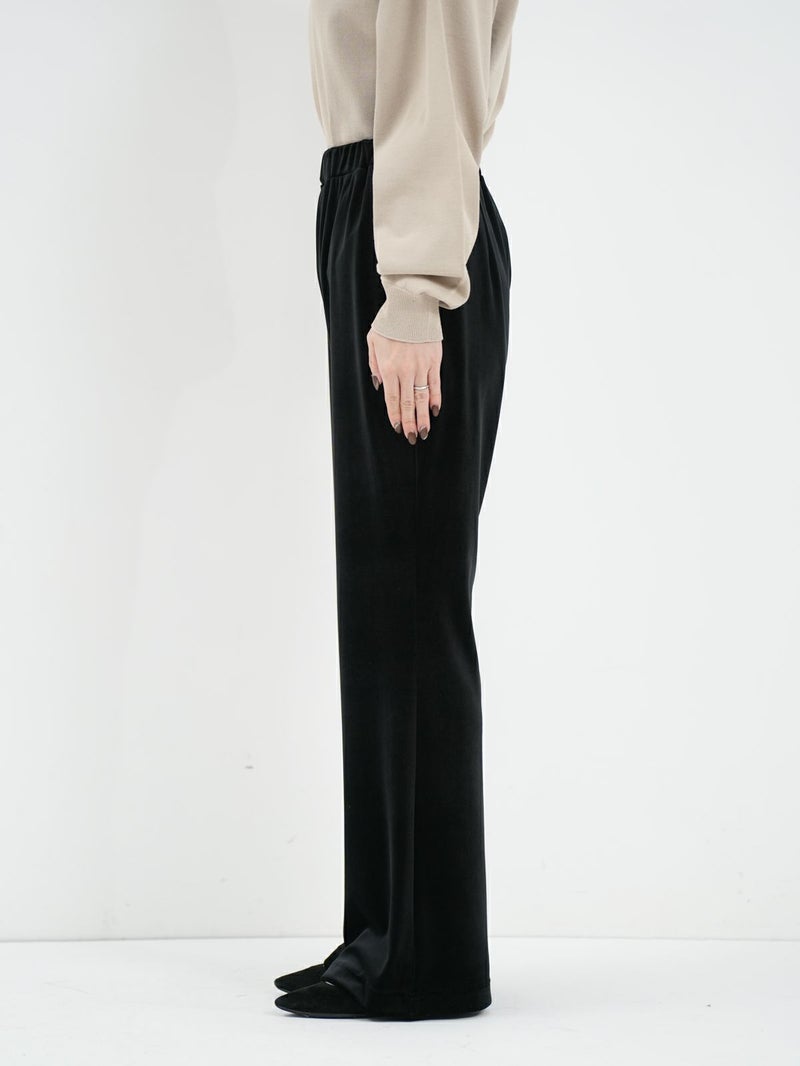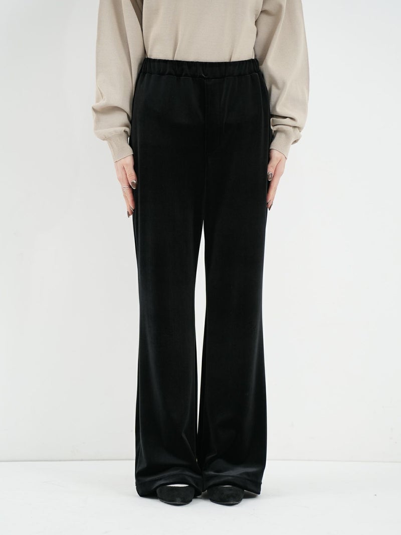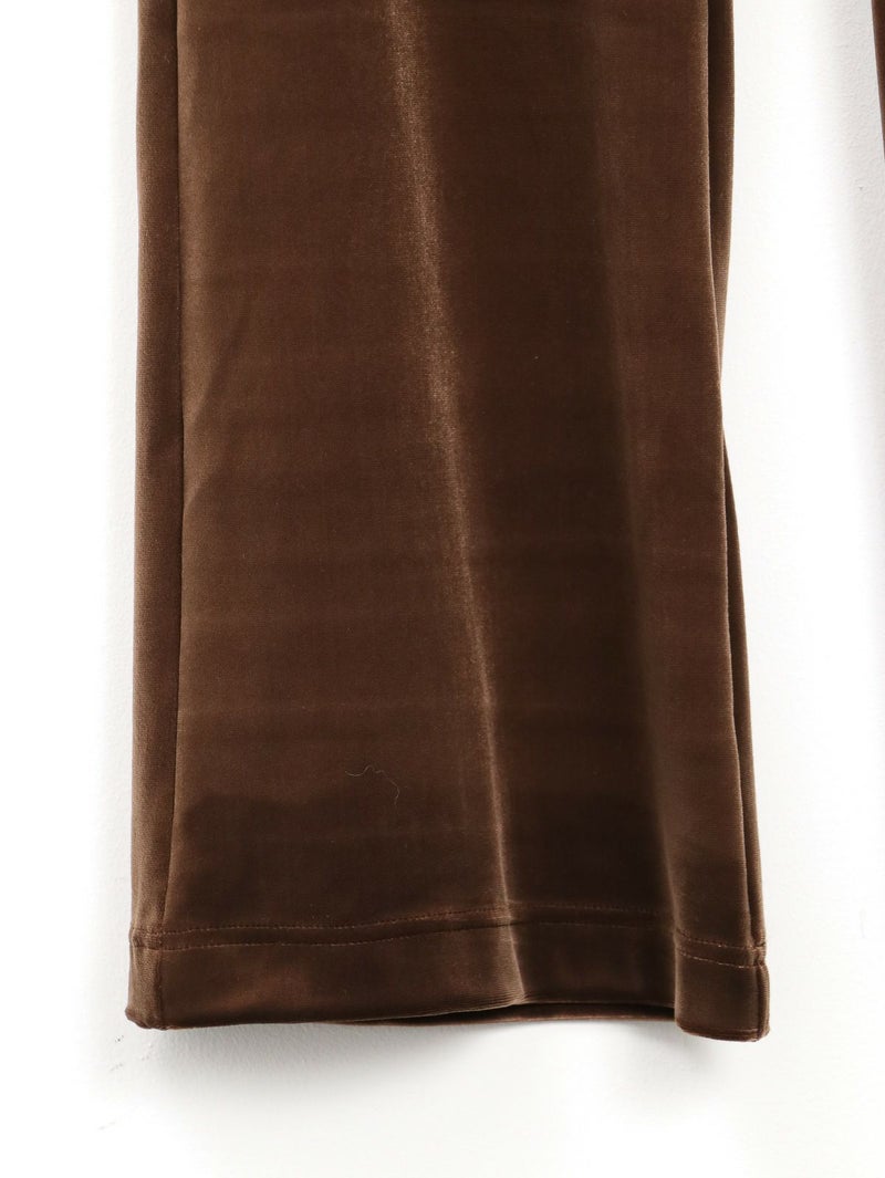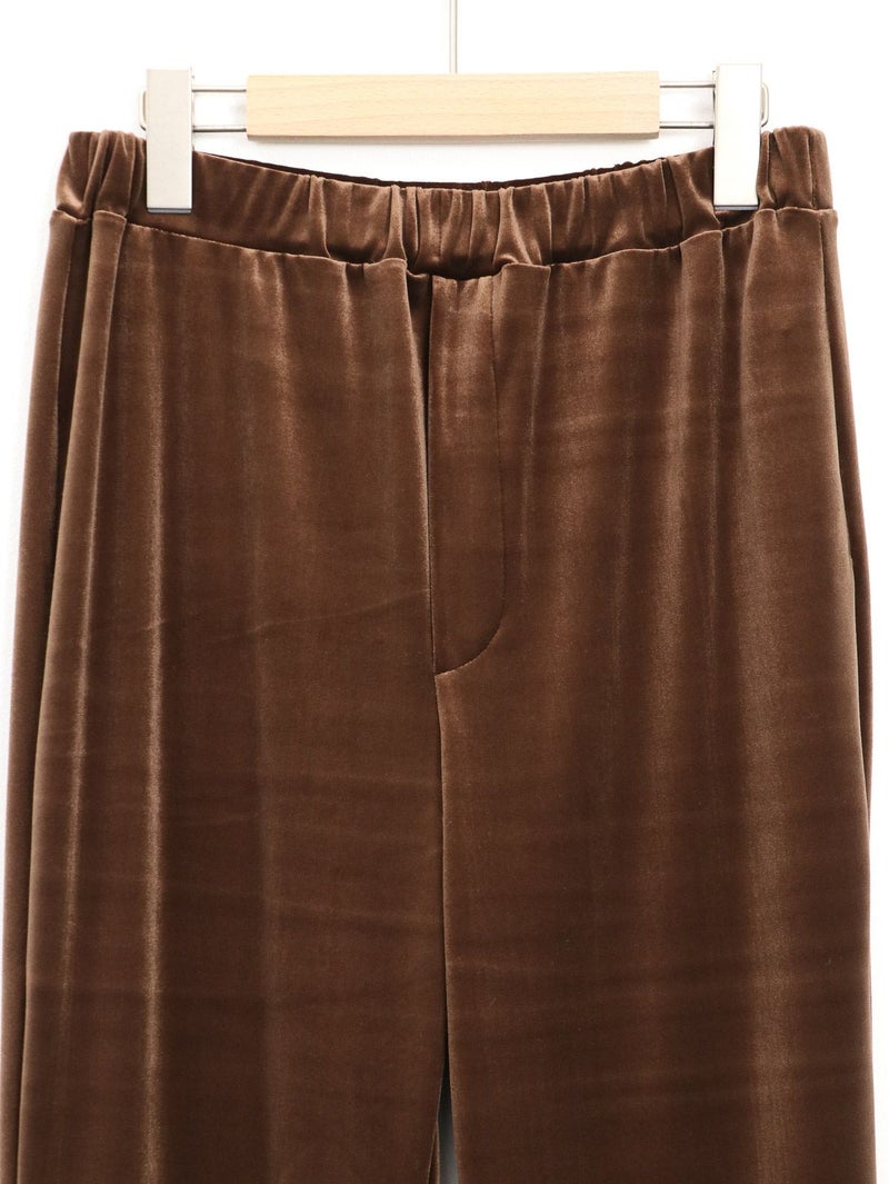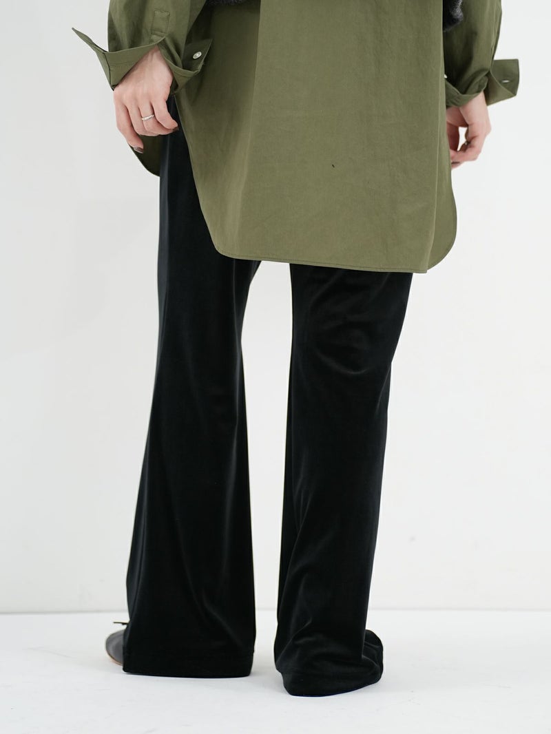 別注のベロアフレアパンツ。 重ね着アイテムとして便利だったリブパンツよりも緩めのシルエットで着やすくなりました。重厚感のある見た目にもかかわらず従来のベロアよりも膨らみと柔らかさが特長のベロア生地を使用。スウェットやサーマル、ダウン系のカジュアルなアイテムに合わせた大人カジュアルなスタリングがおすすめです。