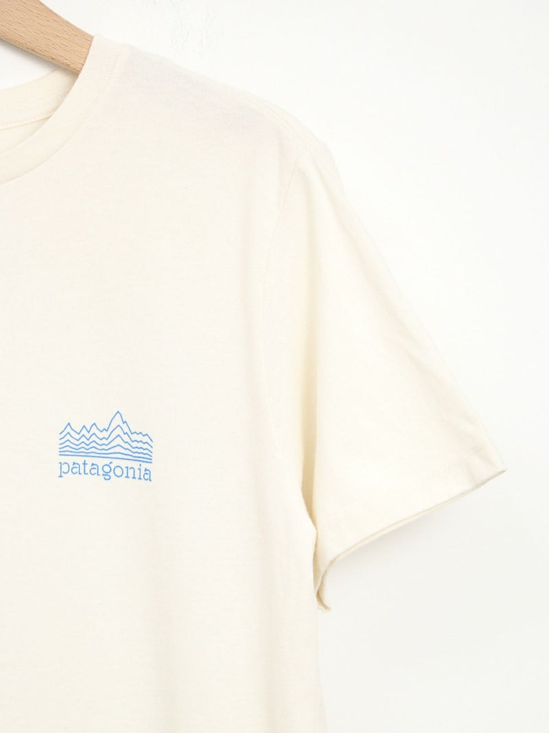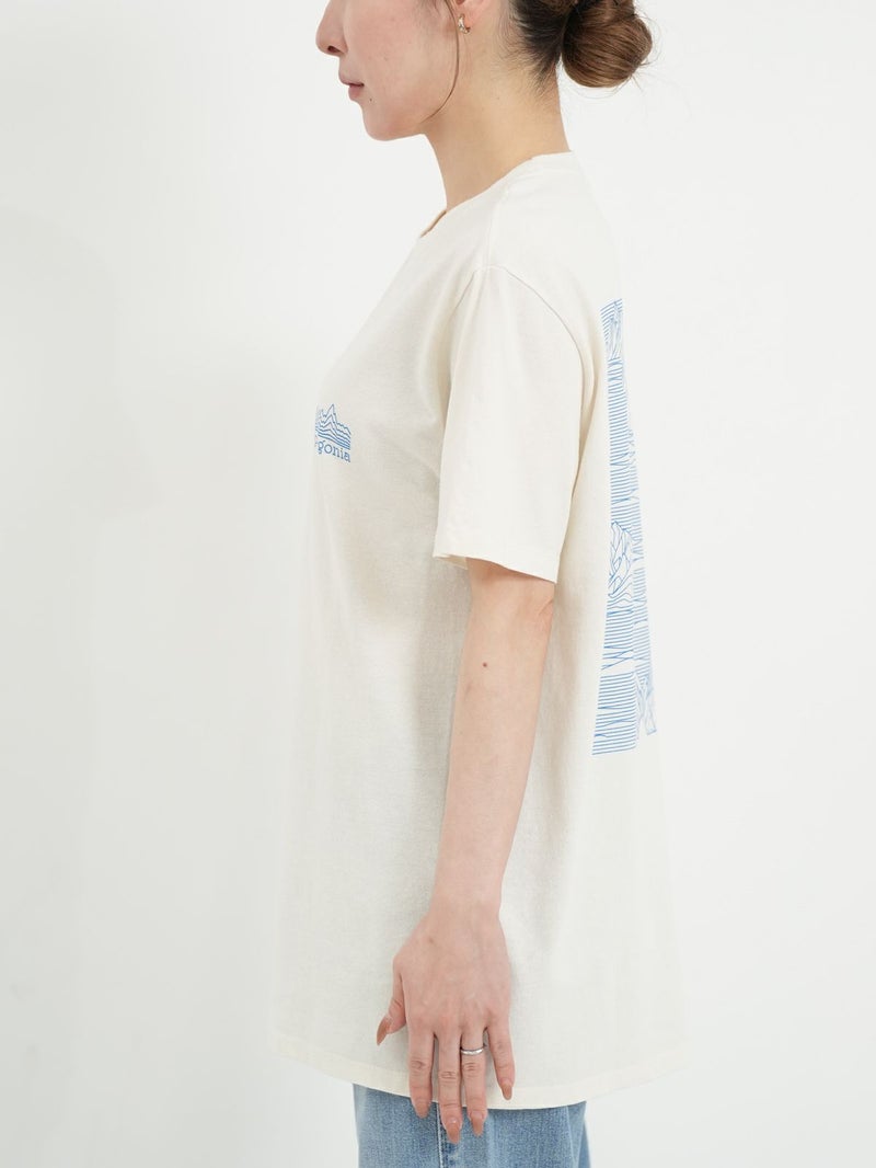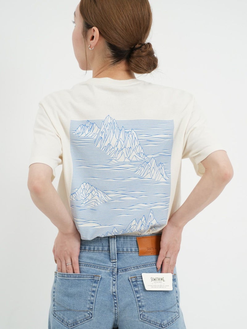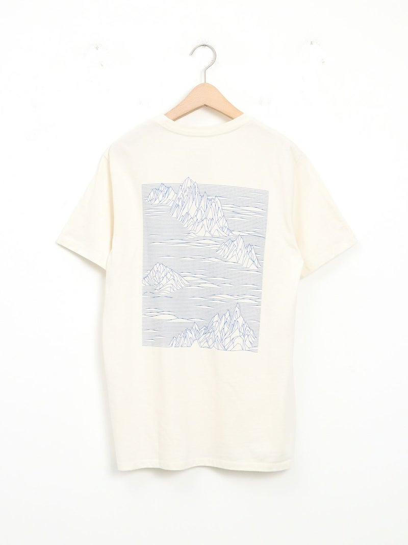 リサイクル素材でつくられたTシャツ。 雲海の上に浮かぶフィッツロイを線だけで表現したシンプルな1枚。ボトムにインしてもそのままでも着用可能なストレートな裾で幅広いコーディネートに馴染みます。工場の従業員にプレミアム賃金が支払われるフェアトレード・サーティファイドの工場で製造されています。
