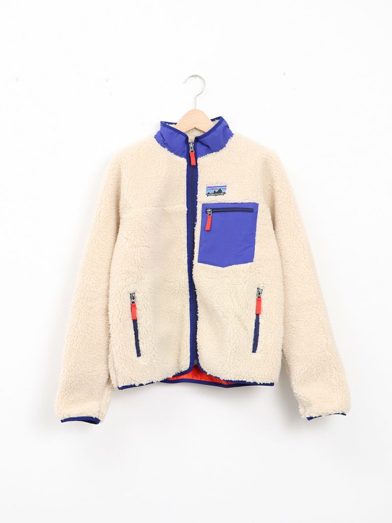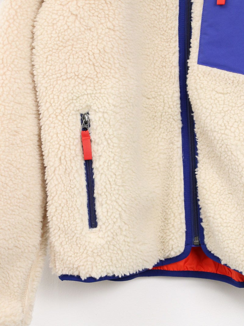 防風性と保温性を提供するキッズ用のレトロX・ジャケット。 リサイクル・ポリエステル素材の定番フリースジャケット。タフタの裏地付きで滑りも良く、防寒性も◎キッズらしいカラーリングが魅力でスタイリングのアクセントになります。