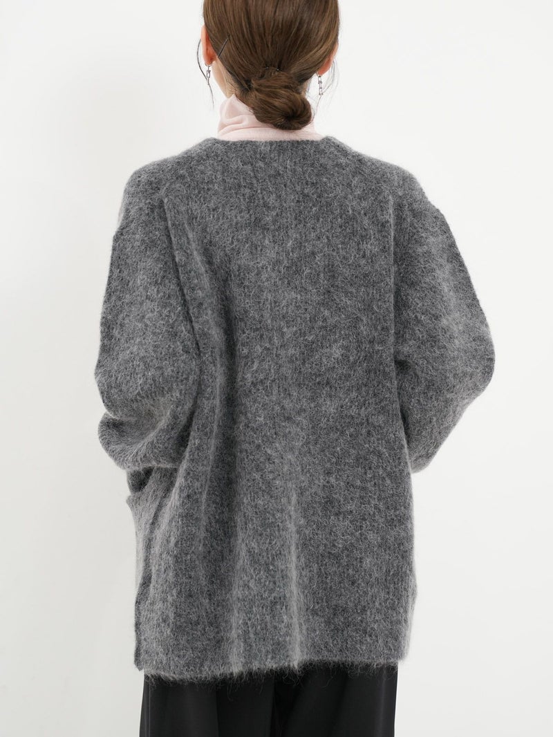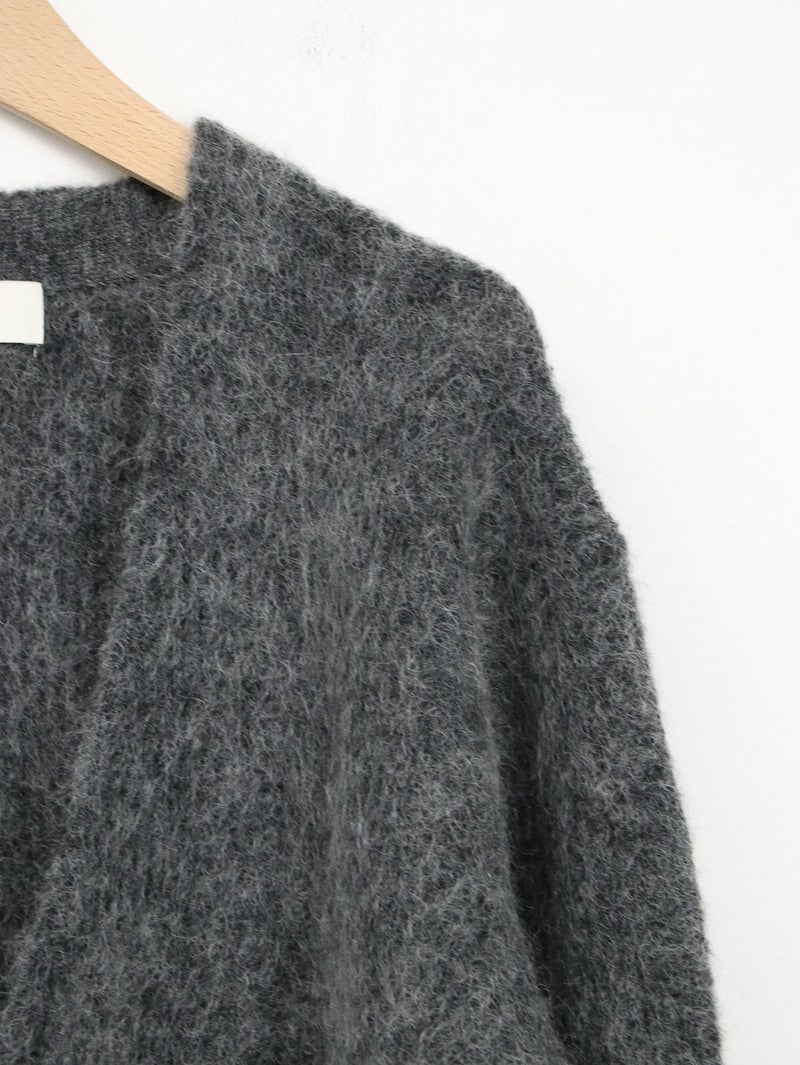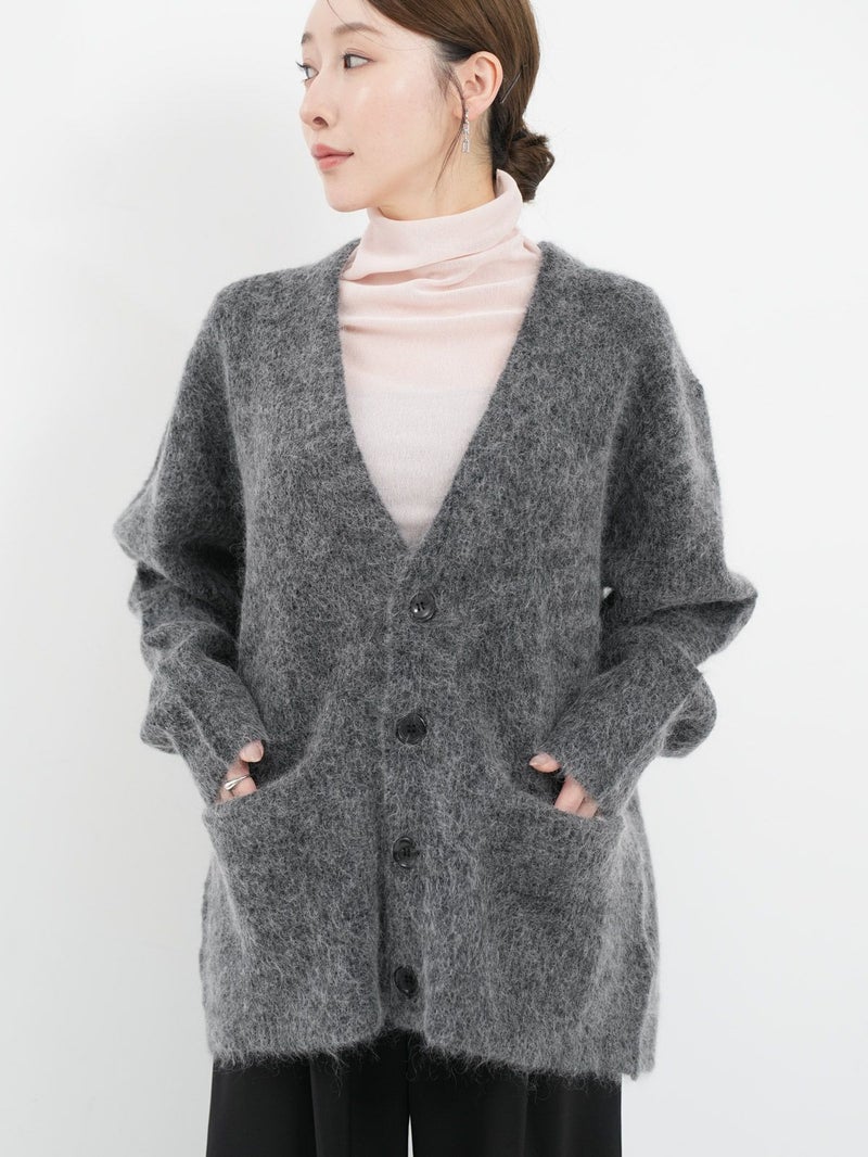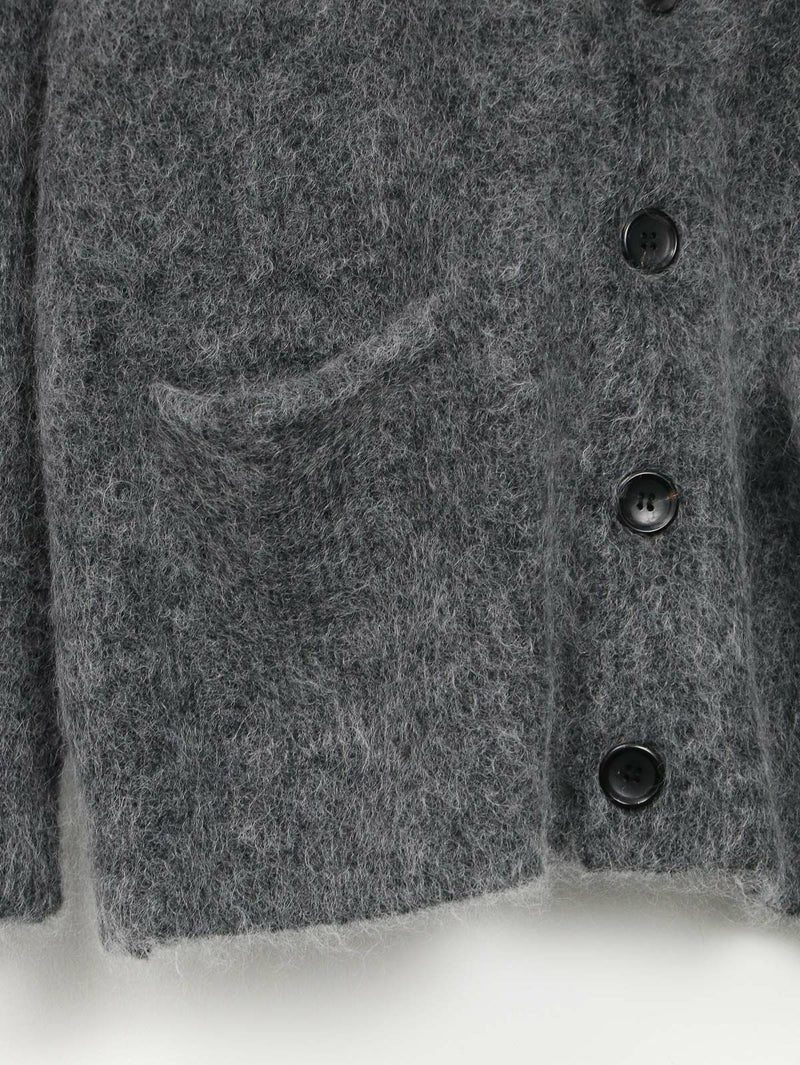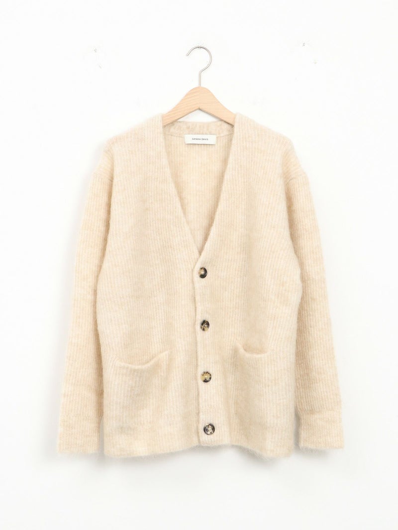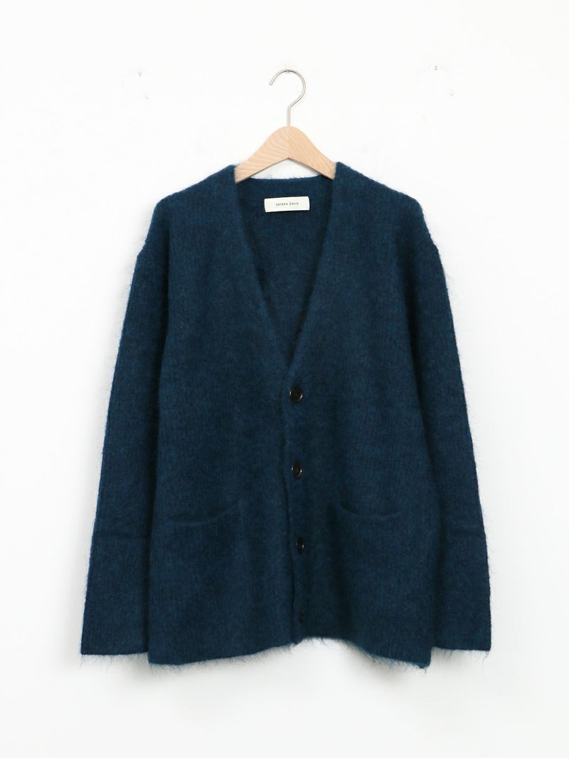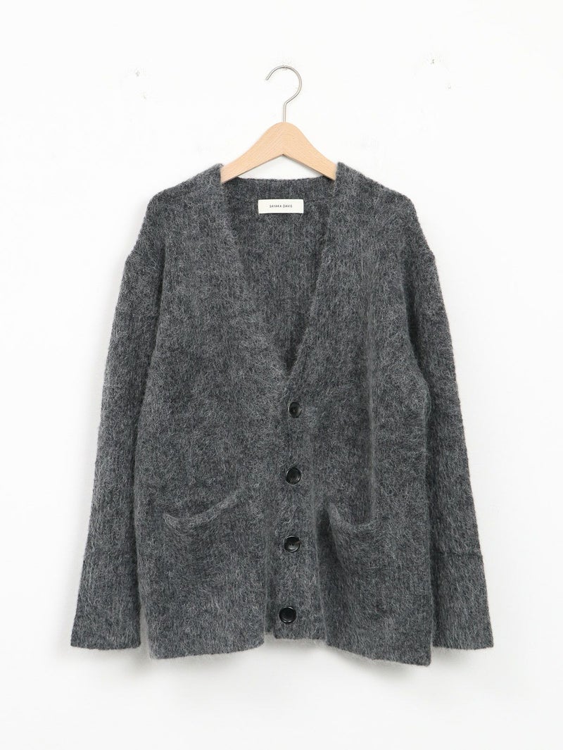 SAYAKA DAVISのセグニチャー、モヘアシリーズの定番Vネックカーディガン。 ジェンダーレスで着られるよう、オーバーサイズで裾幅をゆったりとったボクシーなシルエットに。軽くて柔らかく、温かいこの素材は、ピリングも起こしにくく、着心地の良さからつい手に取ってしまうような一着です。一枚でも、シャツを重ねても、様々なスタイリングに馴染むエブリデイピースです。