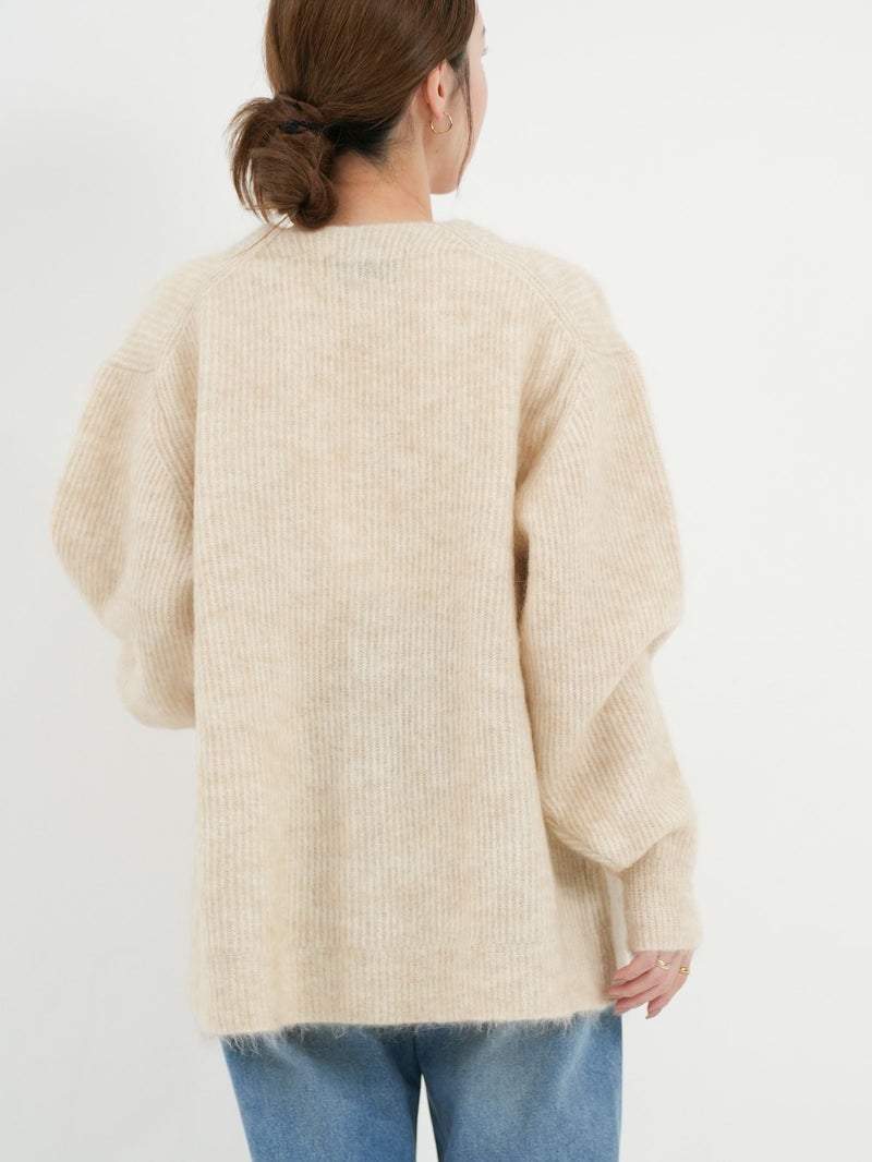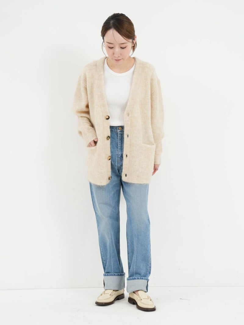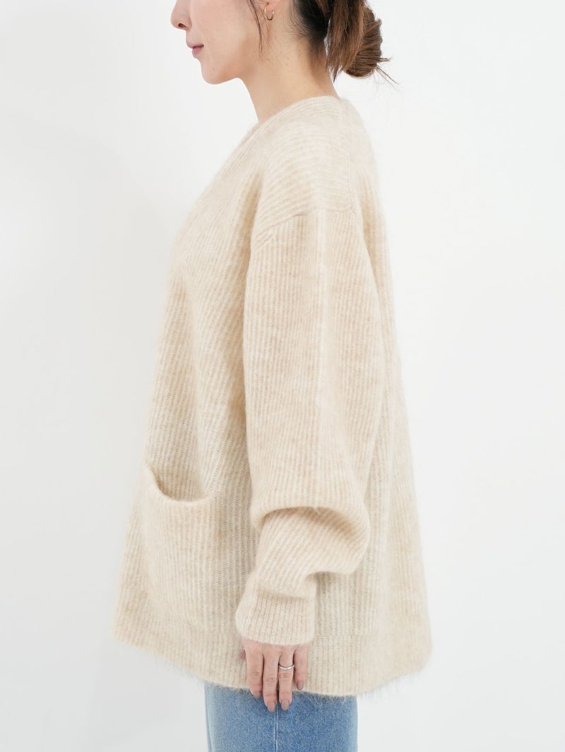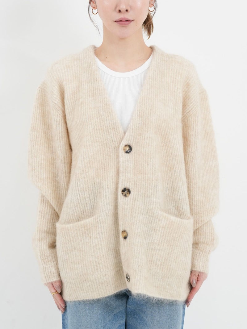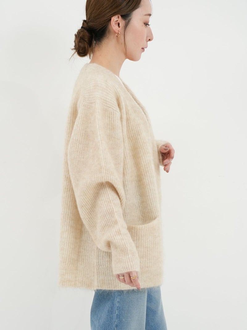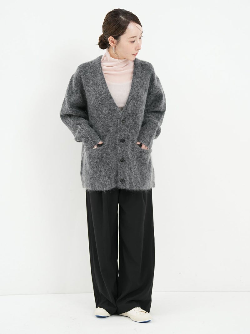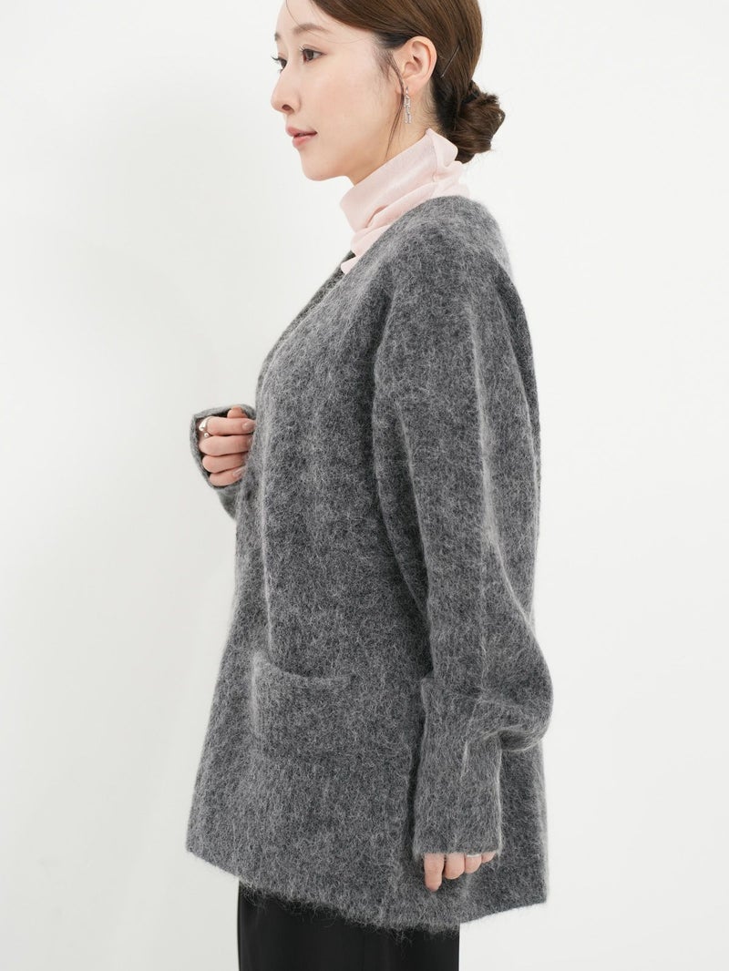 SAYAKA DAVISのセグニチャー、モヘアシリーズの定番Vネックカーディガン。 ジェンダーレスで着られるよう、オーバーサイズで裾幅をゆったりとったボクシーなシルエットに。軽くて柔らかく、温かいこの素材は、ピリングも起こしにくく、着心地の良さからつい手に取ってしまうような一着です。一枚でも、シャツを重ねても、様々なスタイリングに馴染むエブリデイピースです。