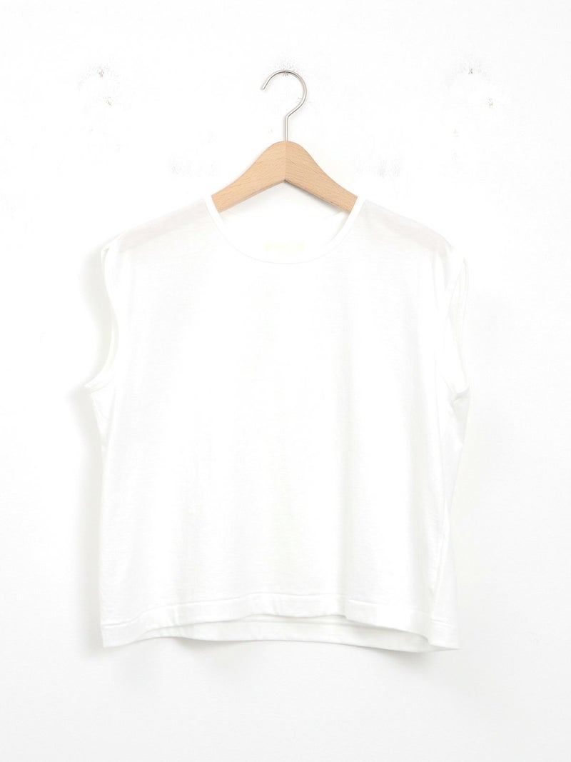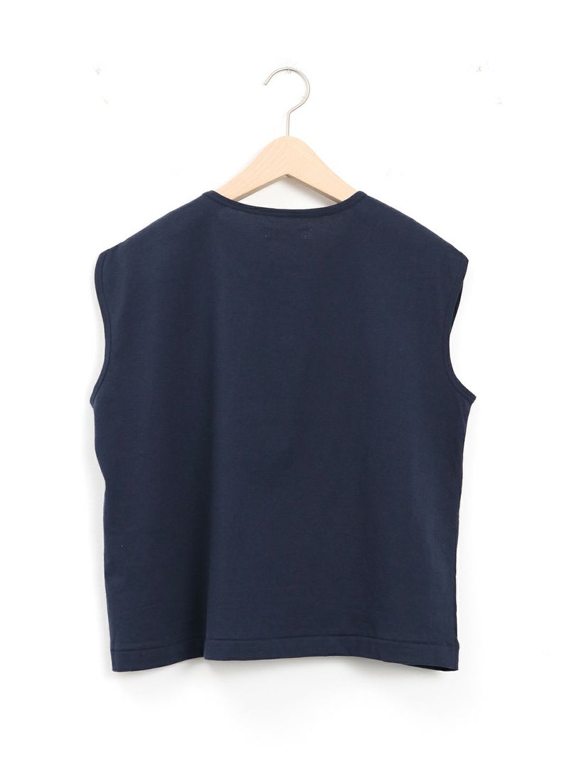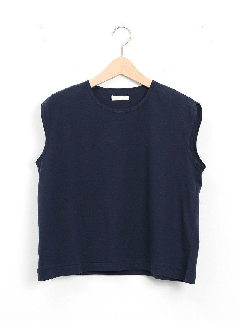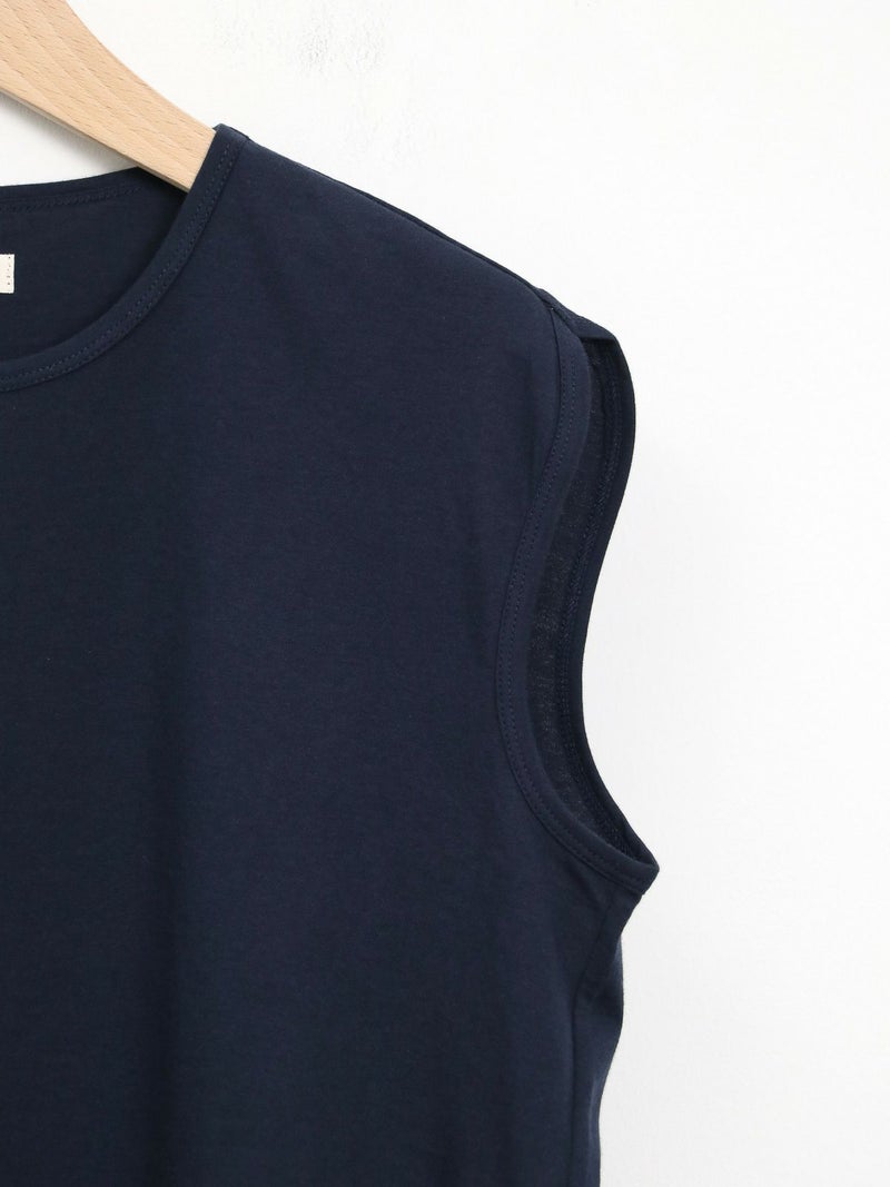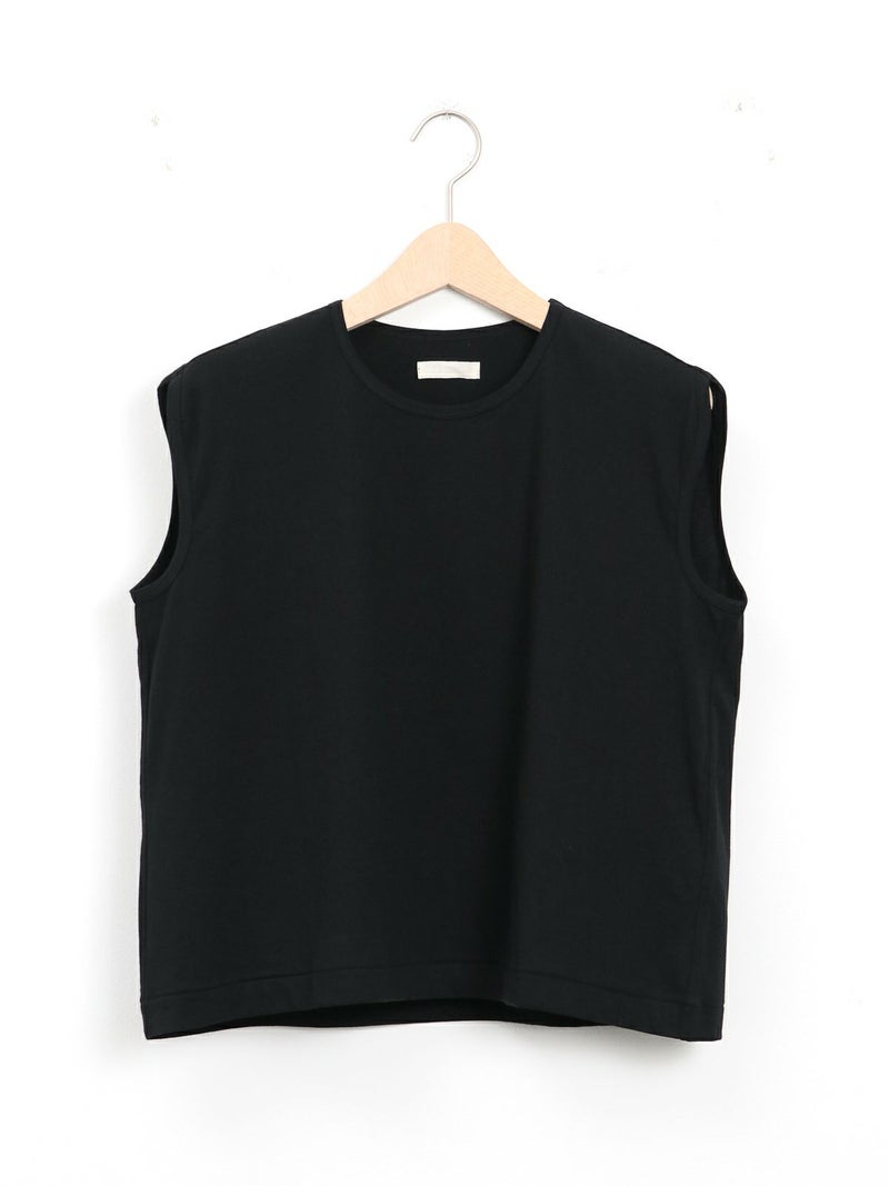 ハイゲージ天竺ジャージ素材のコットンノースリーブ。 やわらかく肌になじむ100%コットン素材を使用し、軽やかでやや光沢感がありキレイめな印象。 程よいサイズ感で腕部分はややカーブのあるデザインがポイント。多様なスタイルに合わせられるシンプルさが魅力です。