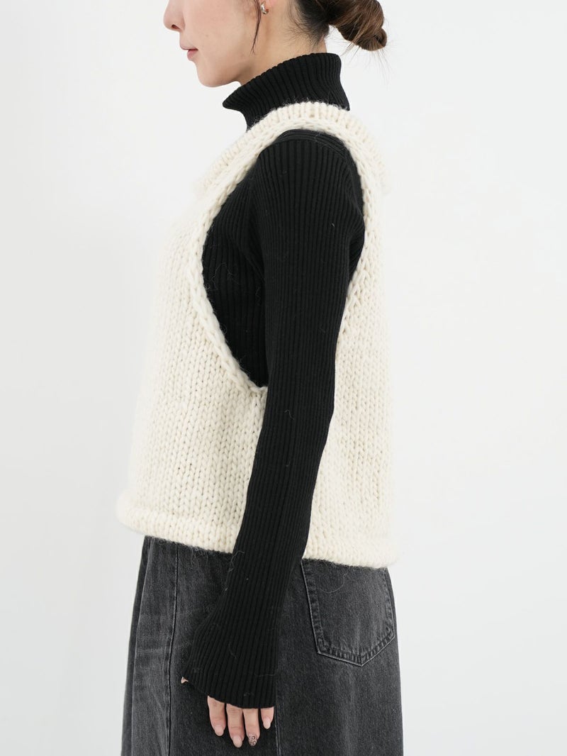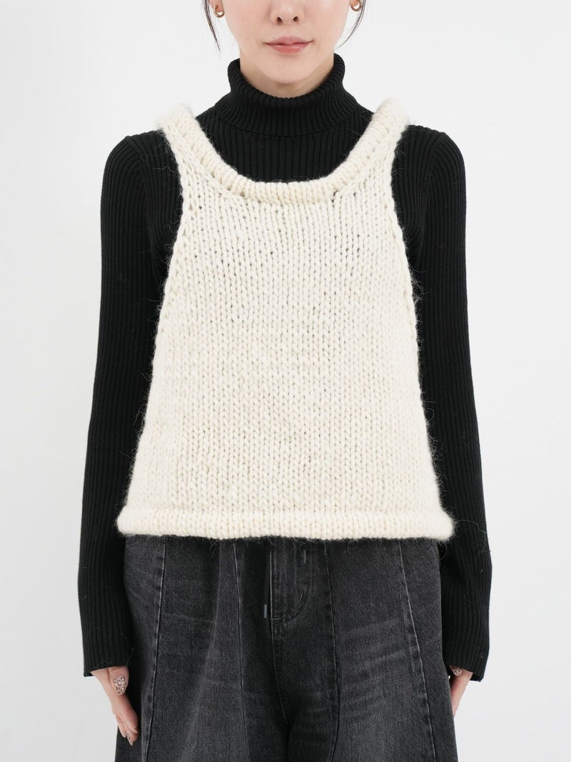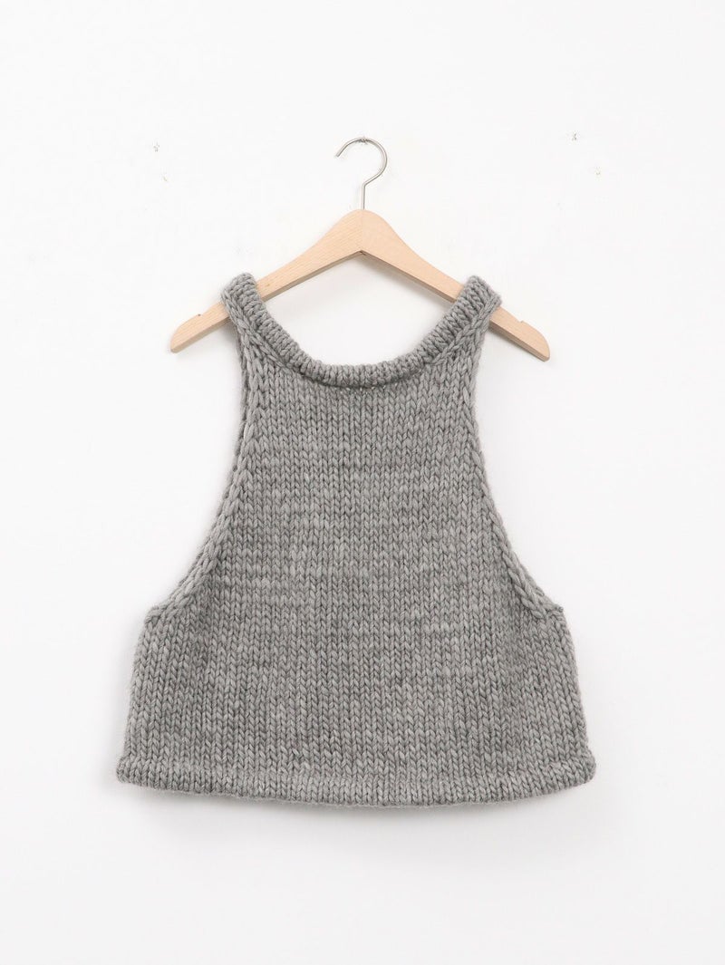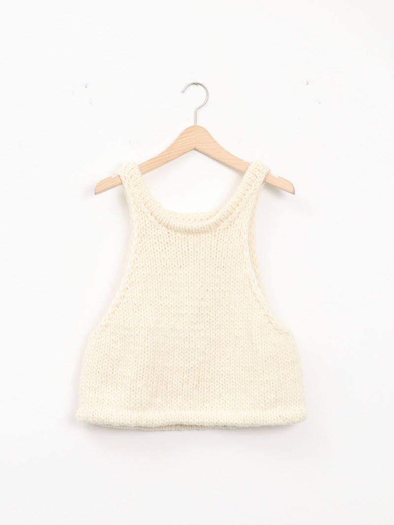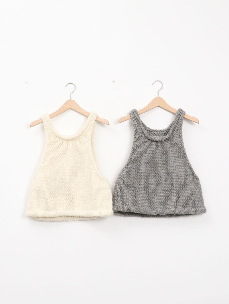 バルキーで軽く暖かくて柔らかいウールアルパカの糸で手編みしたタンクトップ。襟ぐりと袖ぐりが大きく開いているので様々なアイテムと重ね着出来ます。