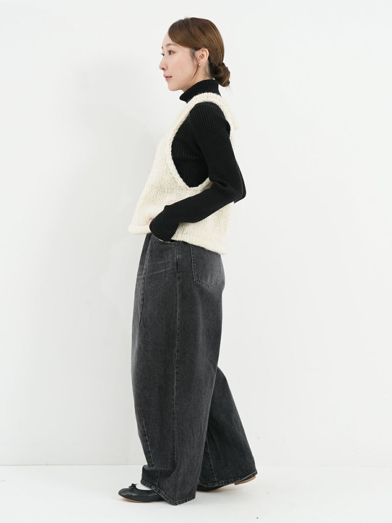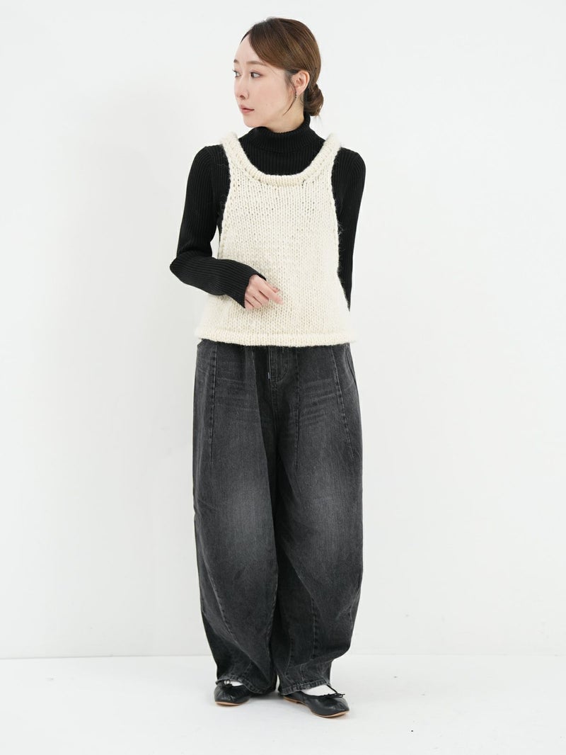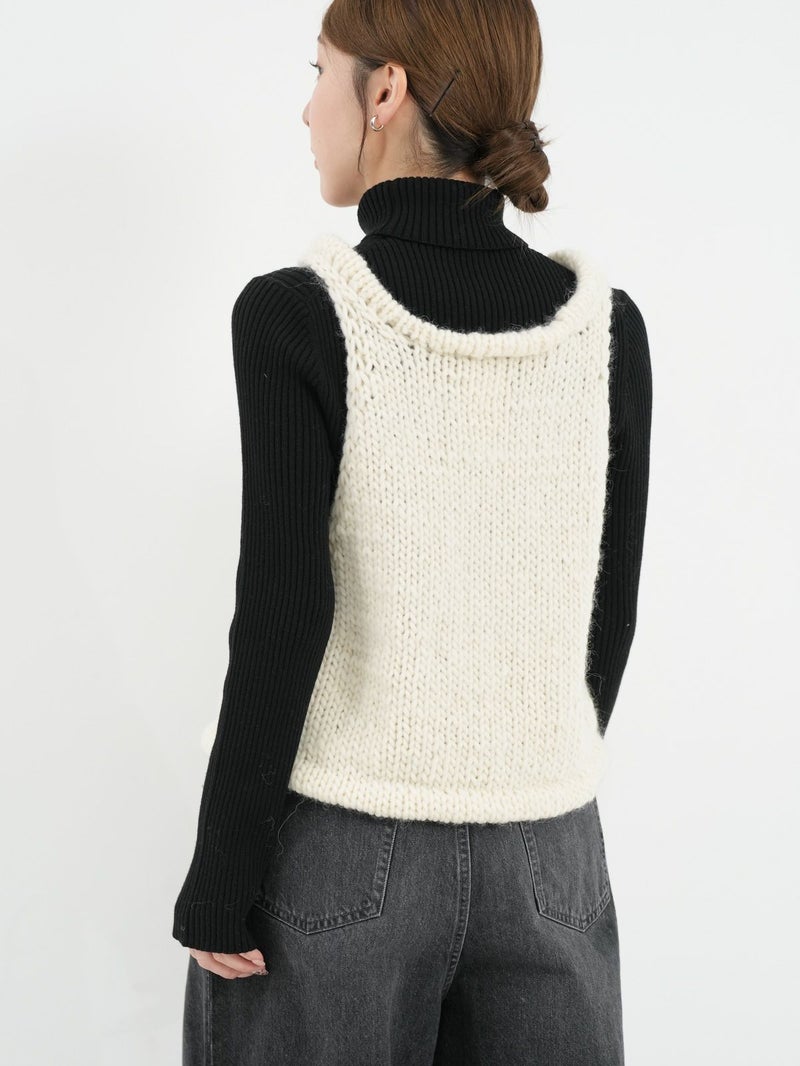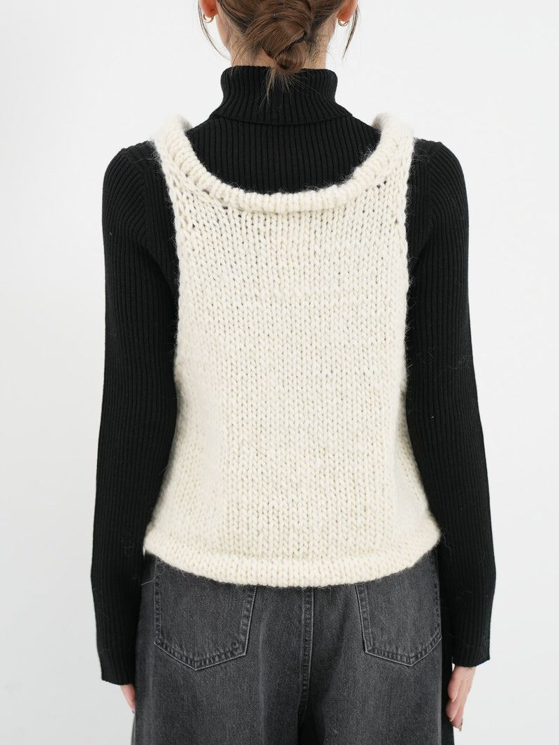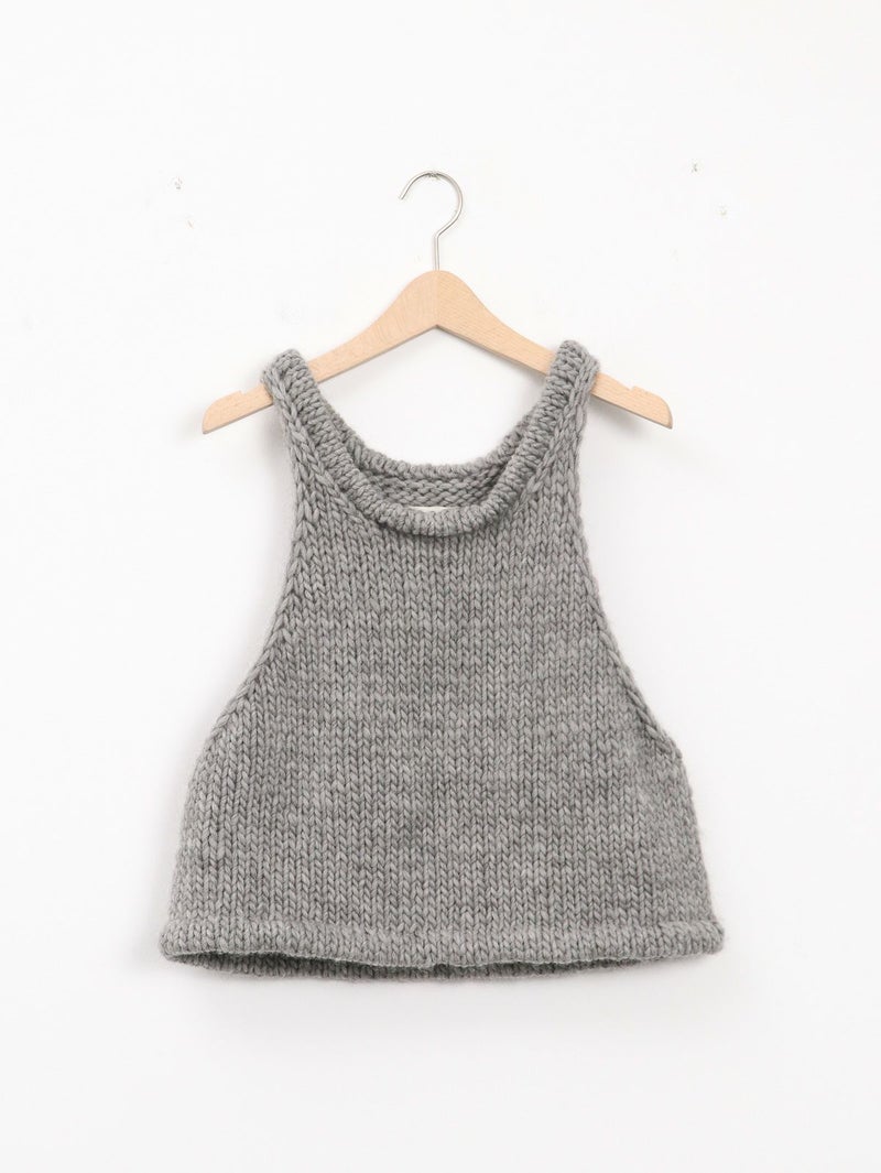 バルキーで軽く暖かくて柔らかいウールアルパカの糸で手編みしたタンクトップ。襟ぐりと袖ぐりが大きく開いているので様々なアイテムと重ね着出来ます。