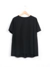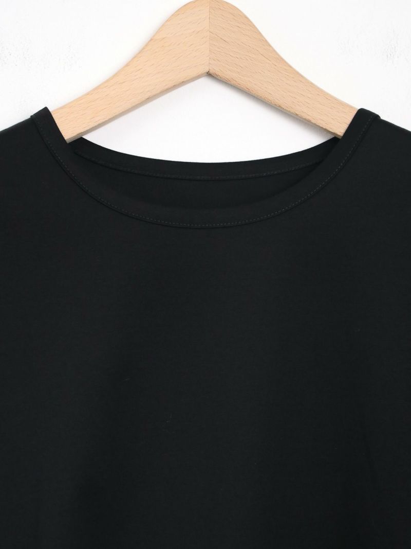 コットン100%ですが毛羽立ちやしわになりにくく、丈夫な素材感になっています。裾がフレアになっているので、アウトかフロントインのスタイルがおすすめ。スカートからワイドパンツまで様々なボトムスに合わせていただけます。