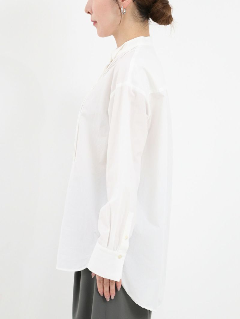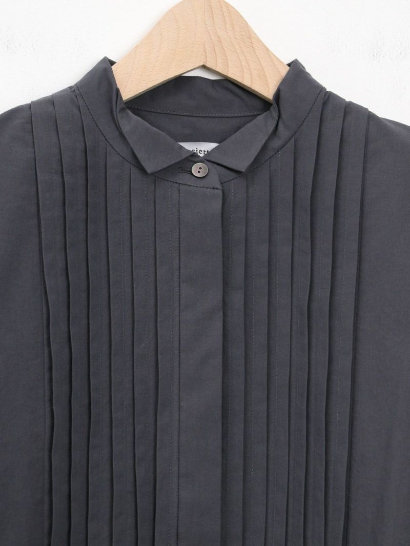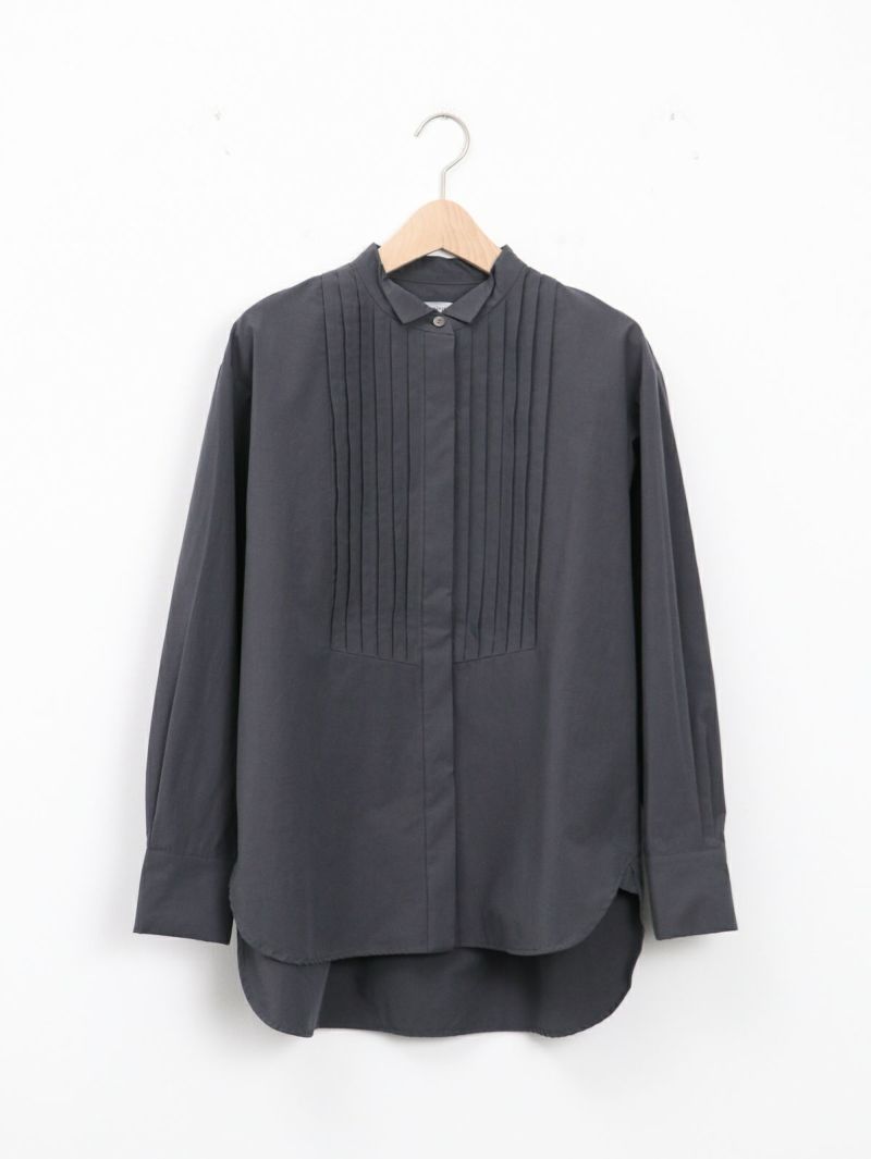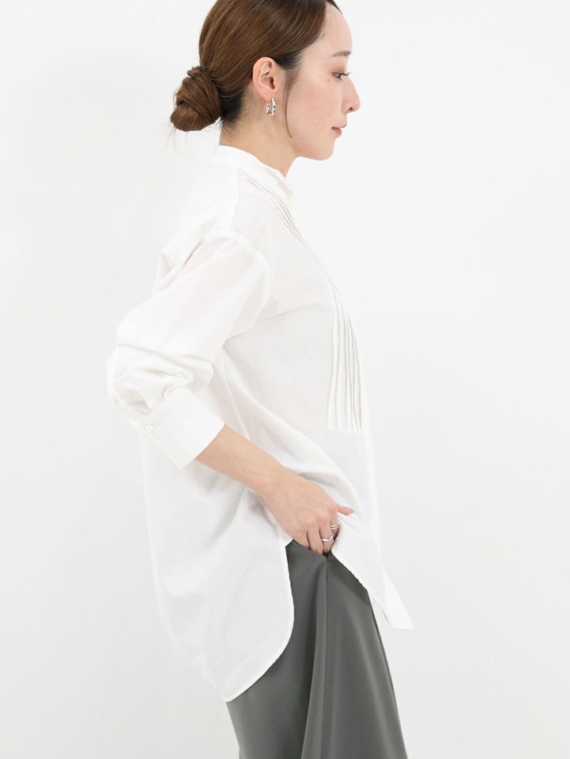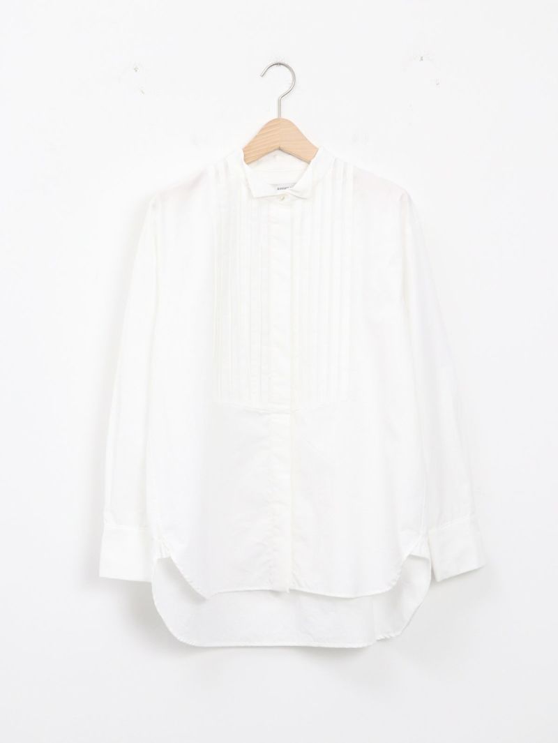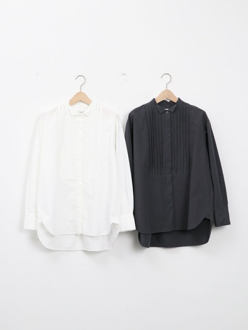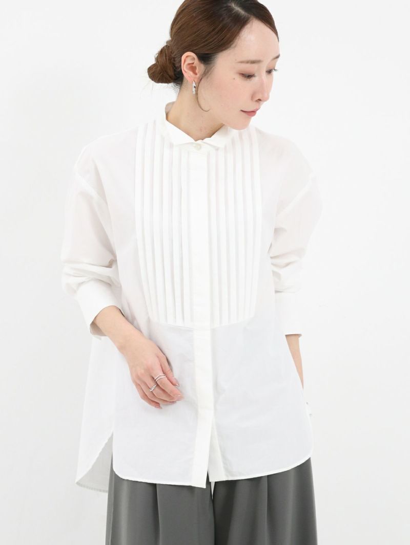 assietteよりオーガニックコットンを使用したピンタックシャツが登場。 胸元のピンタックと襟の形がポイントのシャツ。ベストやジャケットとレイヤードしやすいデザインです。ドレッシーなボトムスとも好相性なのでオケージョンシーンでも活躍します。