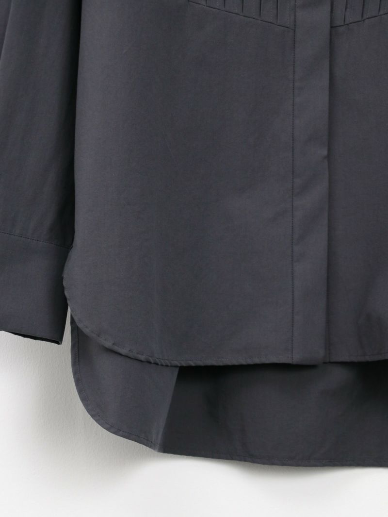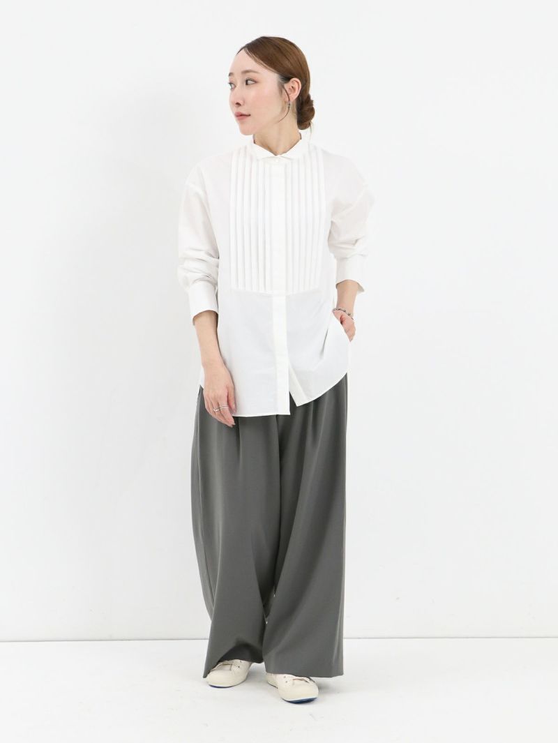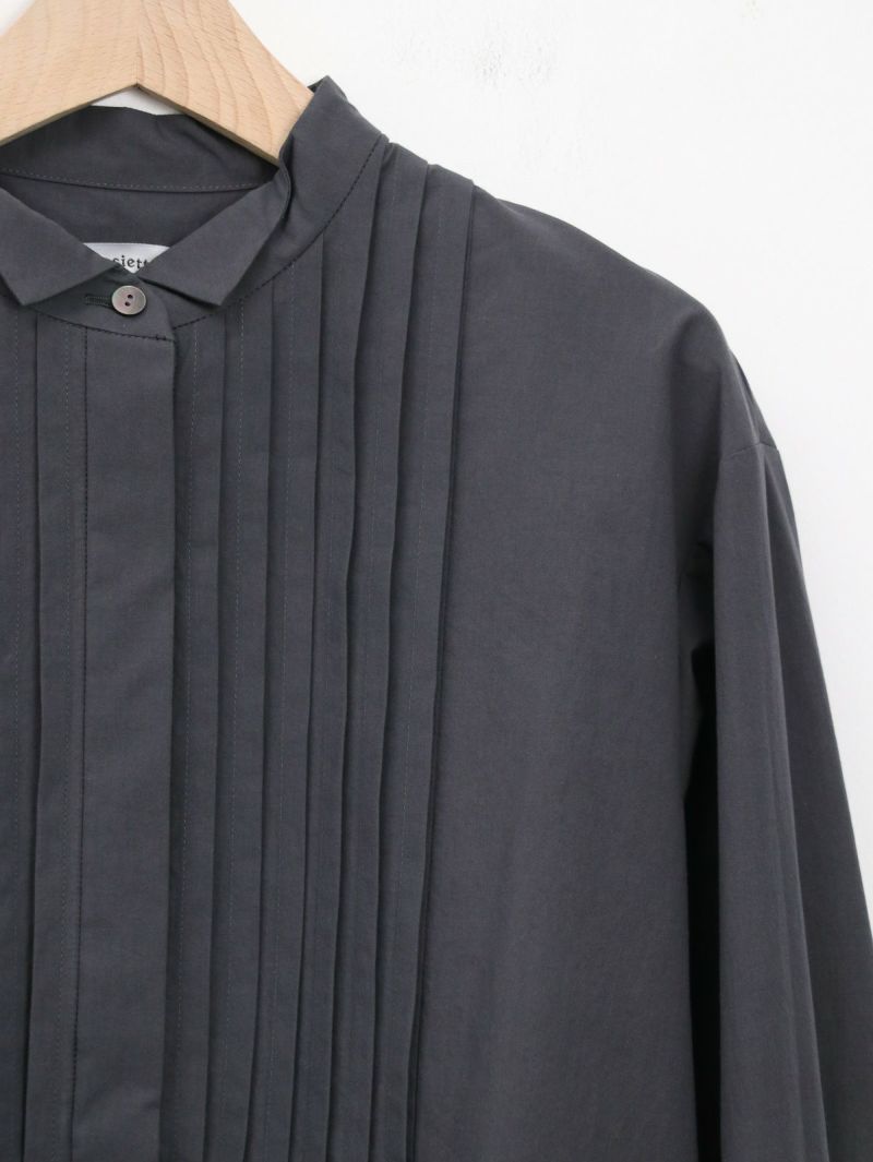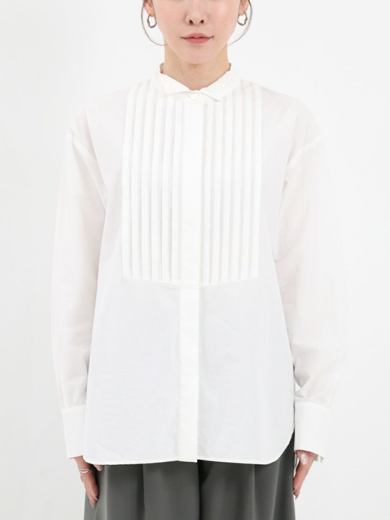 assietteよりオーガニックコットンを使用したピンタックシャツが登場。 胸元のピンタックと襟の形がポイントのシャツ。ベストやジャケットとレイヤードしやすいデザインです。ドレッシーなボトムスとも好相性なのでオケージョンシーンでも活躍します。
