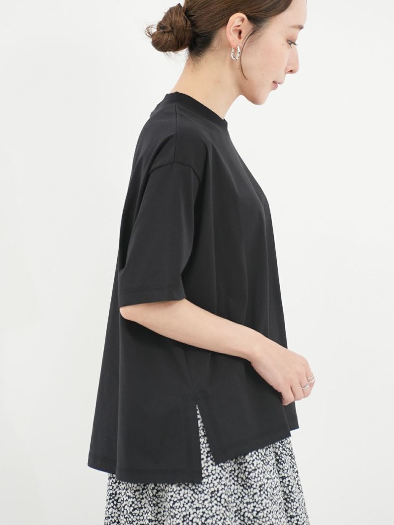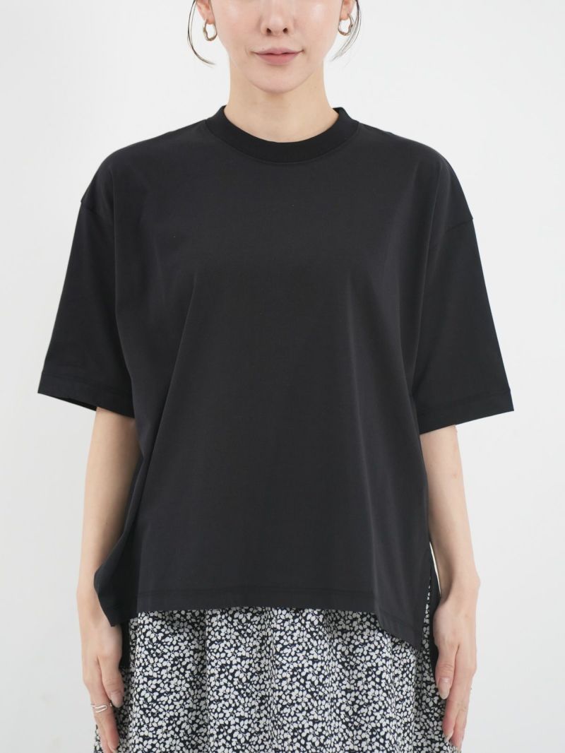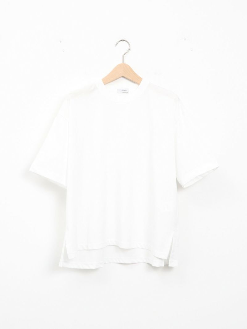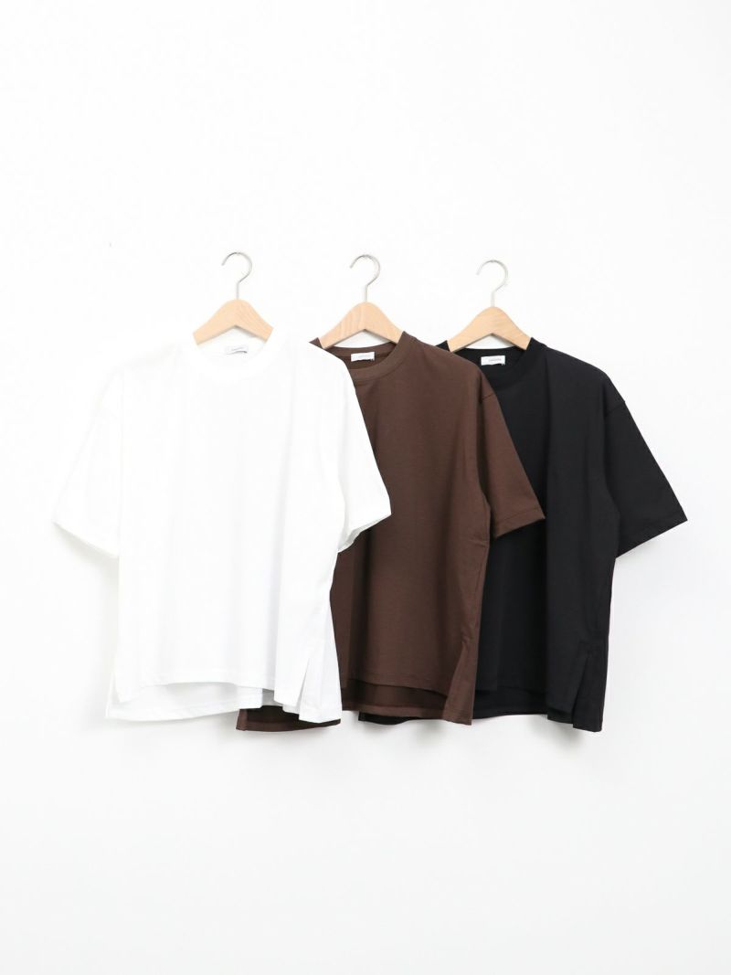 ゆったりとしたサイズ感のシンプルなスリットTシャツ。 ほんの少しAラインにしたシルエットがポイント。真夏でも着やすい乾きやすく肌当たりがさらりと涼しい素材を使用。型崩れしにくいところも◎