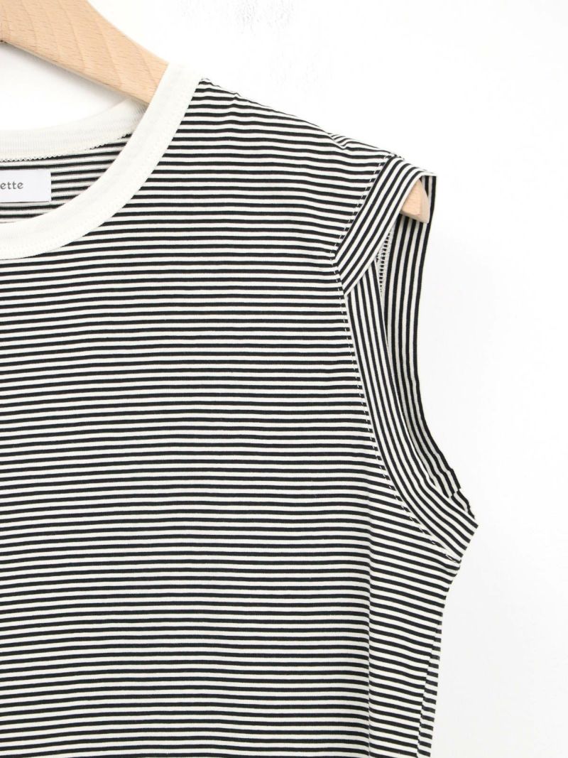 assiette人気の定番ノースリーブボーダー。 クリアな質感で綺麗な印象のカットソー。アームホールのさりげないデザインがポイント。1枚で着ても、インナーとしてもおすすめです。