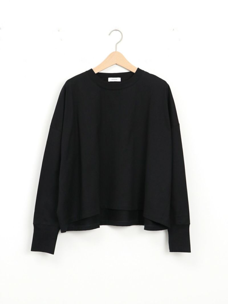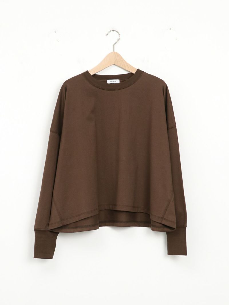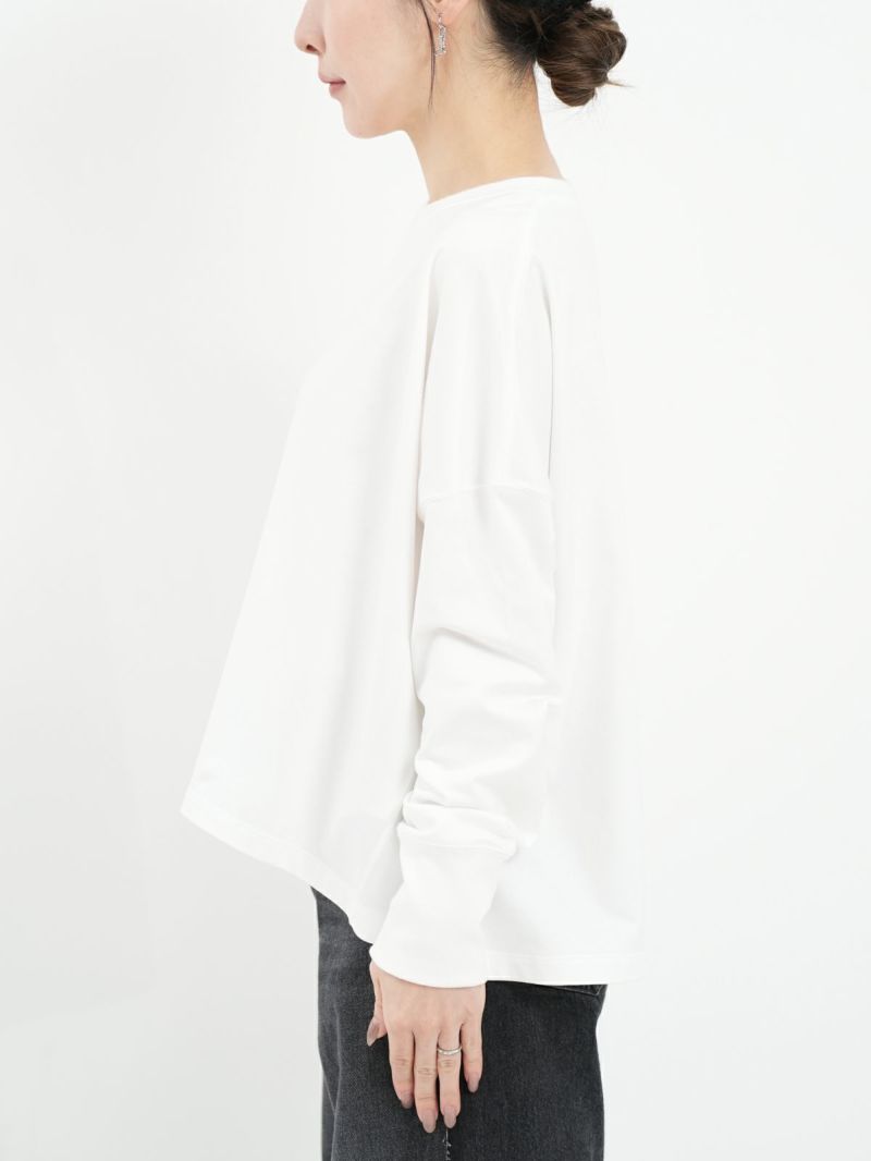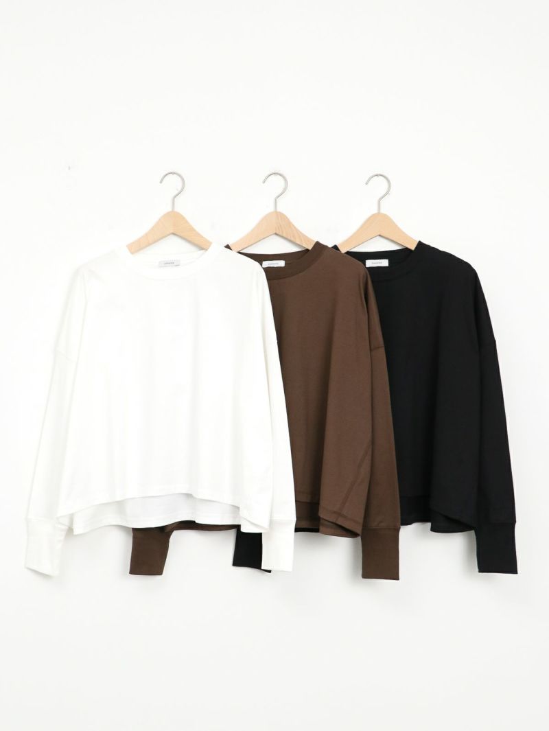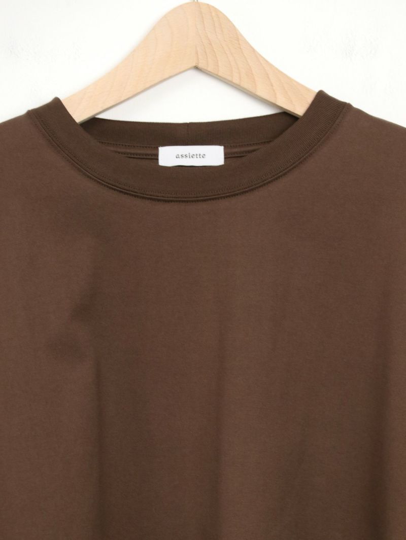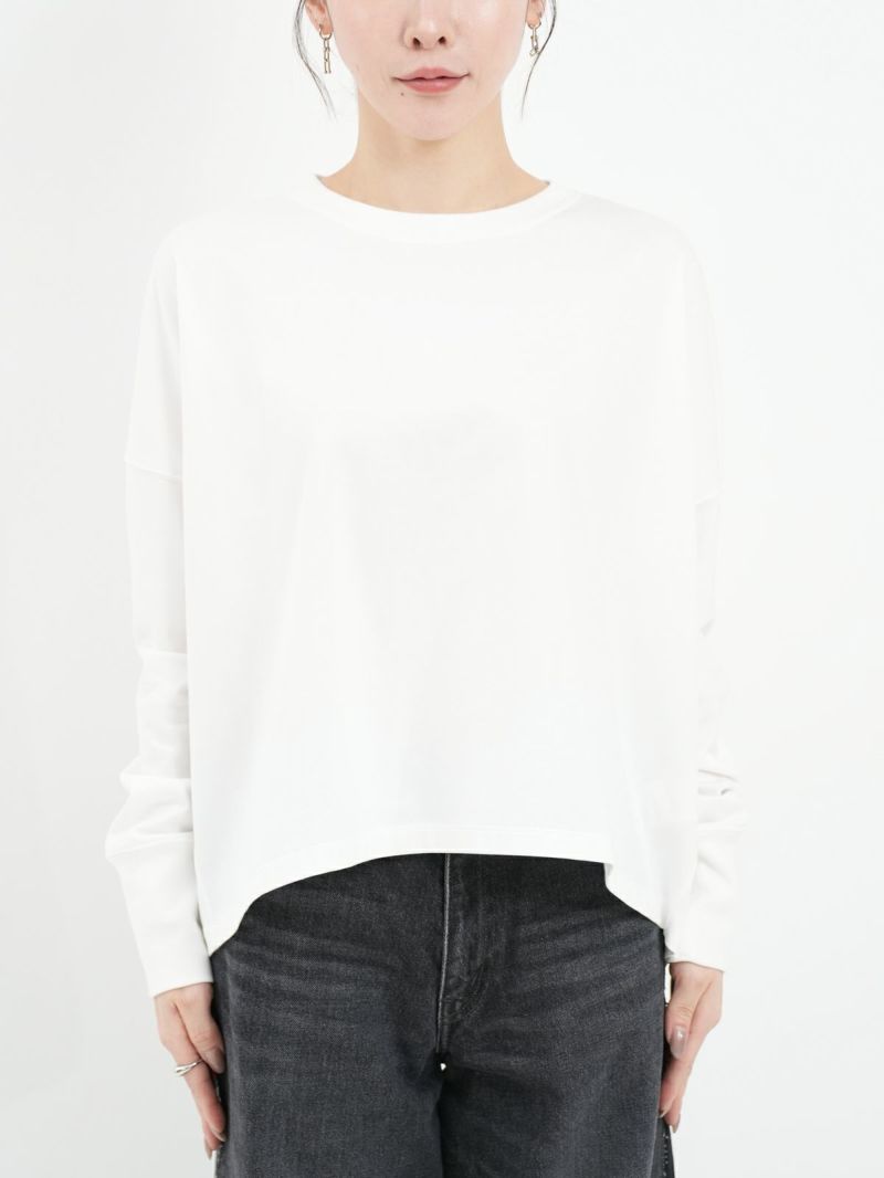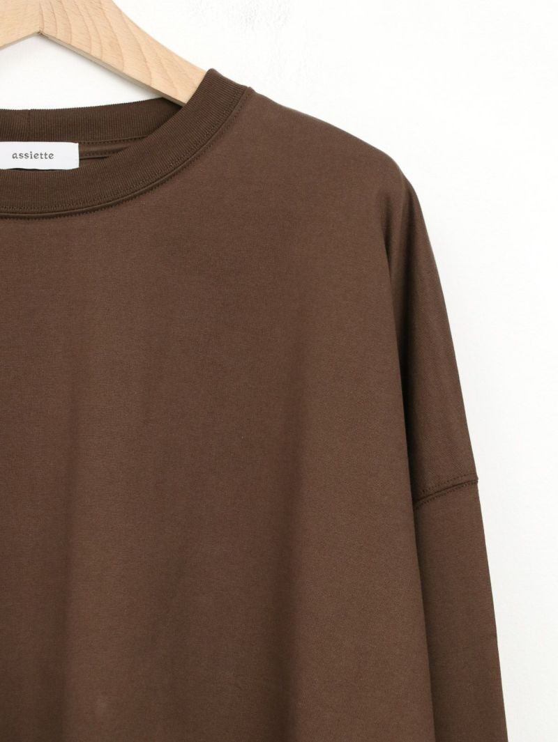 assietteのコットン100%の天竺素材のカットソー。 上品な光沢、柔らかな肌触りで着心地抜群です。ドロップショルダー、袖の少し長めのリブ、前後の長さが違うところもポイント!程よい丈感でボトムスを選ばず着回しが効く1枚です。