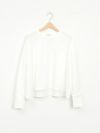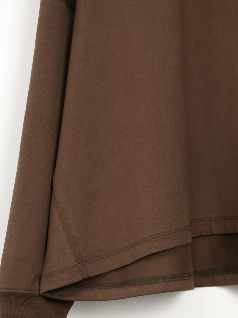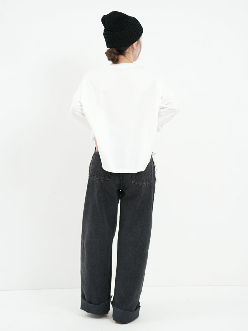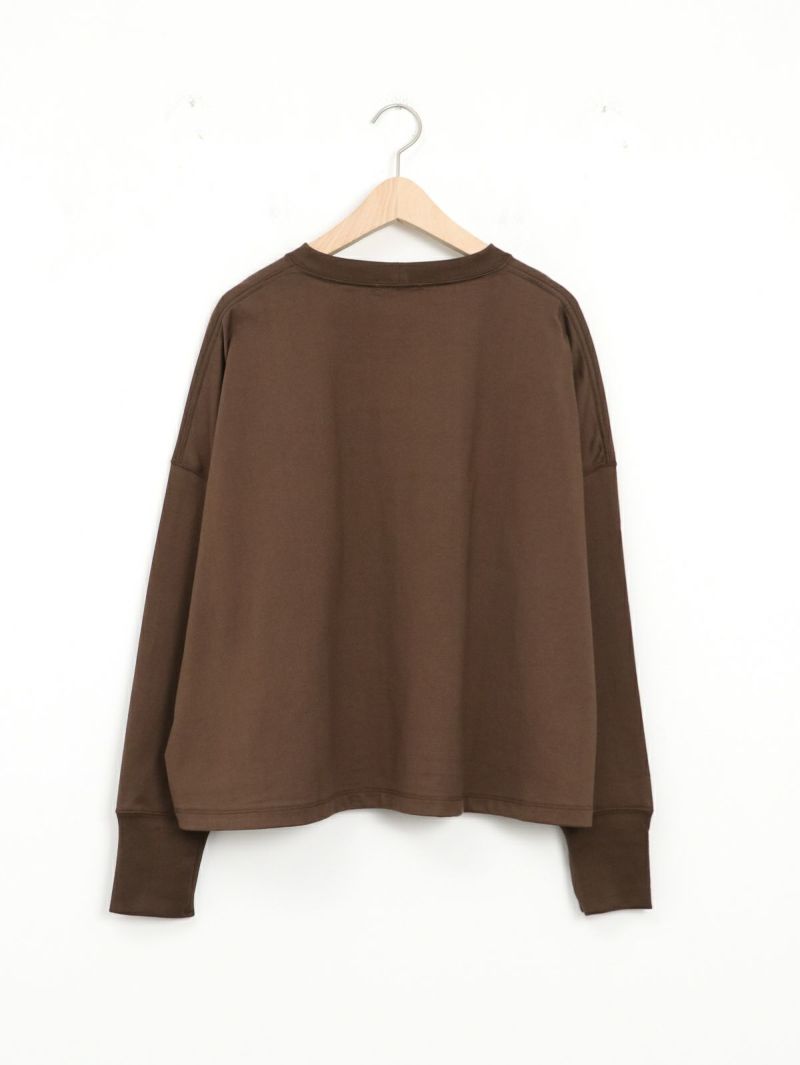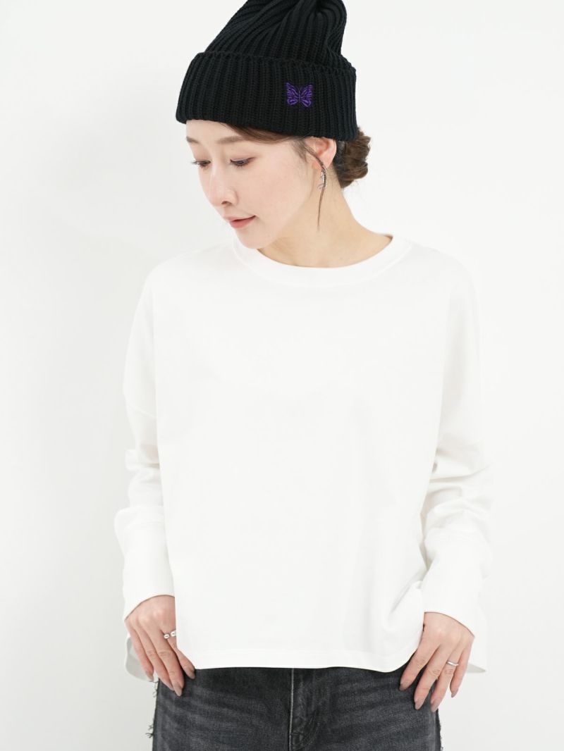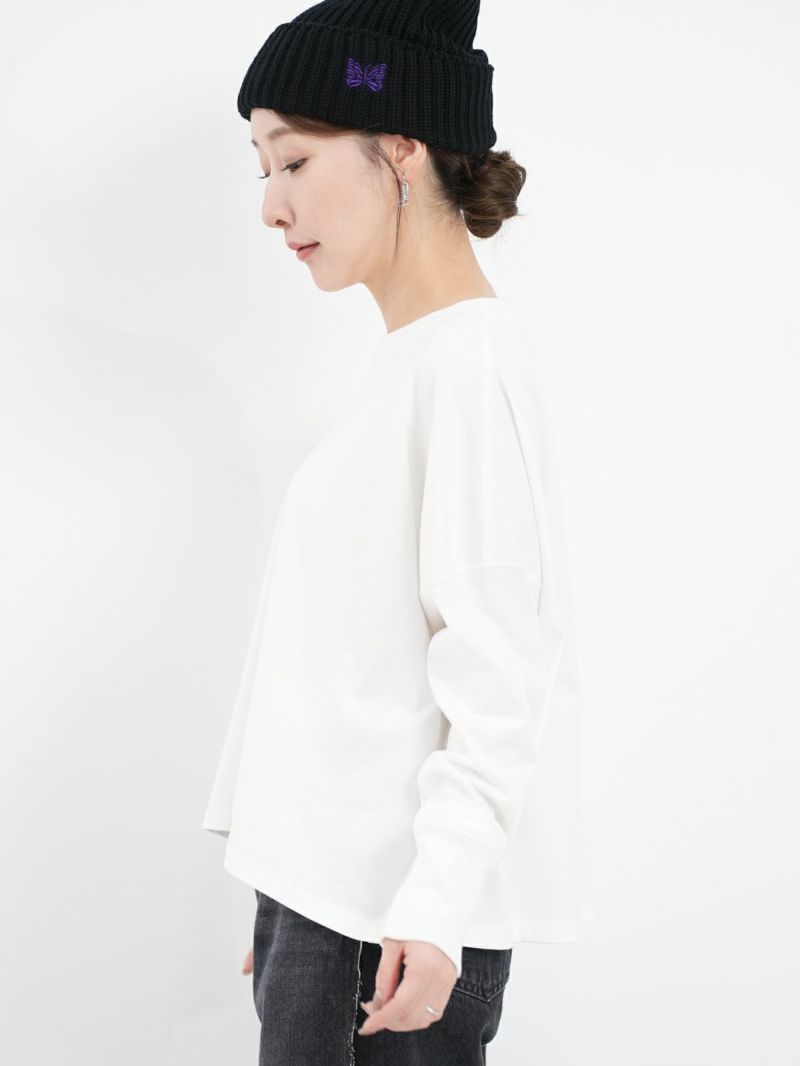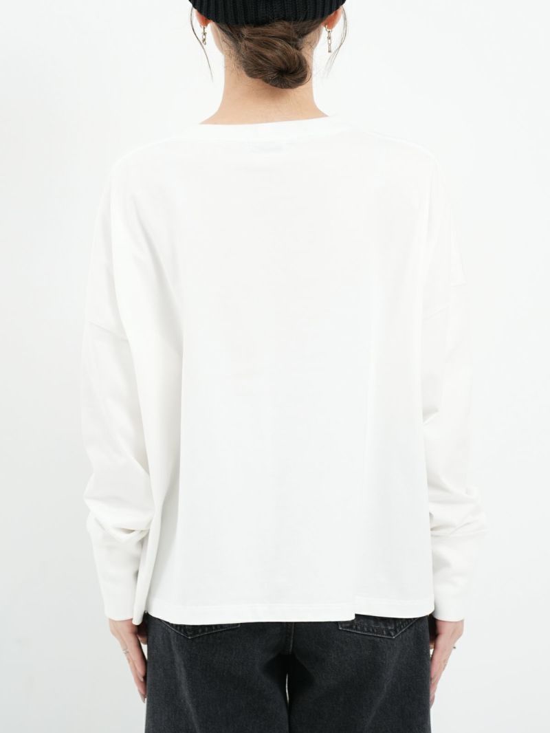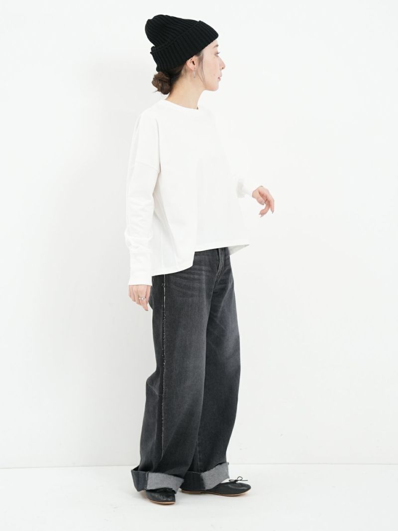 assietteのコットン100%の天竺素材のカットソー。 上品な光沢、柔らかな肌触りで着心地抜群です。ドロップショルダー、袖の少し長めのリブ、前後の長さが違うところもポイント!程よい丈感でボトムスを選ばず着回しが効く1枚です。