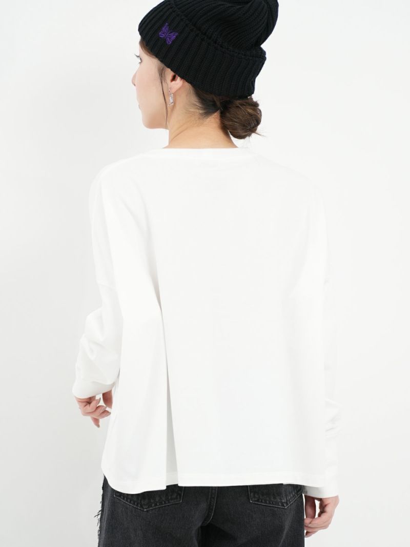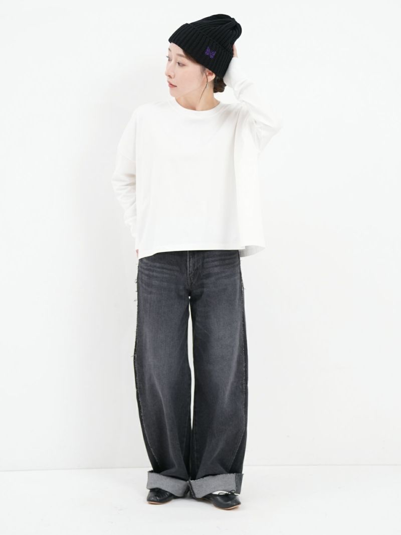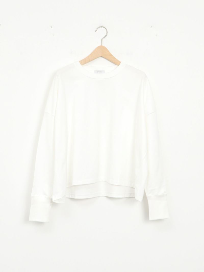 assietteのコットン100%の天竺素材のカットソー。 上品な光沢、柔らかな肌触りで着心地抜群です。ドロップショルダー、袖の少し長めのリブ、前後の長さが違うところもポイント!程よい丈感でボトムスを選ばず着回しが効く1枚です。