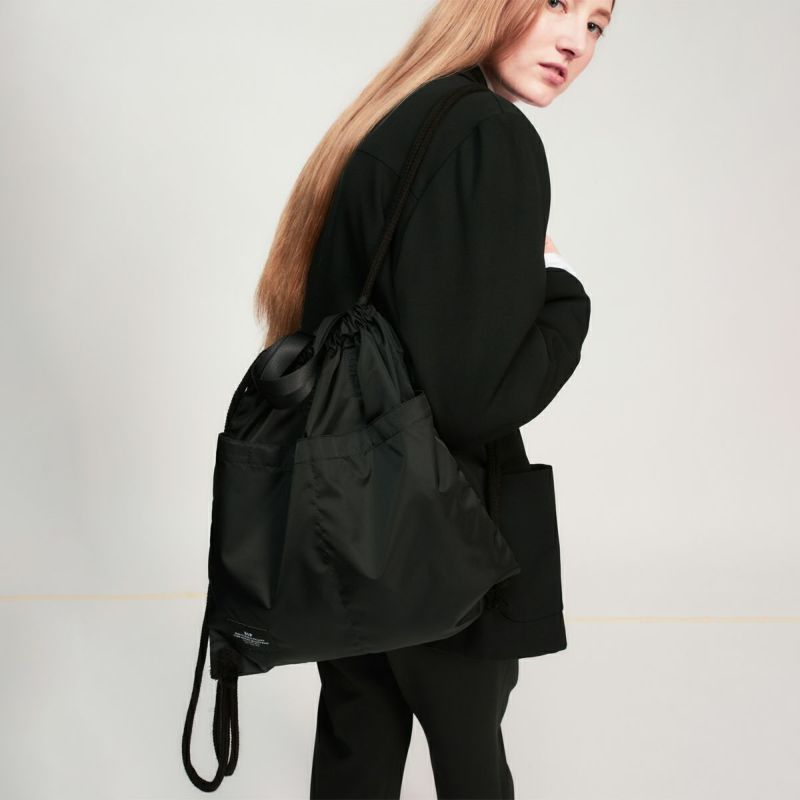 ナイロン素材を使用したナップサック。 外側と内側に仕分けのしやすい大きめのポケットが付いています。また、トップハンドルもあるため、手持ちと2way使用が可能です。光沢のあるしっかりとしたナイロンボディーでオンオフ使用して頂けます。