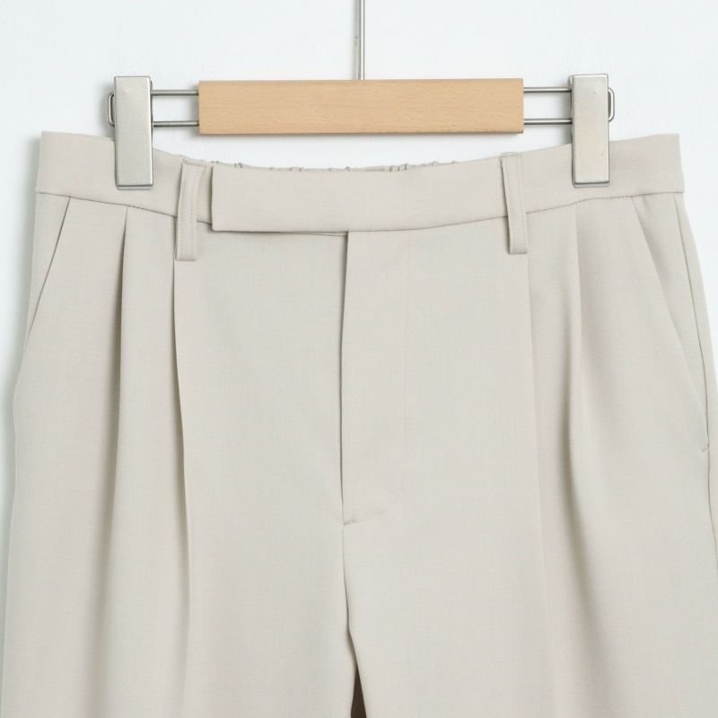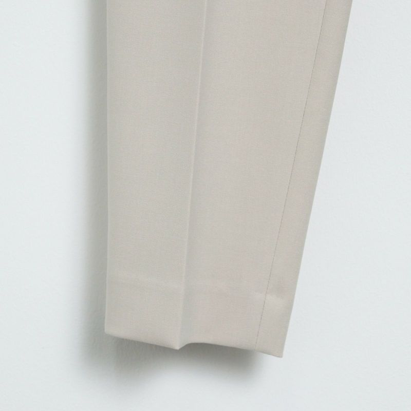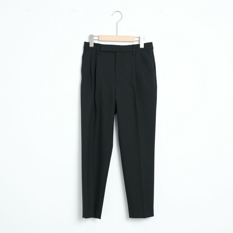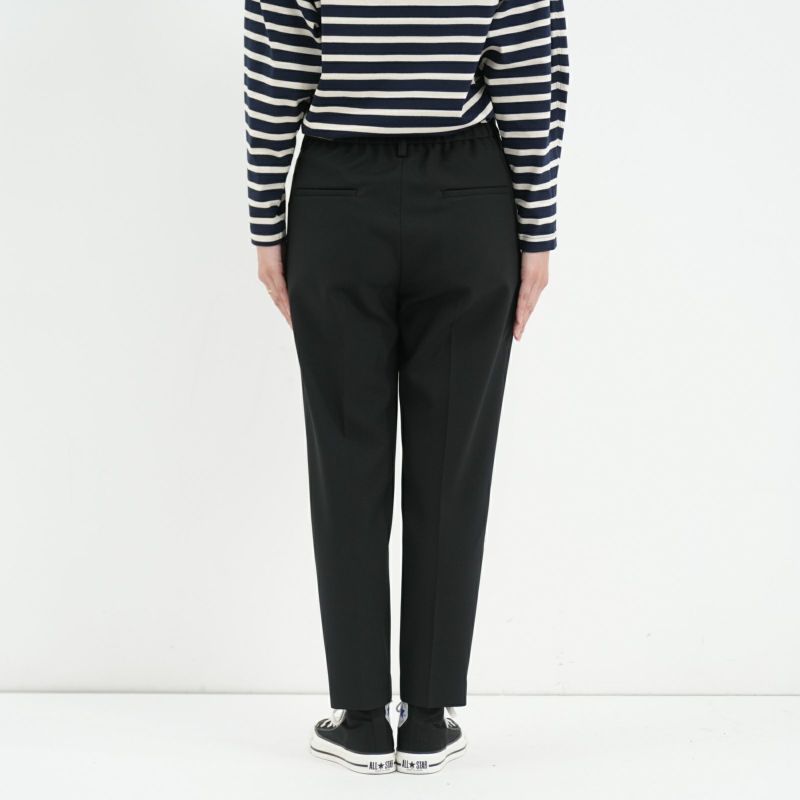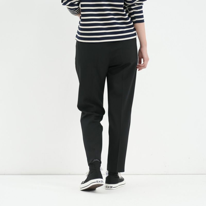 タック入テーパードパンツ。 ポリエステル100%で若干ストレッチも効いています。ジャケットやニットで綺麗めにも、ボーダーでカジュアルにも使えて、春先の急なおでかけにも重宝する一枚です。