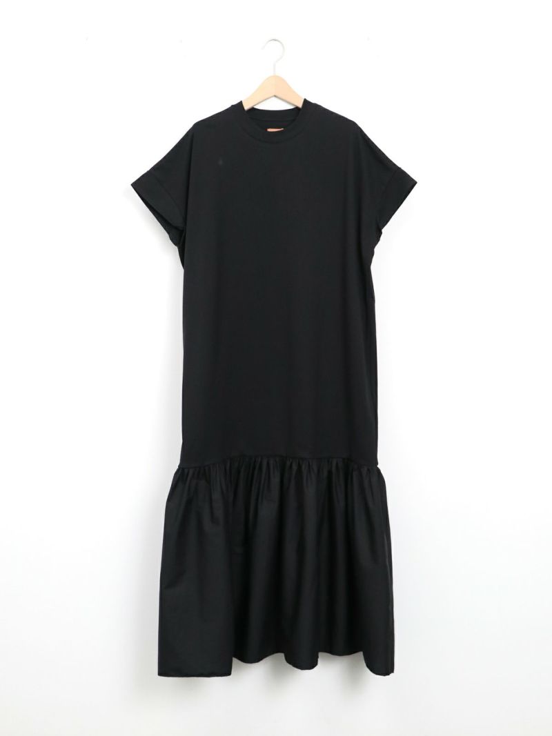 身頃はやや光沢感がある滑らかな肌触りのカットソー生地を使用し、裾のフレア部分はブラウス生地を使用。素材の違う生地がドッキングした1枚で着映えするワンピースです。