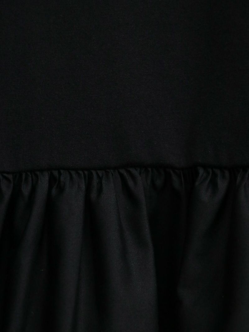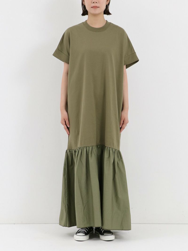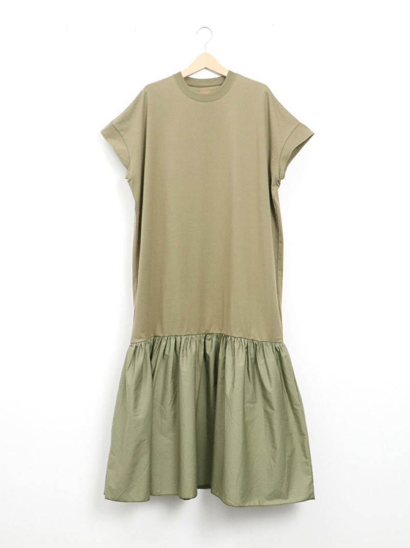 裾のフレアラインが特徴のワンピース。 身頃はやや光沢感がある滑らかな肌触りのカットソー生地を使用し、裾のフレア部分はブラウス生地を使用。素材の違う生地がドッキングした1枚で着映えするワンピースです。