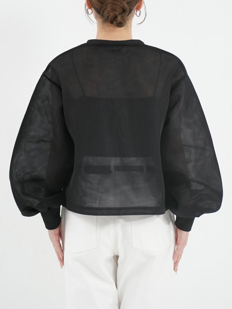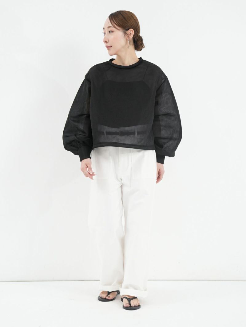 シアー感のあるダンボール素材を使ったロニースコッツ別注トップス。 シンプルな形ですが、立体感と程よい厚みで1枚でも様になります。インナーにキャミソールやカットソーなどを重ねて長いシーズン着用頂けます。