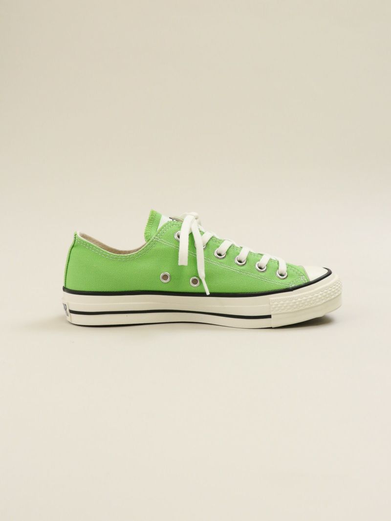 アッパーはデッドストックにありそうな発色の良いマスカットグリーン。ヒールラベルの下部に印字した「MADE IN JAPAN」の文字、日本国旗をイメージしてホワイトキャンバスに赤字で印したインソールのコンバースロゴが特別感を演出しています。国産のオリジナルカートン仕様の限定生産アイテムです。