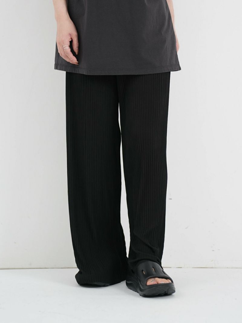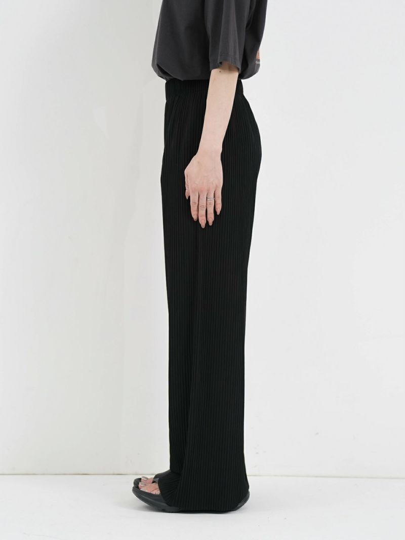 プリーツデザインのイージーパンツ。 光沢のある生地感で上品な雰囲気。 ウエストはゴム仕様、ストレッチの効いた生地でラクな着心地です。ゆったりめなTシャツやシャツと合わせた大人カジュアルスタイルにもおすすめです。