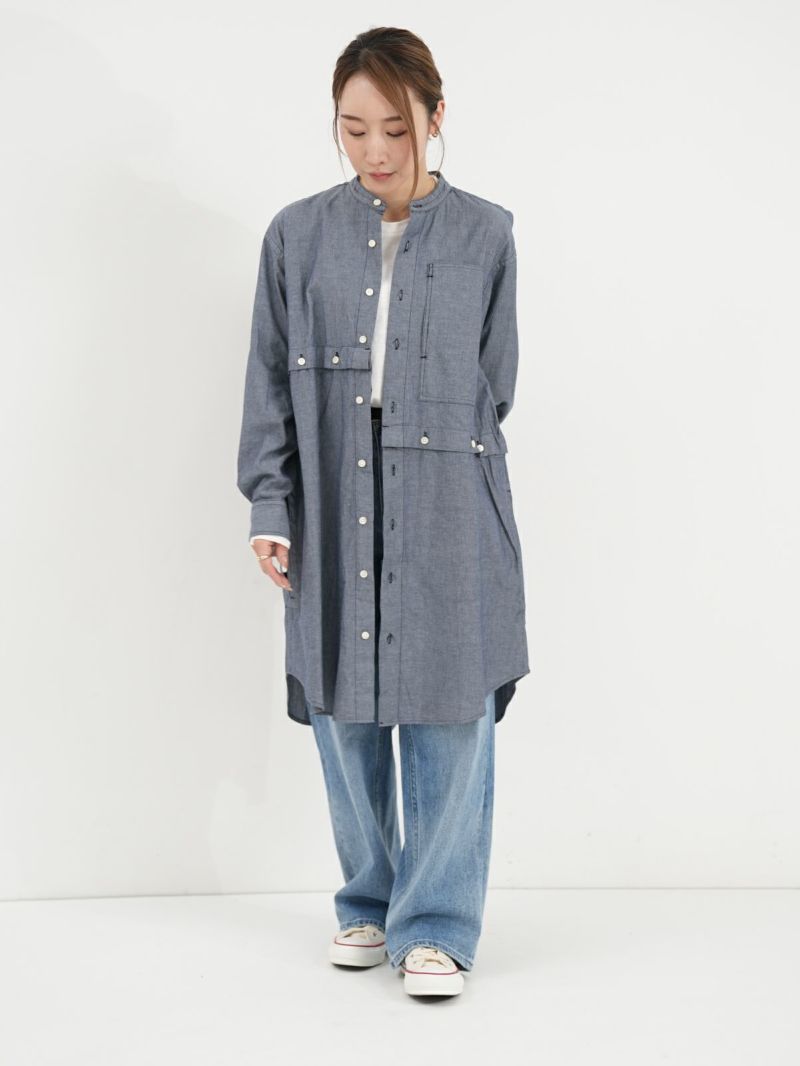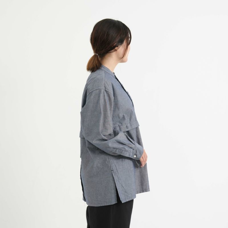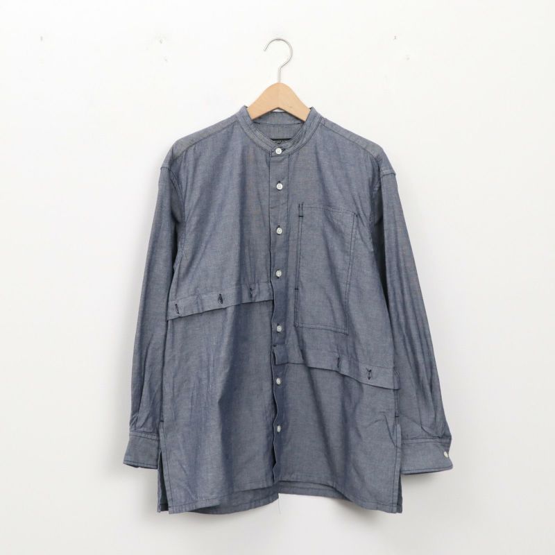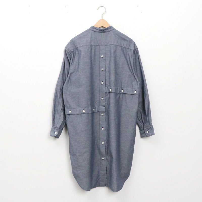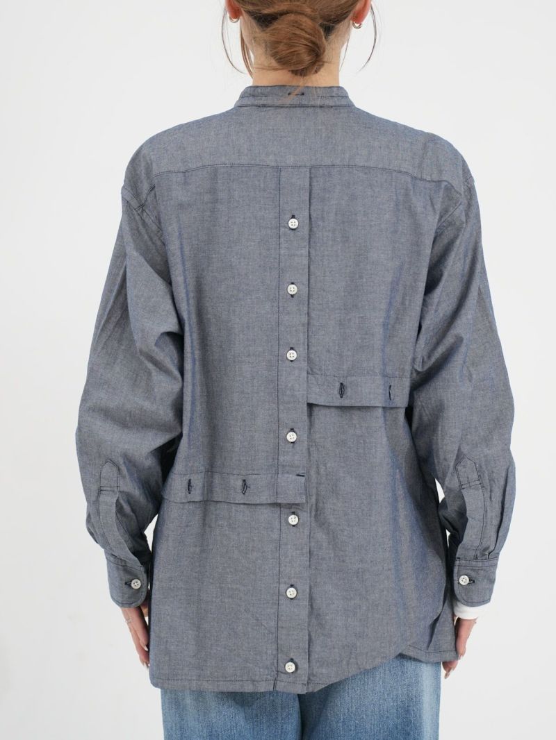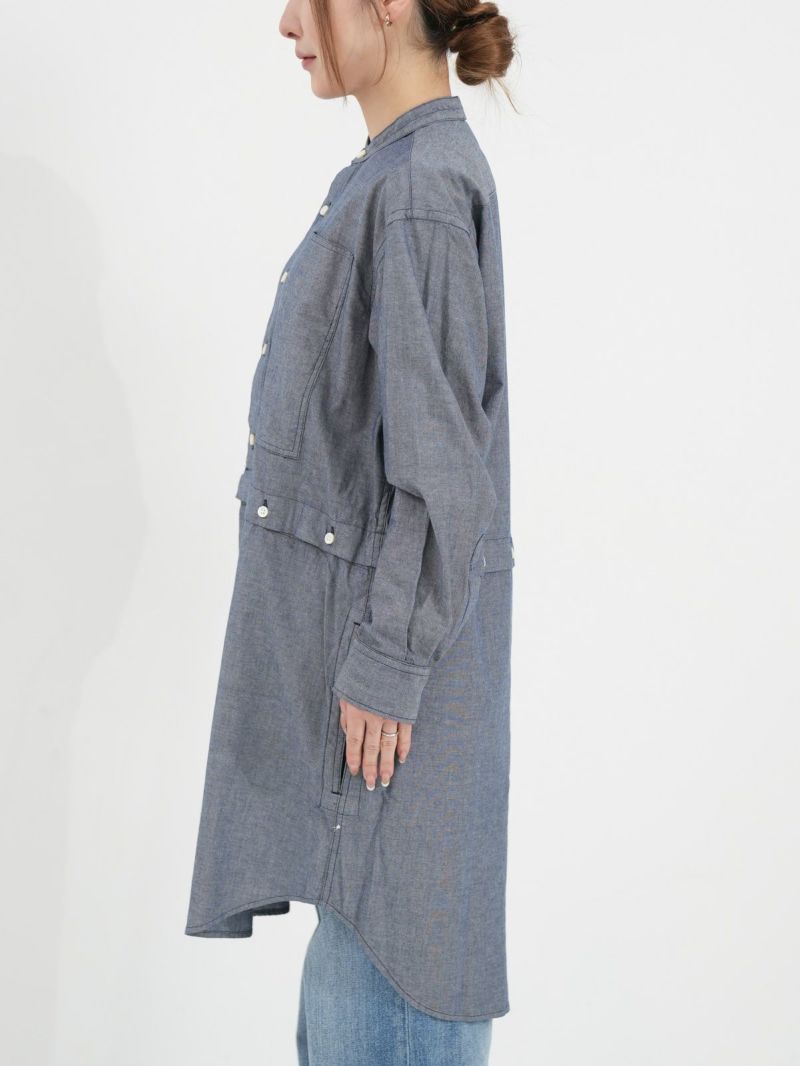 インディゴカラーのバンドカラーシャツ。 着丈が変形する仕様になっており、通常時がロング丈、横部分のボタンを外すことでシャツの着丈を短くできます。1枚ではもちろん、ジャケットやコートのインナーにも幅広いスタイリングで着用していただけます。