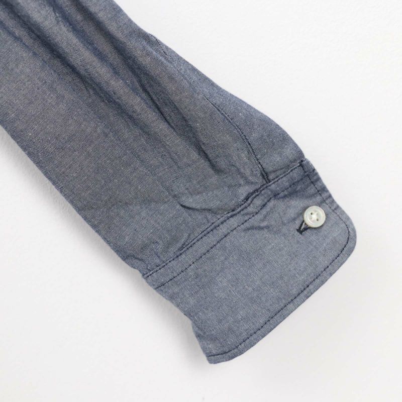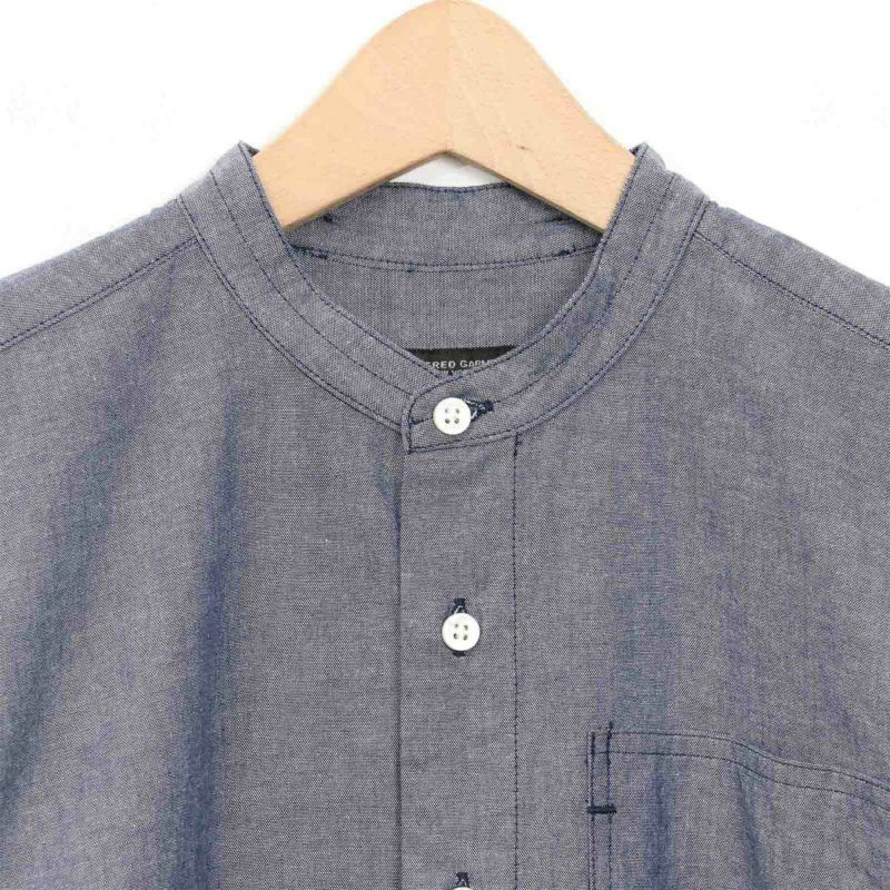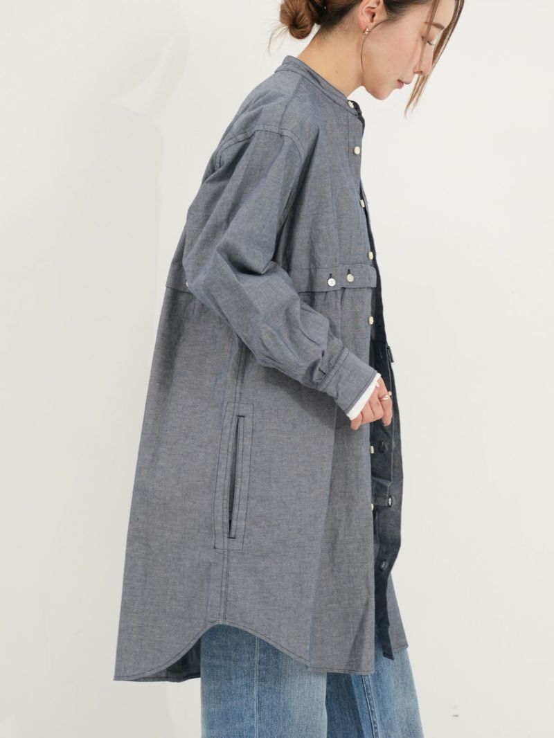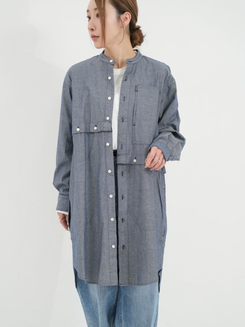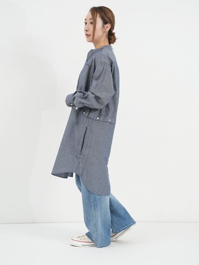 インディゴカラーのバンドカラーシャツ。 着丈が変形する仕様になっており、通常時がロング丈、横部分のボタンを外すことでシャツの着丈を短くできます。1枚ではもちろん、ジャケットやコートのインナーにも幅広いスタイリングで着用していただけます。