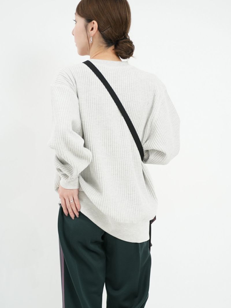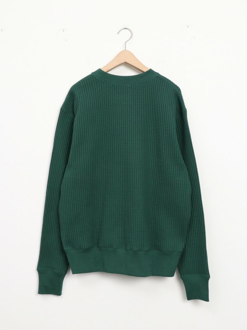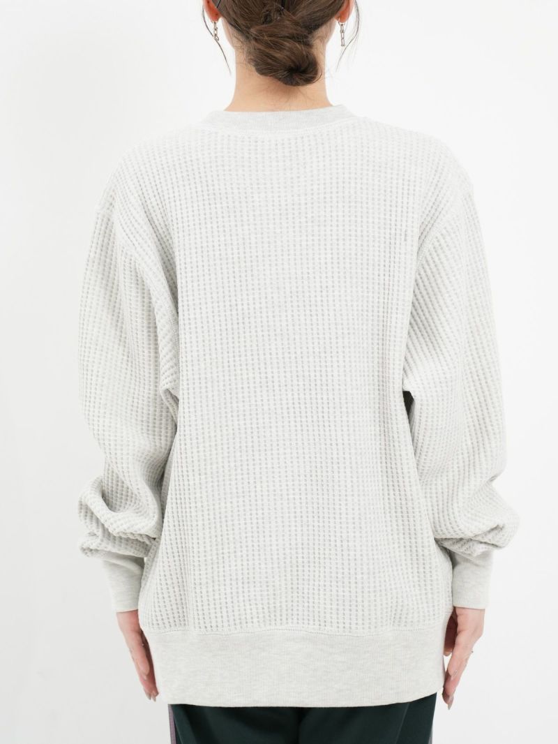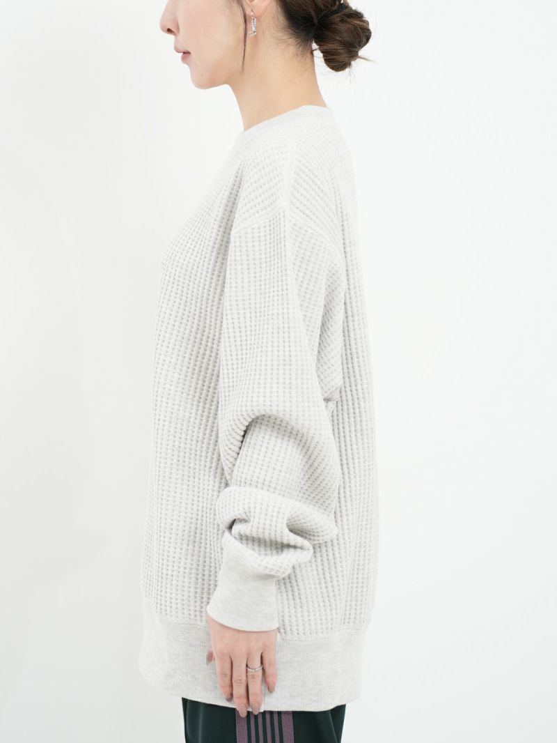JEMORGANを代表するビッグワッフル素材のNEW ITEM。 ヘビーウェイトなワッフルを使用したクルーネックで、スウェットのように気軽に1枚でも、ニットのようにシャツと合わせて綺麗めな着こなしなど、幅広くお使いいただけます。混紡生地を使用し、コットン100%に比べて型崩れしずらく、衿・裾・袖口はリブ仕様で防寒性にも優れたしっかりとした仕上がり。